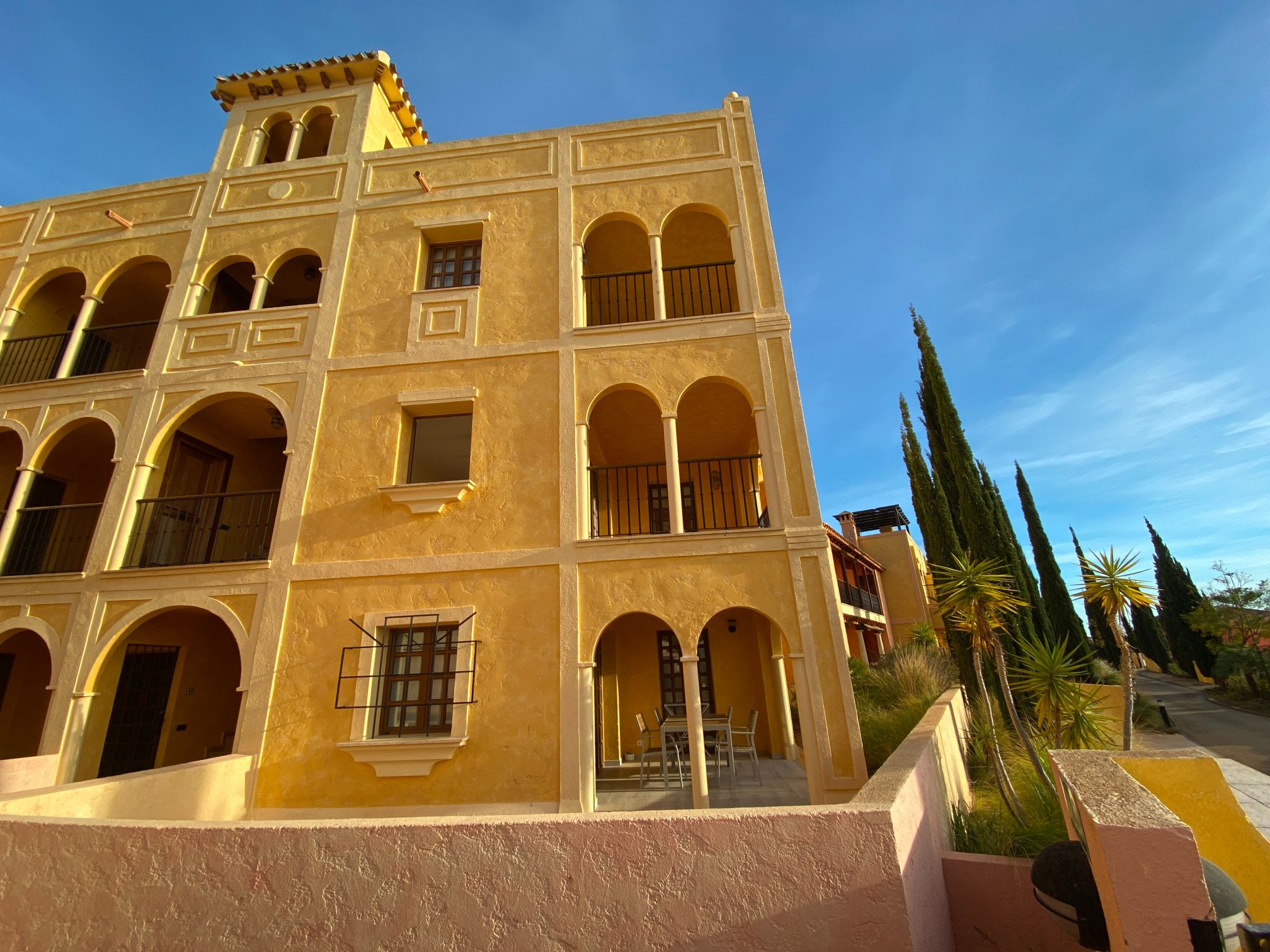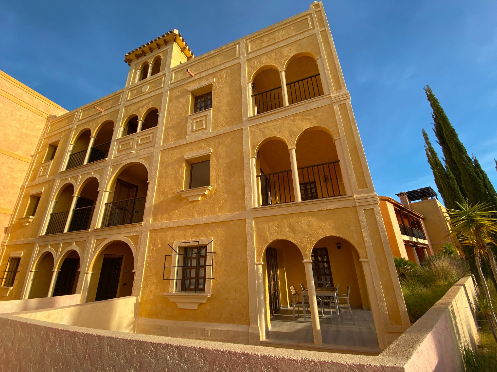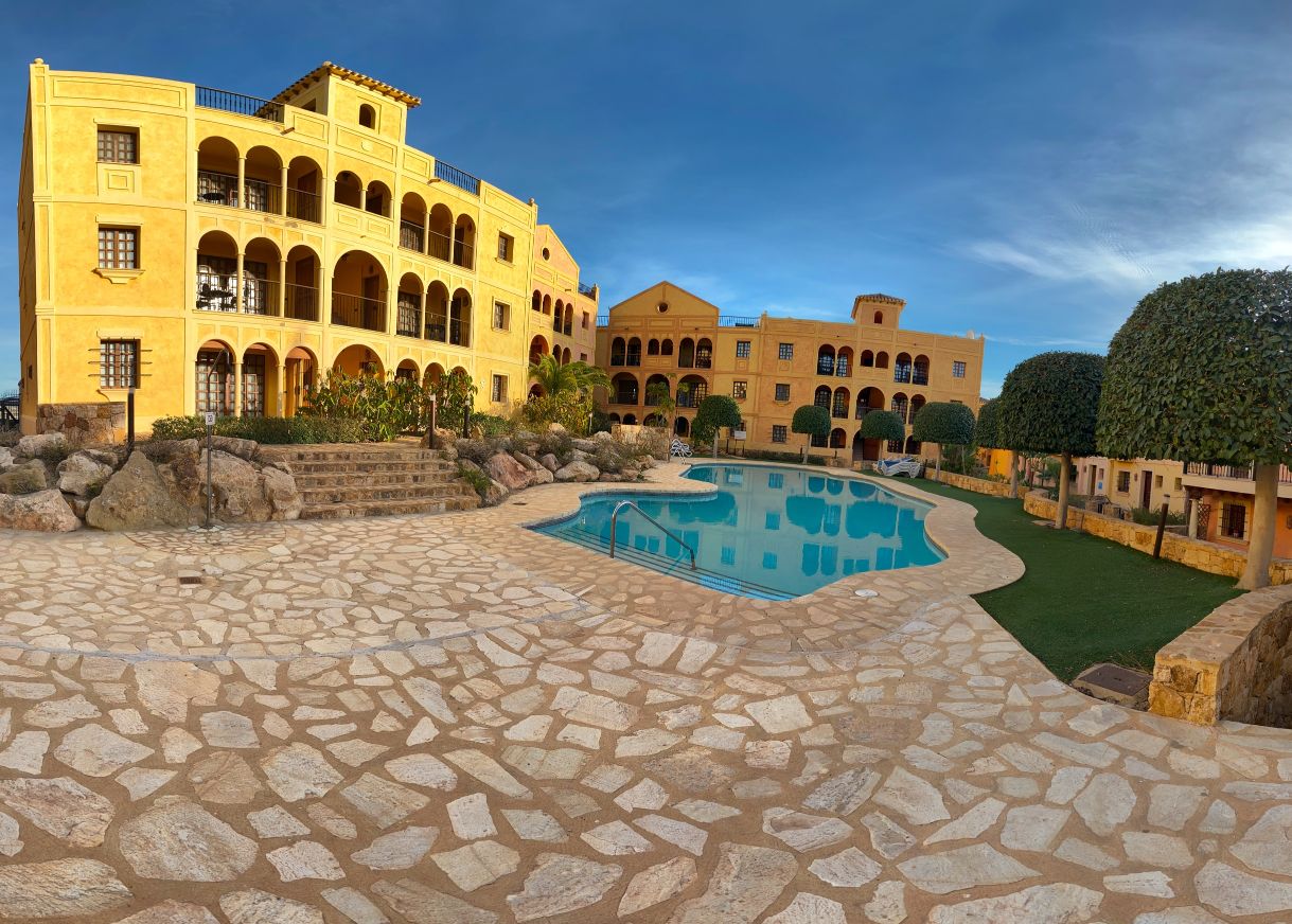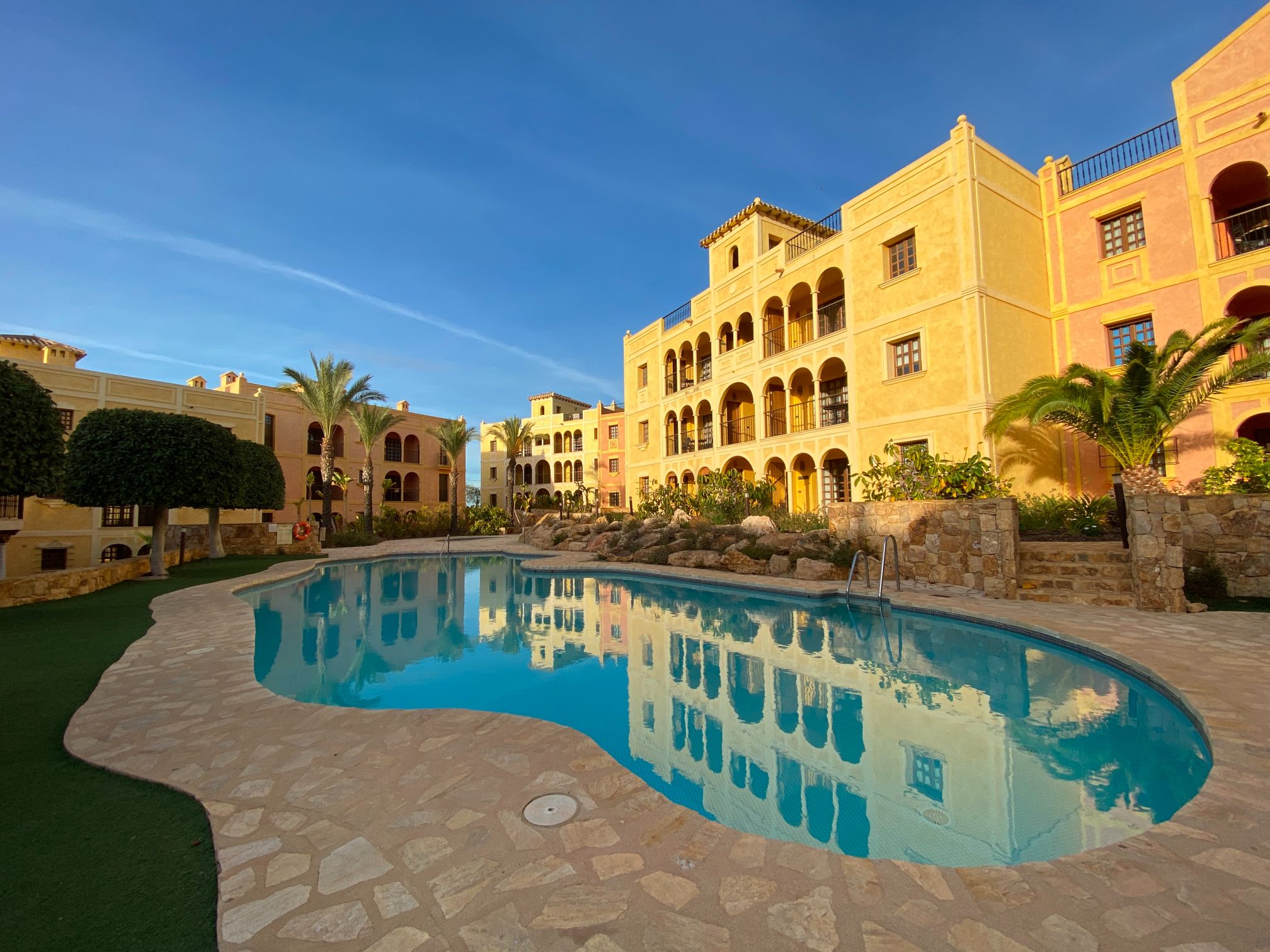 The apartment is set within a courtyard around a swimming pool, with gardens and classical Spanish patios, occupying an envious position on the resort of Desert Springs. Their location gives them tremendous views of the golf course, the sea, and surrounding mountain ranges and is within easy access to all resort facilities.