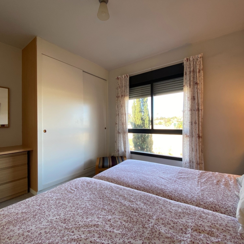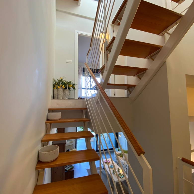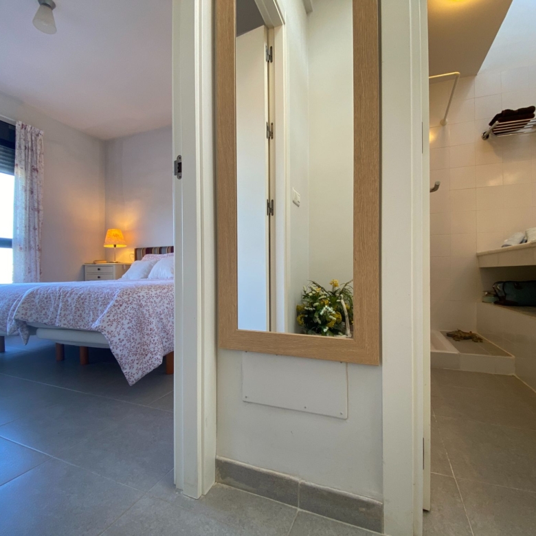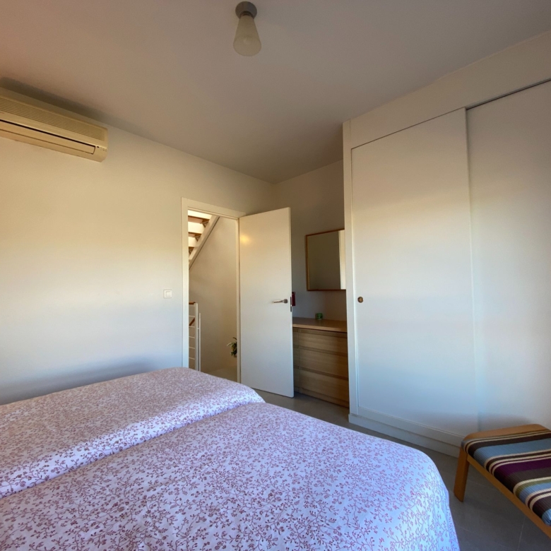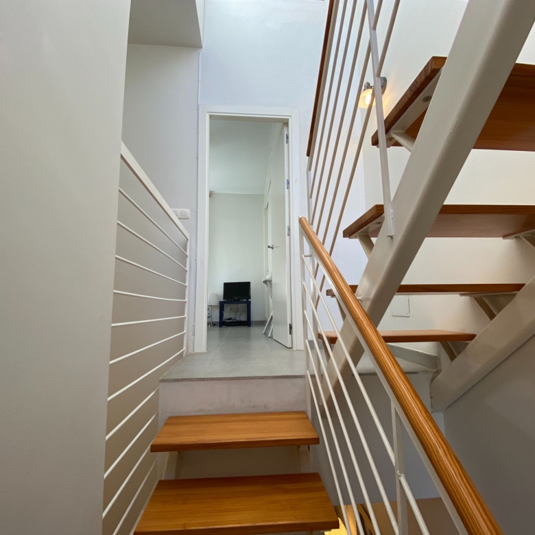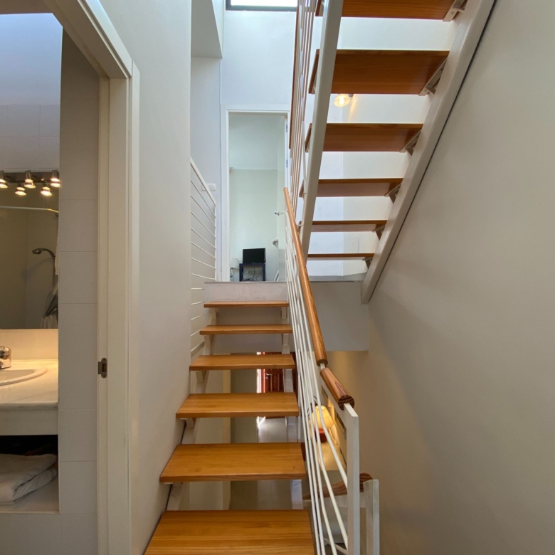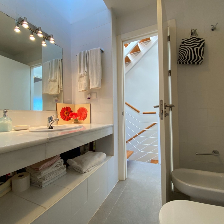 The bedrooms that are located upstairs and which is accessed through a very minimalist staircase with a partition to the air and a wooden step, both rooms have their windows to the outside of the residential and are spacious, they share the main bathroom with a shower tray and very wide marble countertop.