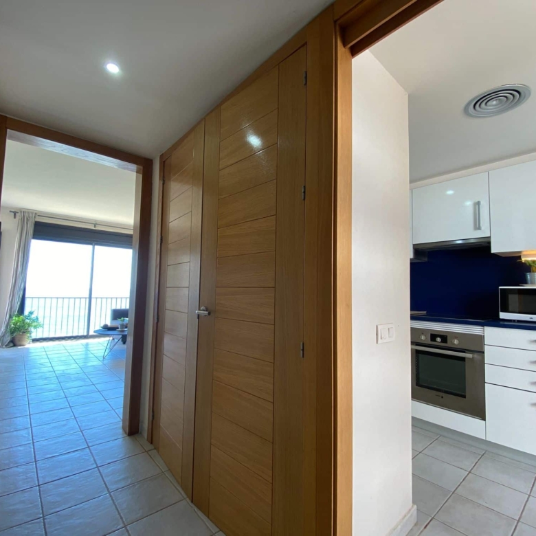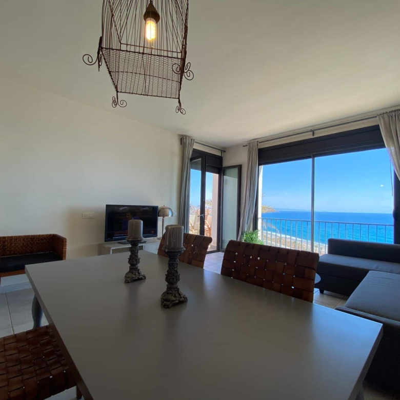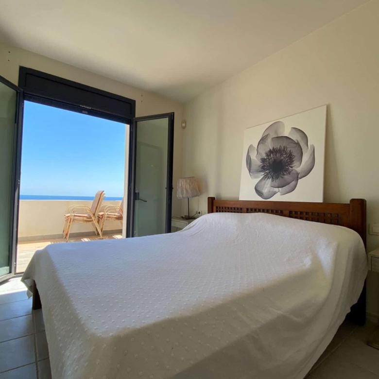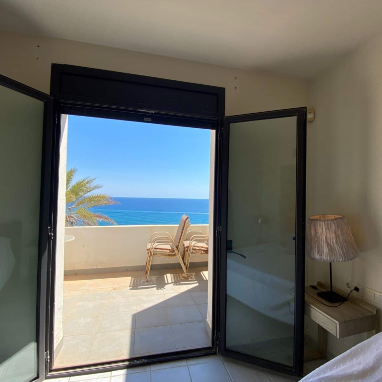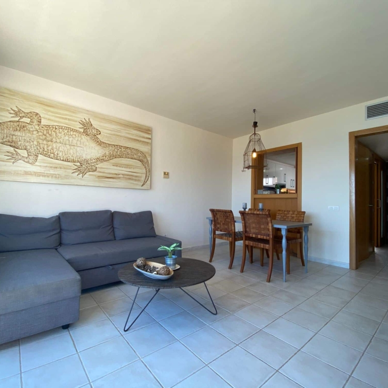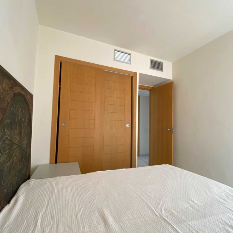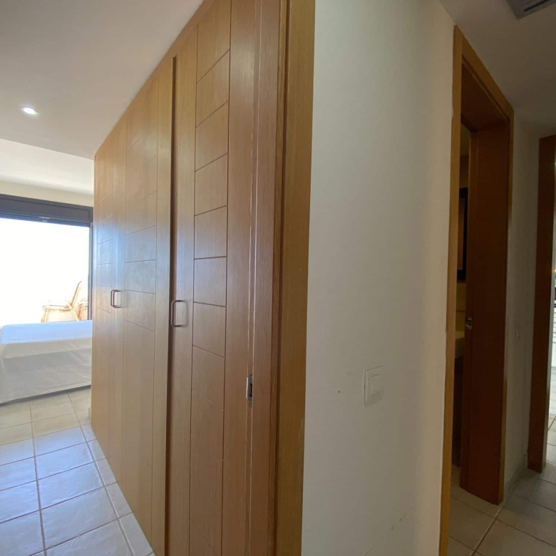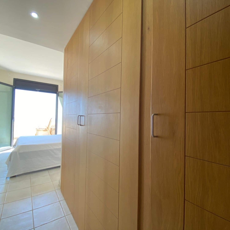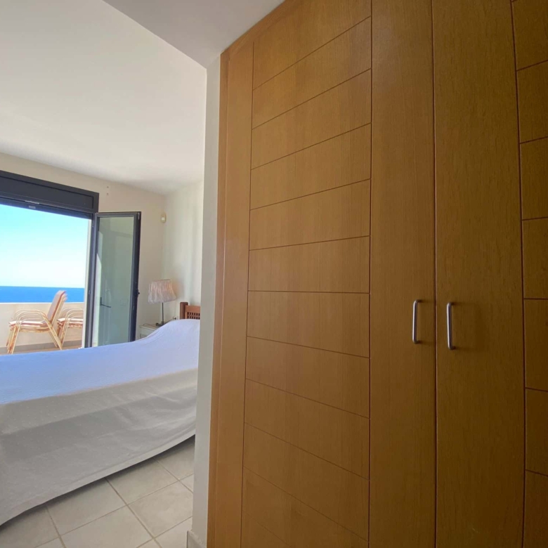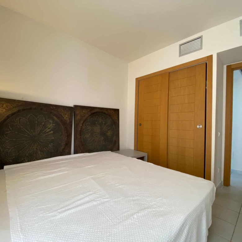 Located on the Playa Macenas Beach Resort, this is a fabulous, air-conditioned, 2 bedroom, 2 bathroom apartment with wonderful sea views. The Lounge and dining room are well proportioned. The lounge has a sofa coffee table and 45″ Flat Screen TV (UK & Spanish channels). The dining area has a dining table with 4 chairs and a dresser. Patio doors from the lounge to the terrace. Terrace furniture includes a round table and 4 chairs – an ideal place for breakfast, lunch, and dinner!