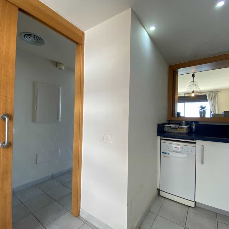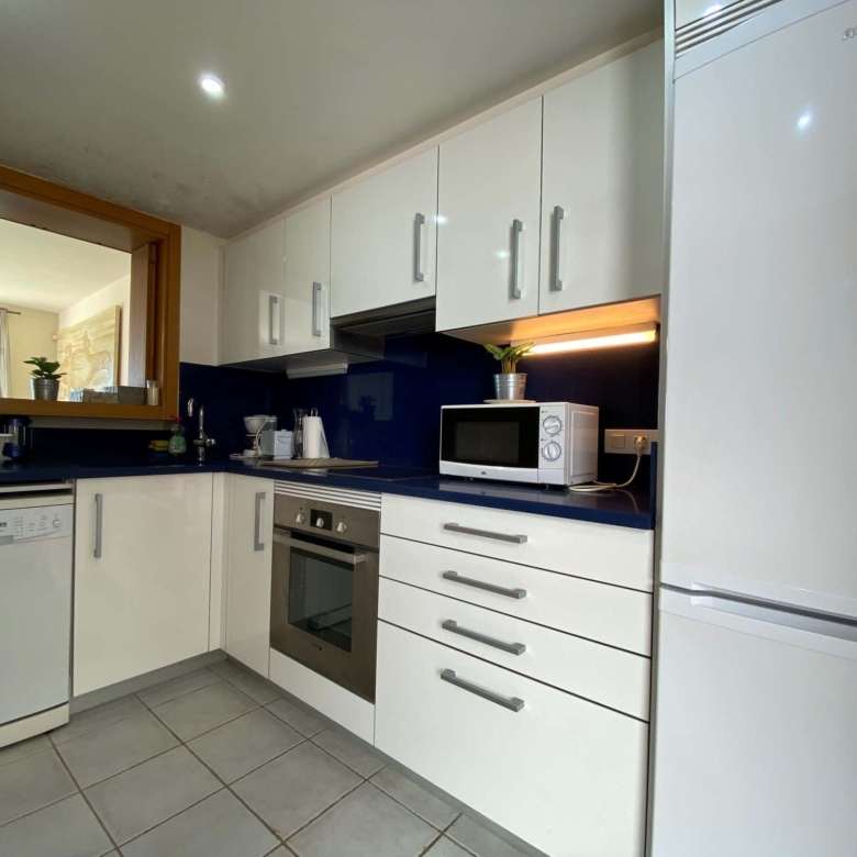The master double bedroom is en-suite with bath, shower, bidet, w/c, and washbasin and has access to a terrace via patio doors. The second bedroom is also a double, next to the second bathroom which has a shower, w/c, and washbasin. The kitchen is fully fitted with an oven and hob, dishwasher, fridge freezer, and microwave. There is a separate utility room with a washing machine, ironing board, etc.