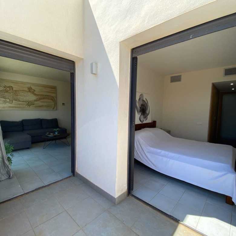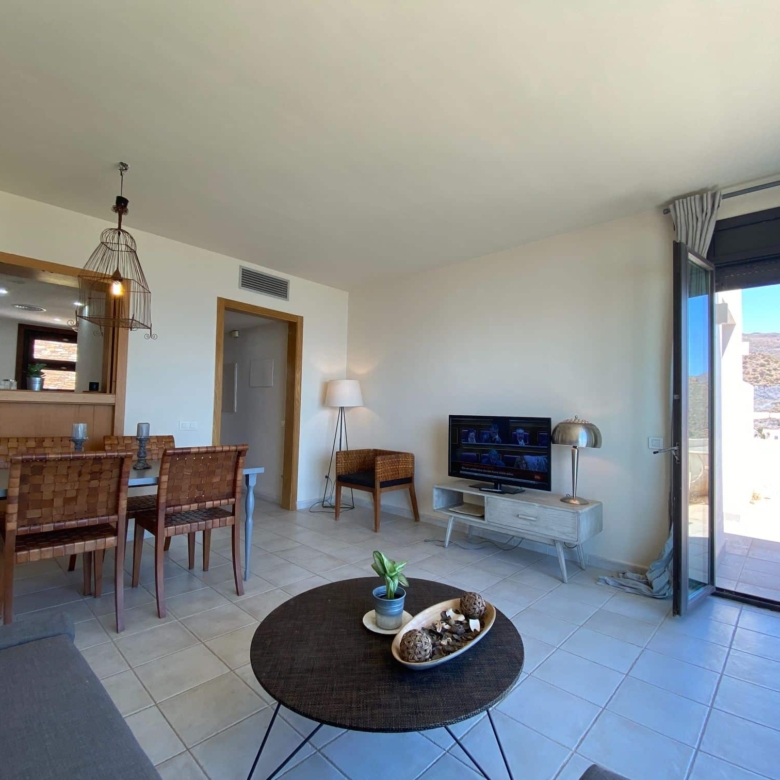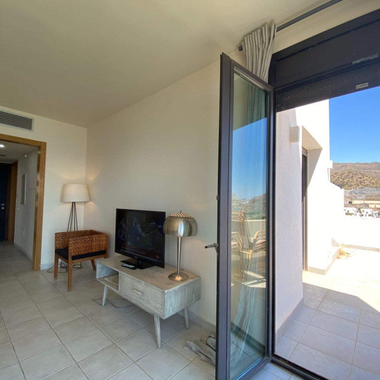 The terrace areas have sea and mountain views. Terrace furniture includes a table and 6 chairs. There are 2 swimming pools within 3 minutes walk of the apartment with one 40 yards away which can be seen down from the terrace area in the apartment. The pools are shared and are not heated. The resort is built around the Playa Macenas Golf course.