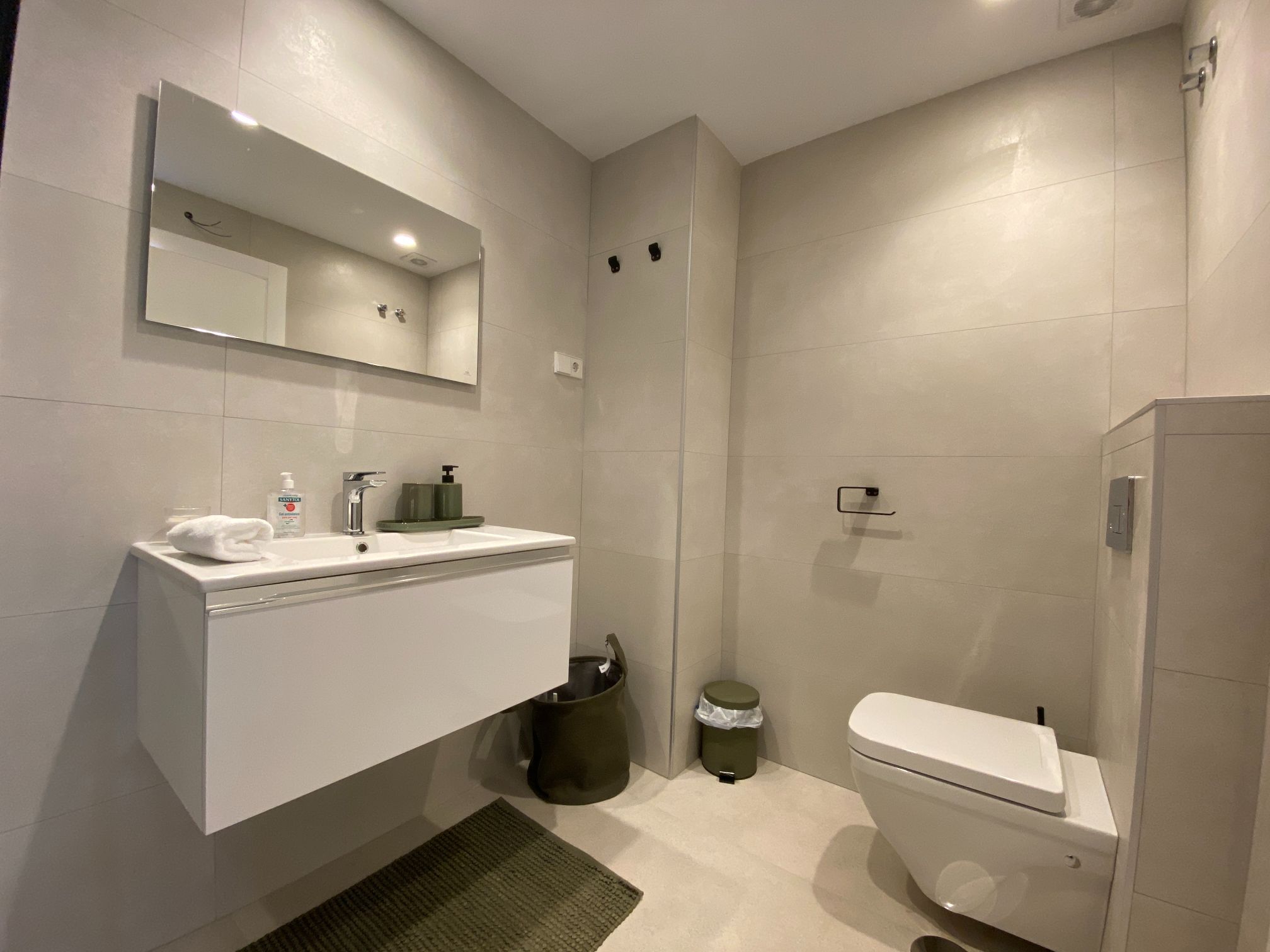 High-quality bathroom fittings including suspended toilets, thermostatic taps and high-quality ceramic wall tiling.