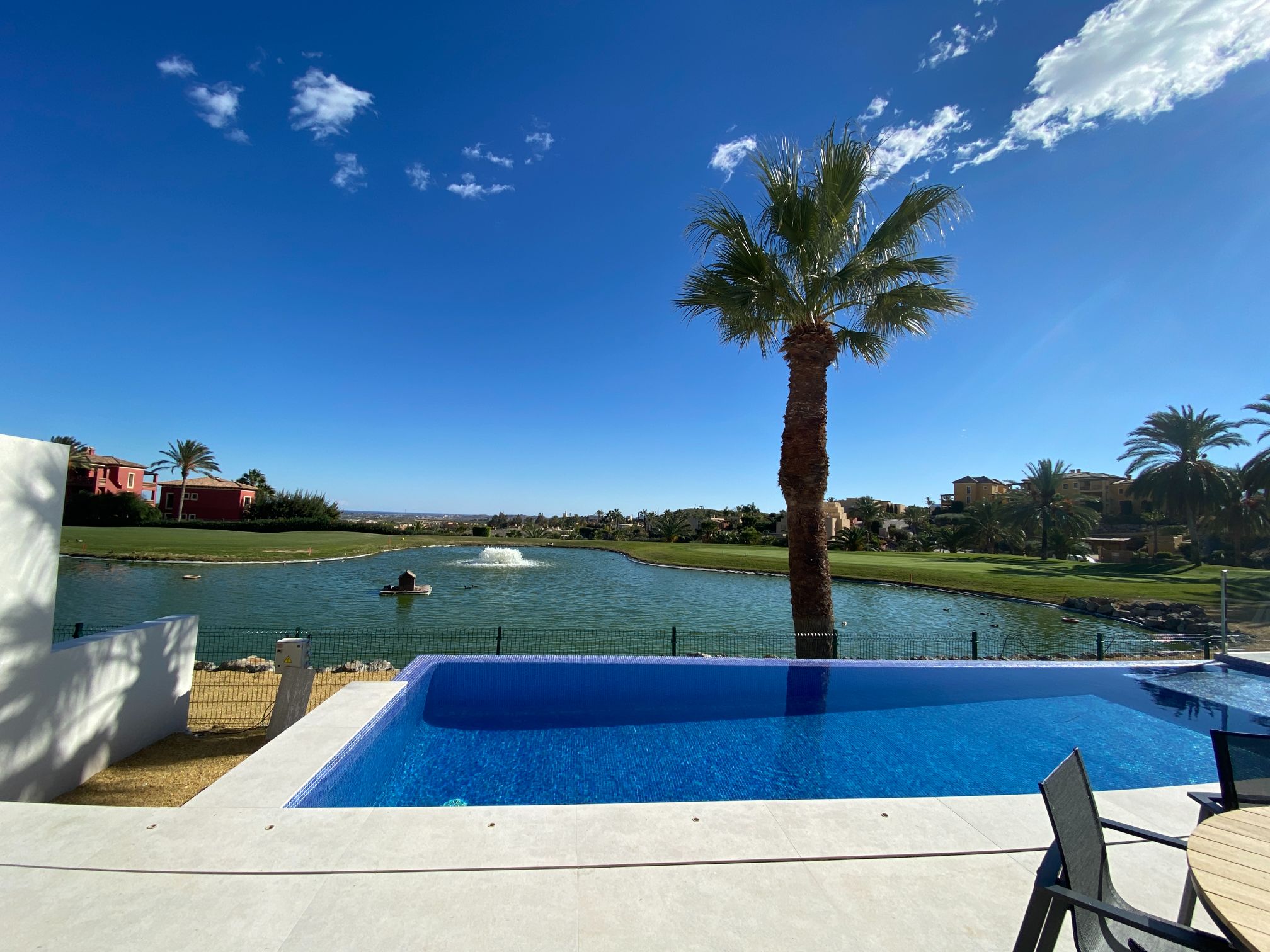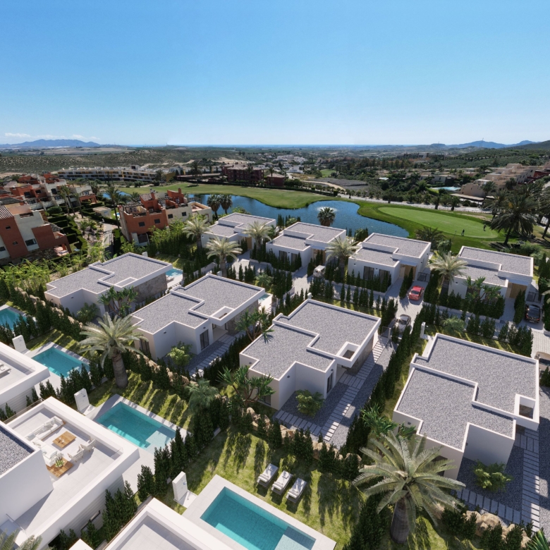 Just 6 plots of the 16 available on this development are available with the option of choosing from three different villa designs, a single storey 3 bed 2 bath which is front line to the lake and 5th fairway, single storey 2 bed 2 baths with optional roof solarium or elevated 3 bed 2 bath two storeys, all with private walled and gated plot with off-road parking, private swimming pools of 8 x 3 which can be upgraded to 10 x 3 if desired and private gardens. There is also the option to add a basement if required.