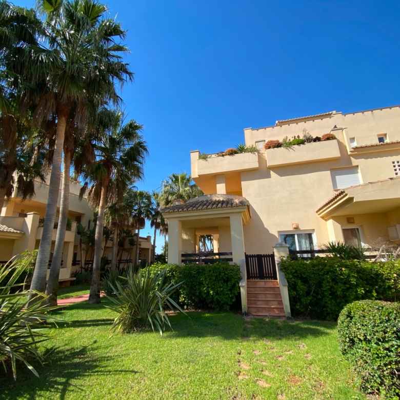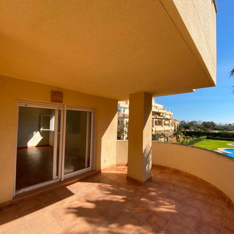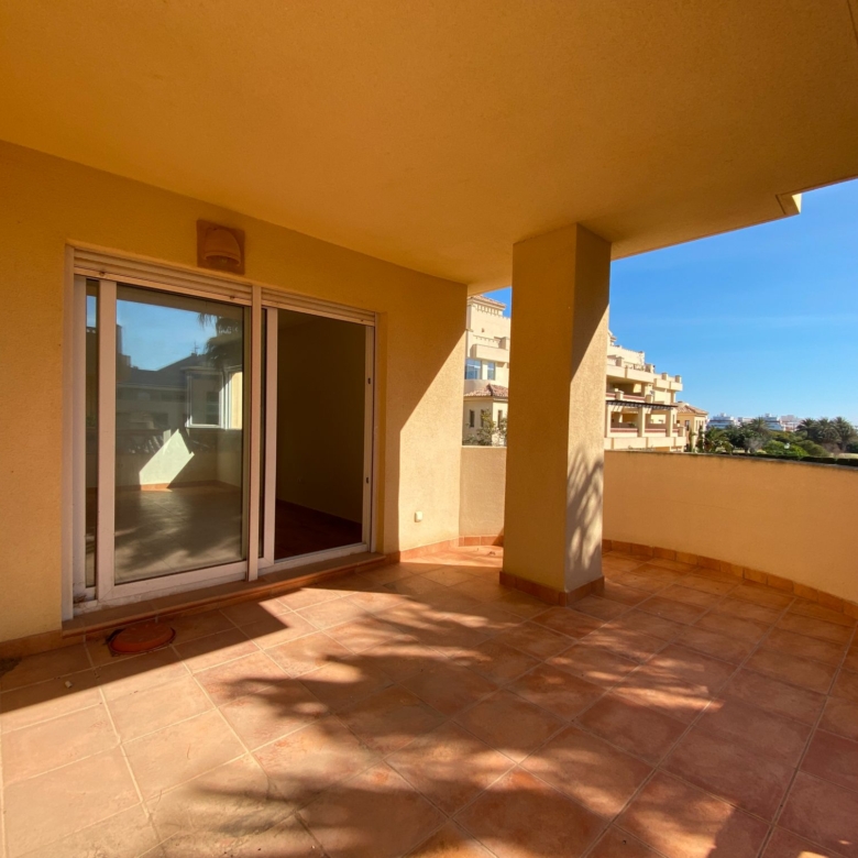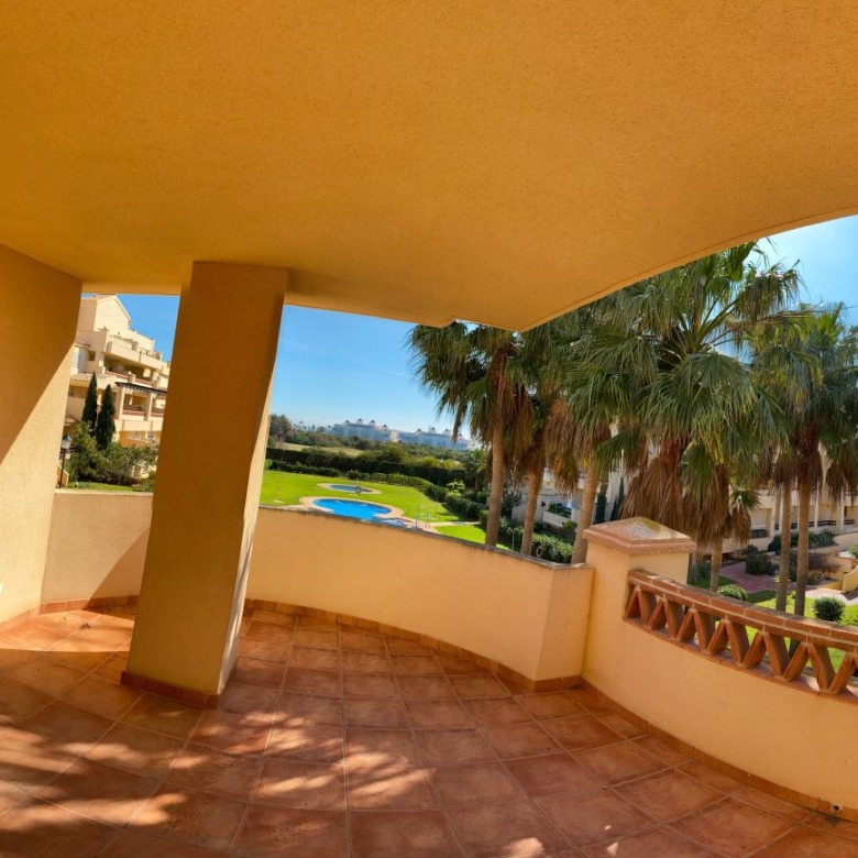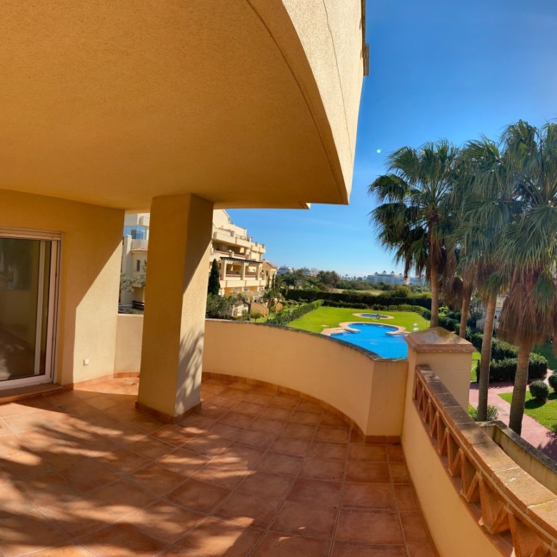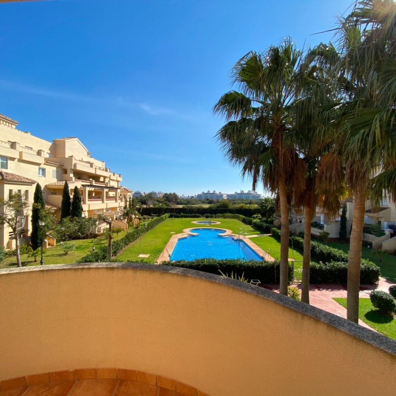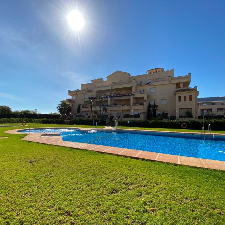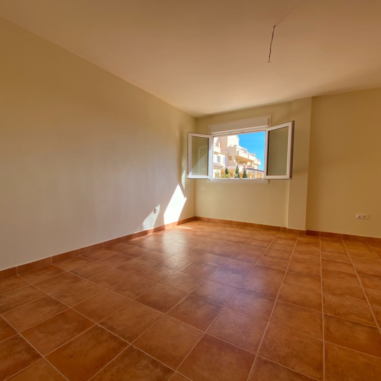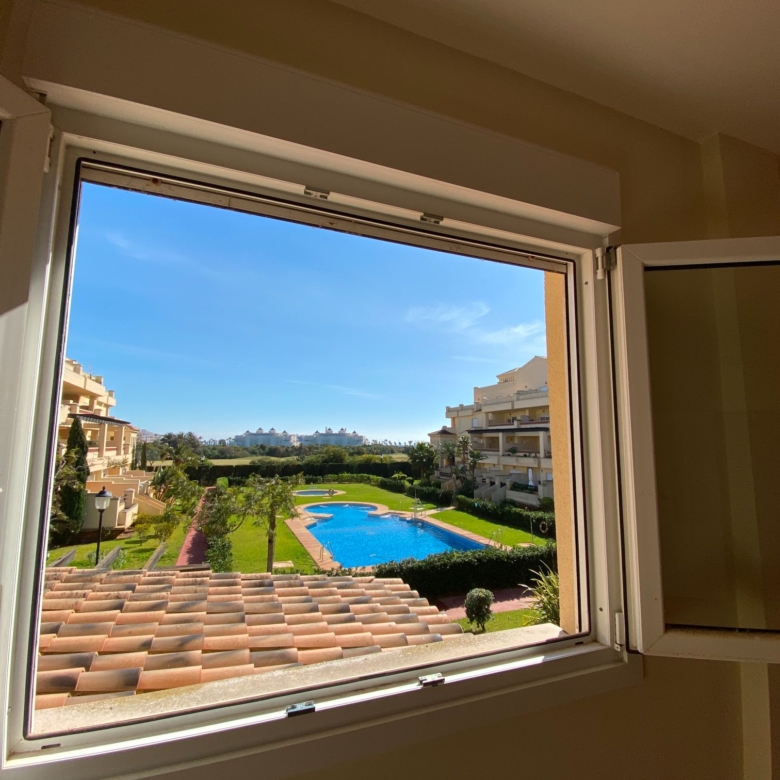 It has an area of 103.88 m², on the first floor south facing which is distributed in two bedrooms, two bathrooms, living room, kitchen and a large terrace. It is located in a beautiful residential area with a garden where you can walk around and enjoy the park, large and small swimming pools and paddle tennis courts. Sea View and Snowy Mountains View