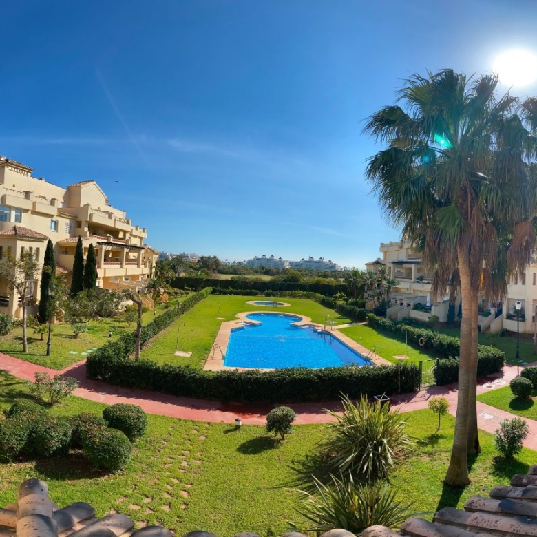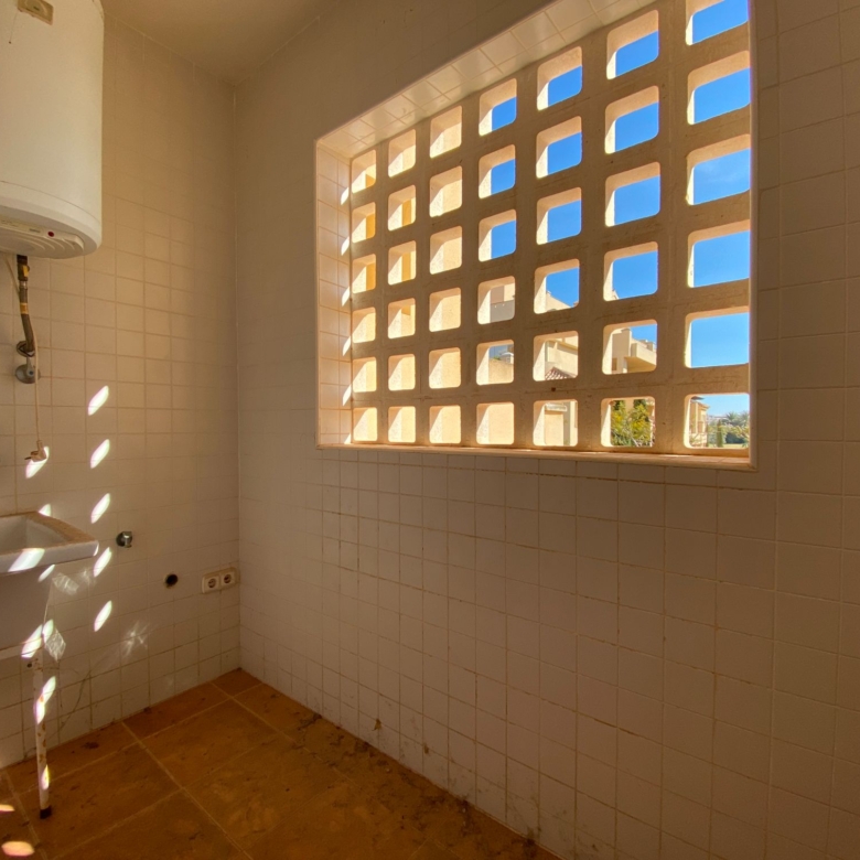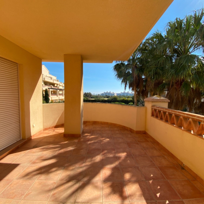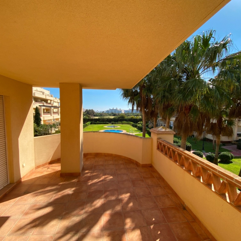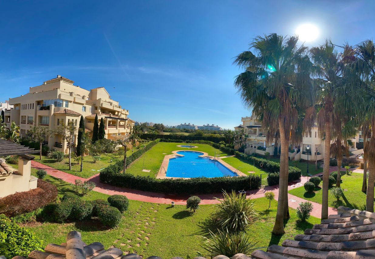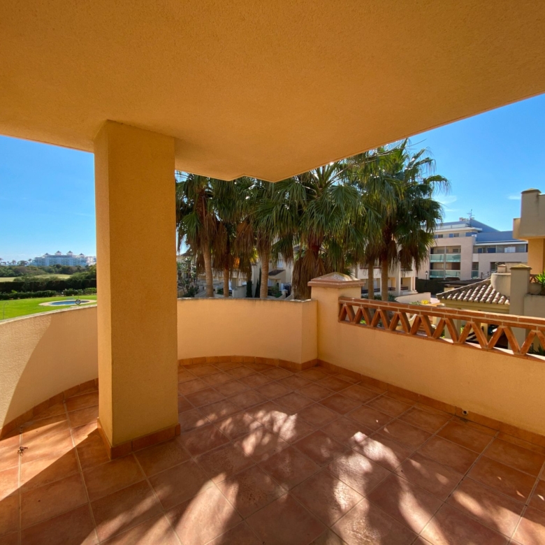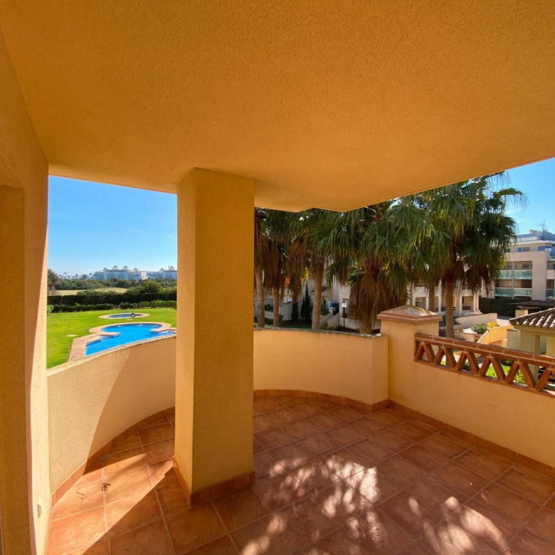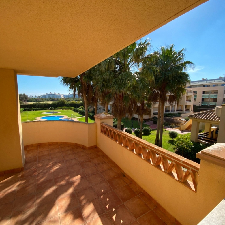 It has an area of 103.88 m², on the first floor south facing which is distributed in two bedrooms, two bathrooms, living room, kitchen and a large terrace. It is located in a beautiful residential area with a garden where you can walk around and enjoy the park, large and small swimming pools and paddle tennis courts. Sea View and Snowy Mountains View