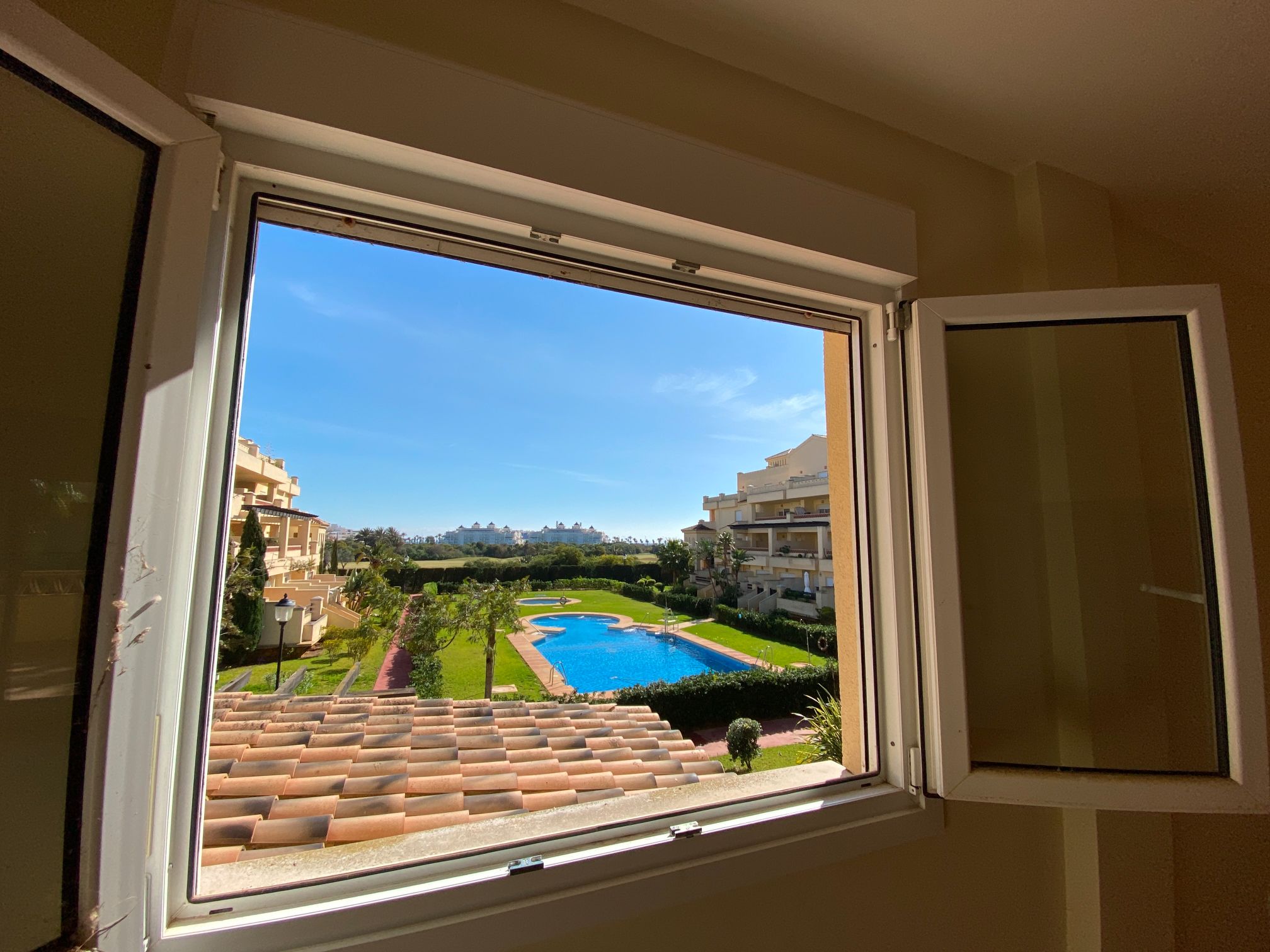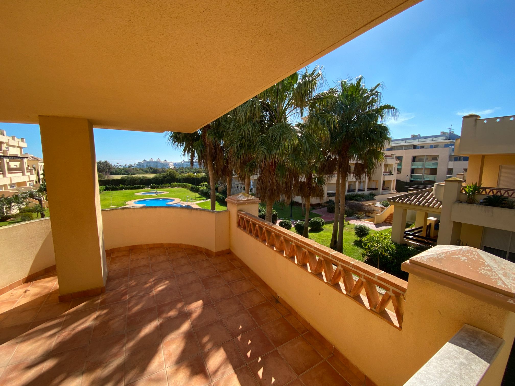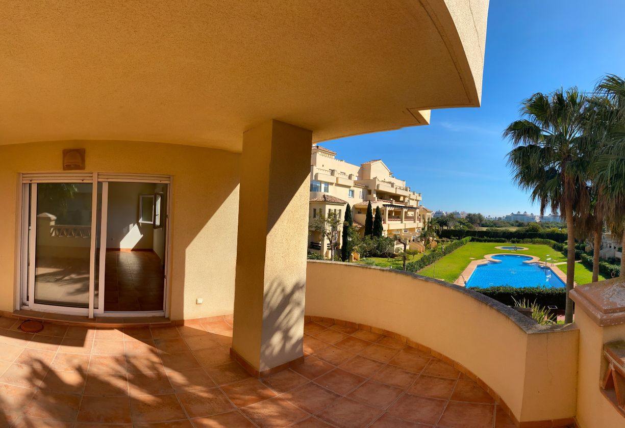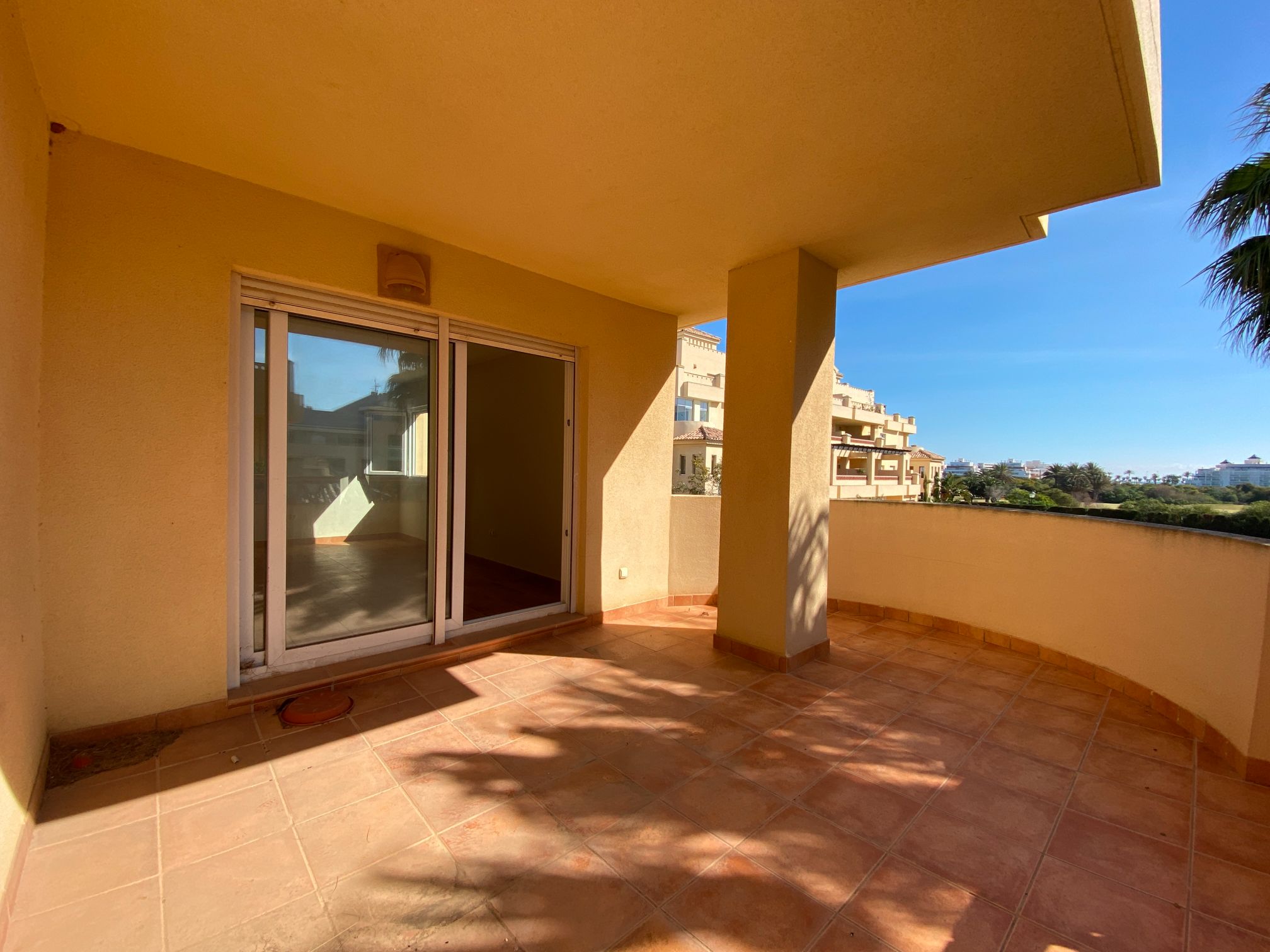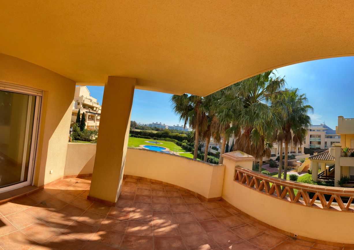 It has an area of 103.88 m², on the first floor south facing which is distributed in two bedrooms, two bathrooms, living room, kitchen and a large terrace. It is located in a beautiful residential area with a garden where you can walk around and enjoy the park, large and small swimming pools and paddle tennis courts. Sea View and Snowy Mountains View