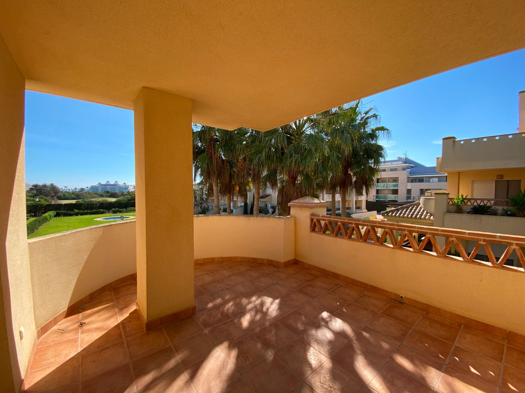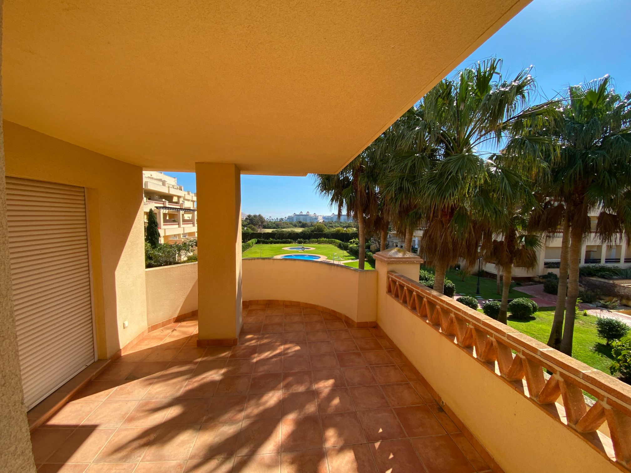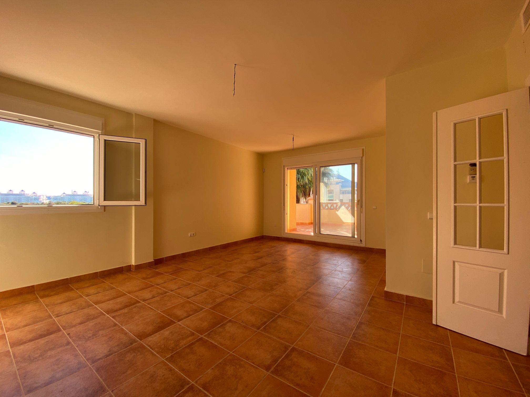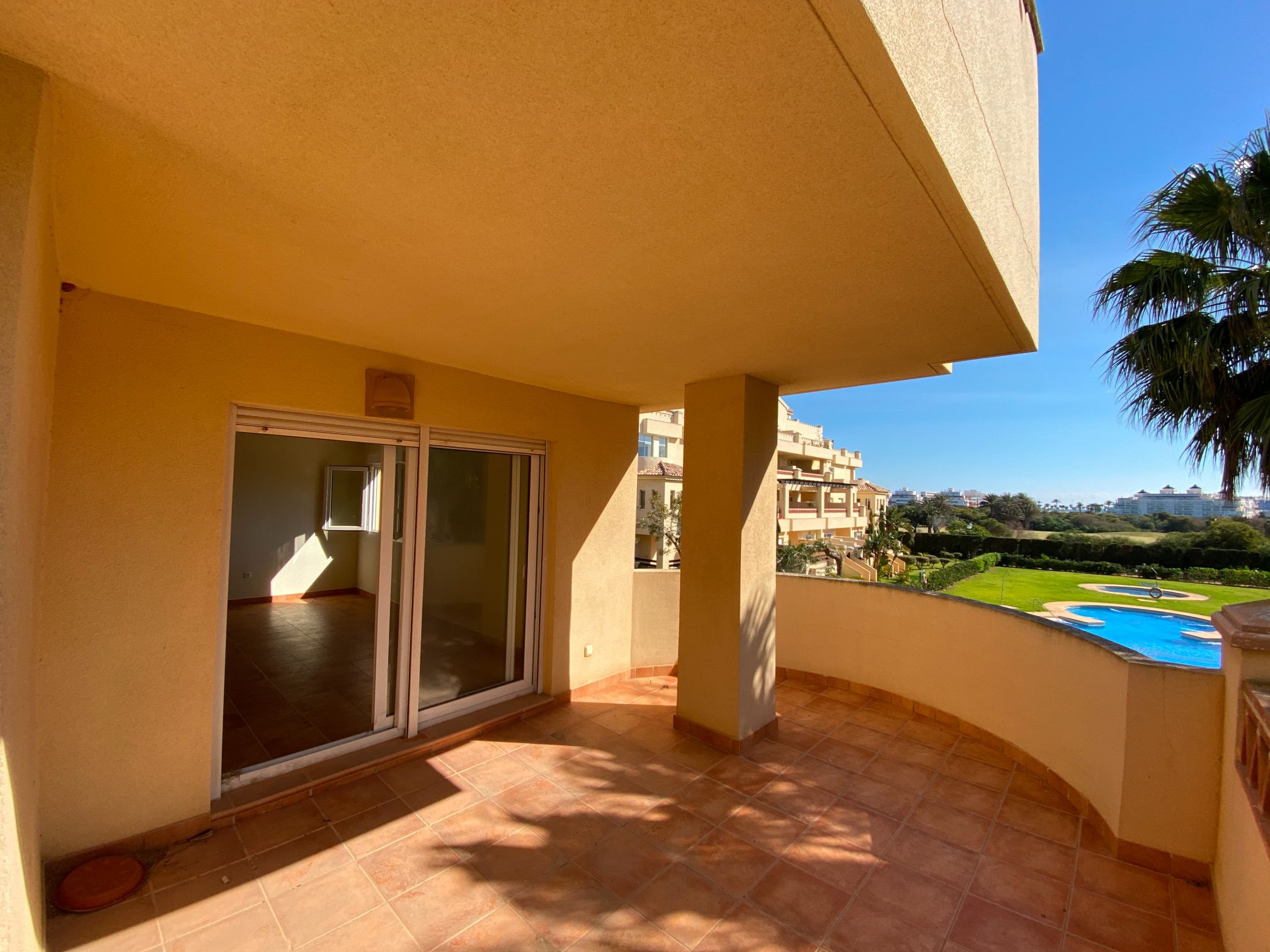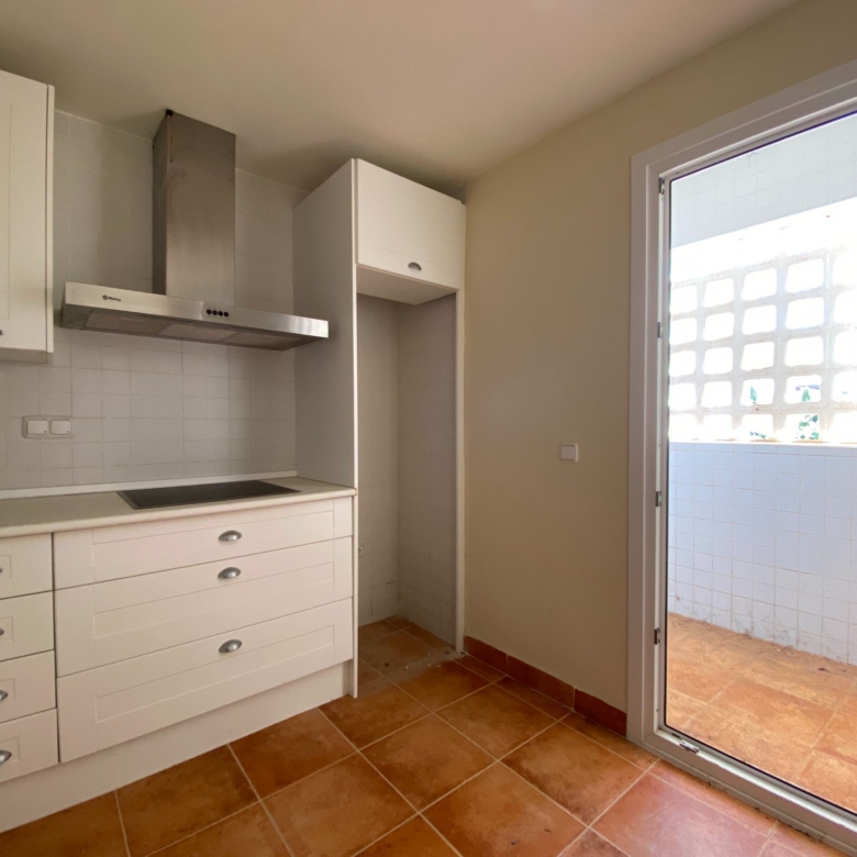 It has an area of 103.88 m², on the first floor south facing which is distributed in two bedrooms, two bathrooms, living room, kitchen and a large terrace. It is located in a beautiful residential area with a garden where you can walk around and enjoy the park, large and small swimming pools and paddle tennis courts. Sea View and Snowy Mountains View