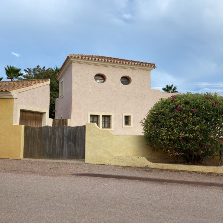 The spacious internal reception area opens out, with a ‘level through’ floor, onto the covered verandas to offer over 93m2 of combined interior/exterior living and dining space, designed to be used as one in this specially privileged climate. A stone-built fireplace internally and a built-in barbecue externally are provided. The master bedroom has an extensive private roof terrace with great views and a separate dressing and bathroom.
