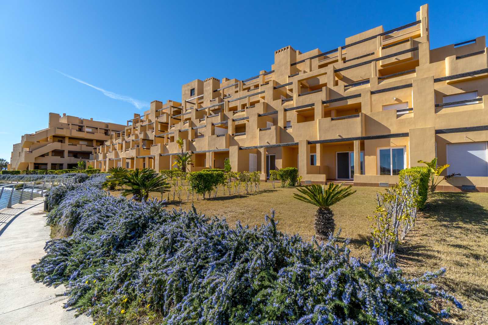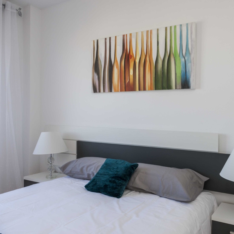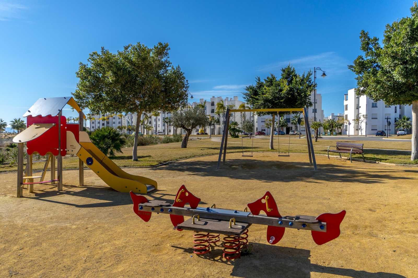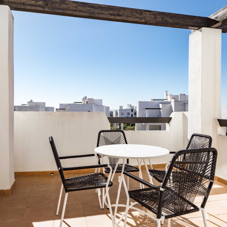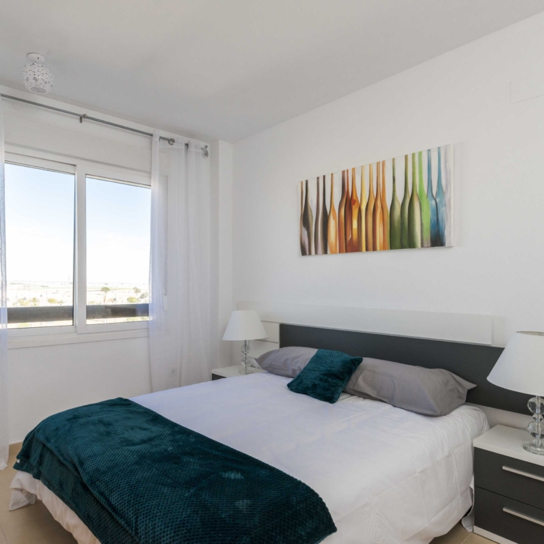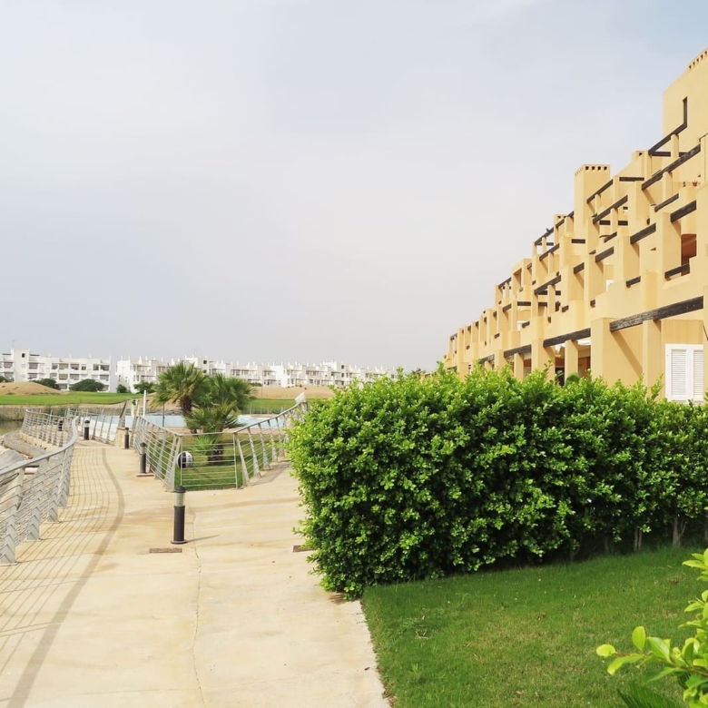 This complex offers different types of properties designed to suit all tastes: Mediterranean design apartments and whitewashed 1, 2 and 3 bedroom walls, which stand out for their fantastic frontline golf location around large swimming pools and private gardens 2 bedroom penthouses, located in blocks of four stepped heights with wide terraces offering excellent views of the golf course and apartments with private gardens and independent access of 2 and 3 bedrooms, located on an exclusive “island” overlooking a large artificial lake and the countryside of golf and surrounded by green areas.