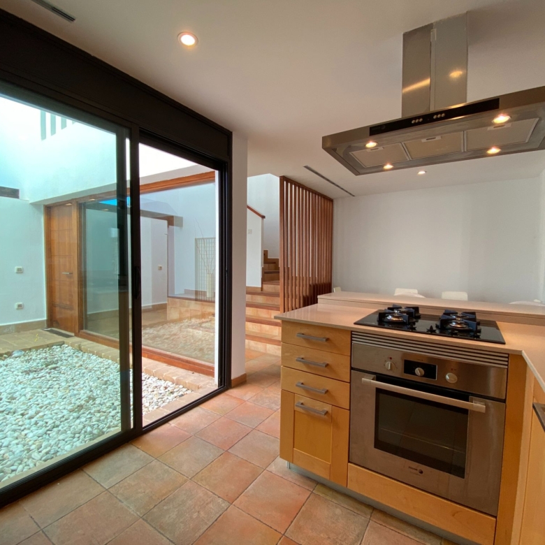 The development takes its inspiration from a typical Andalusian village street: a string of white houses amid meadows and rocks, sky and sea. Homes are set out over two floors with a southwest aspect for afternoon sun in their gardens. Individual gardens lead onto an extensive community garden with a large swimming pool as the centre point. Homes benefit from pergola-covered parking at street level, right by the front door. The living areas are spacious and are set out around a central garden, which fills the interior with sunlight.
