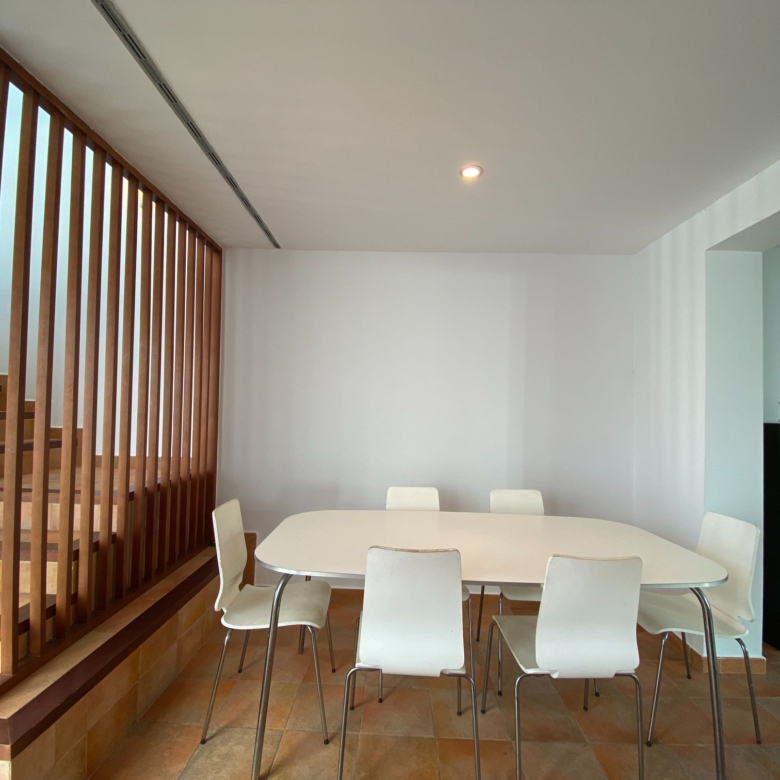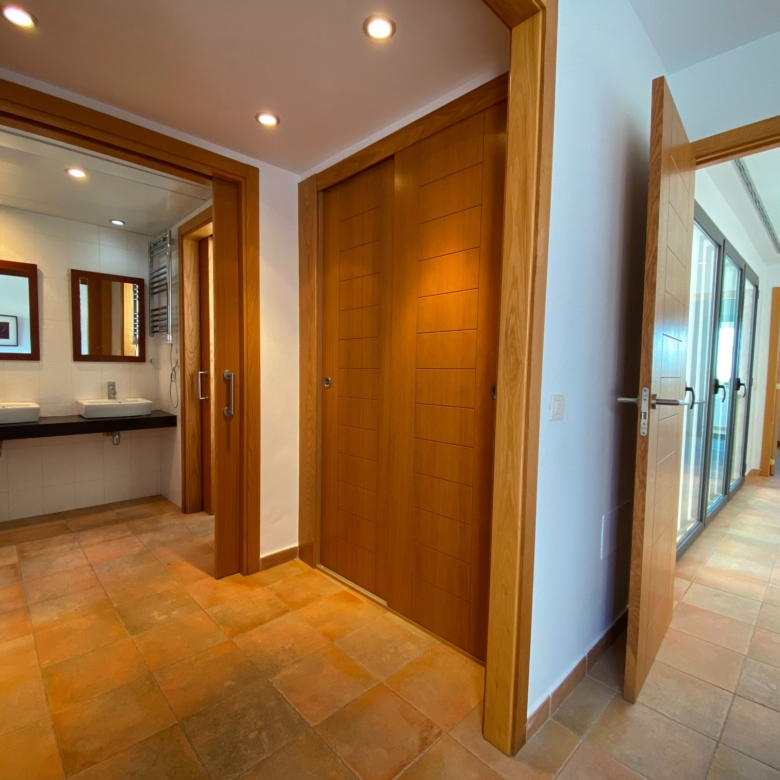 A formal dining room offers plenty of space for guests and shares a sliding wall with the kitchen. This leads to the terrace area, which makes the most of the property’s picturesque views.