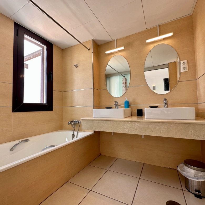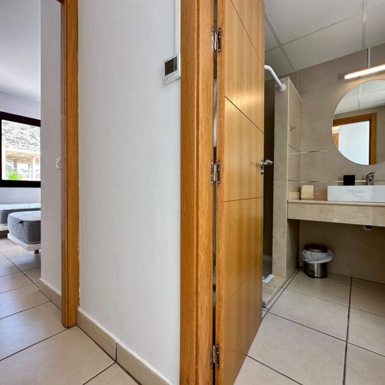 The house boasts three generously sized bedrooms, each thoughtfully designed with fitted wardrobes to accommodate all your storage needs. The master bedroom, a true retreat, features direct access to the terrace, where you can wake up to picturesque panoramic views, setting the stage for magical mornings and romantic evenings.