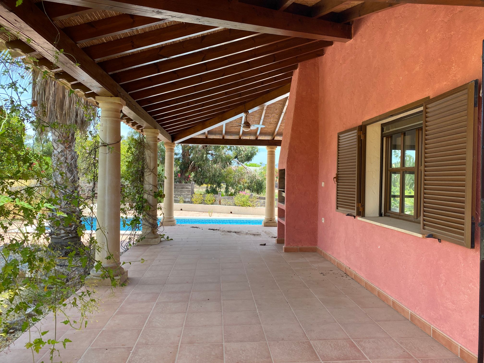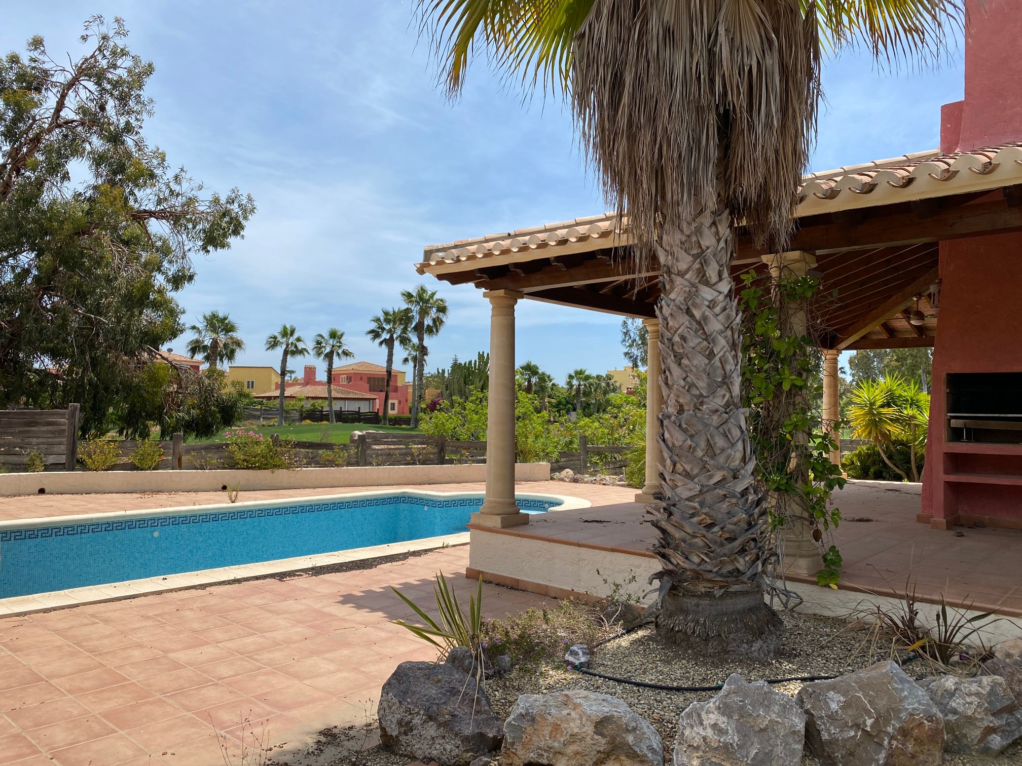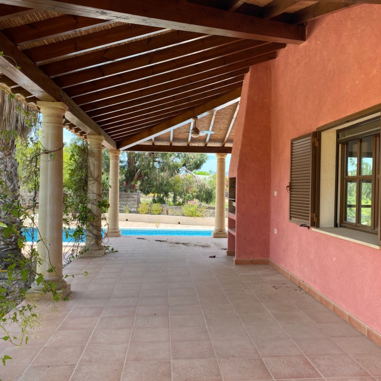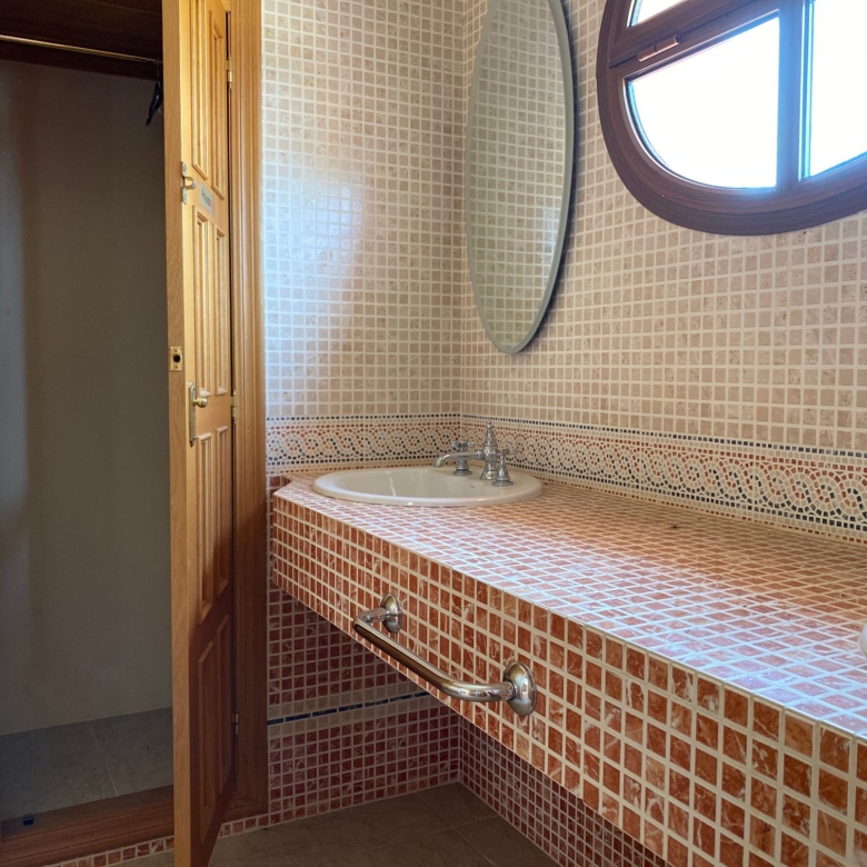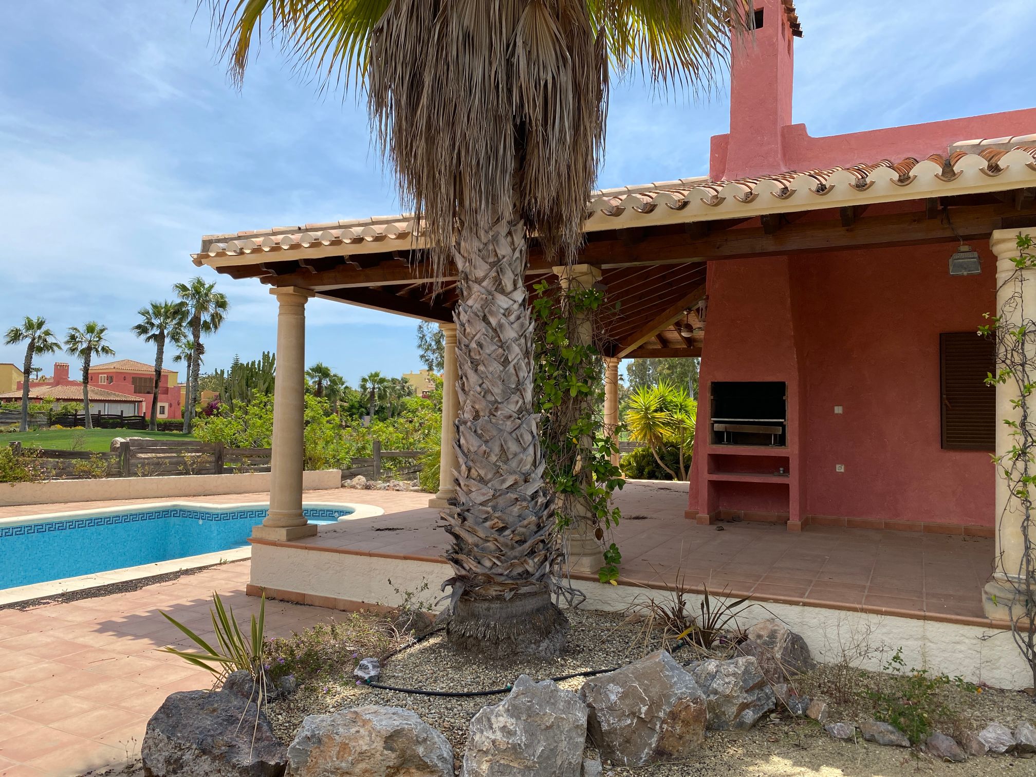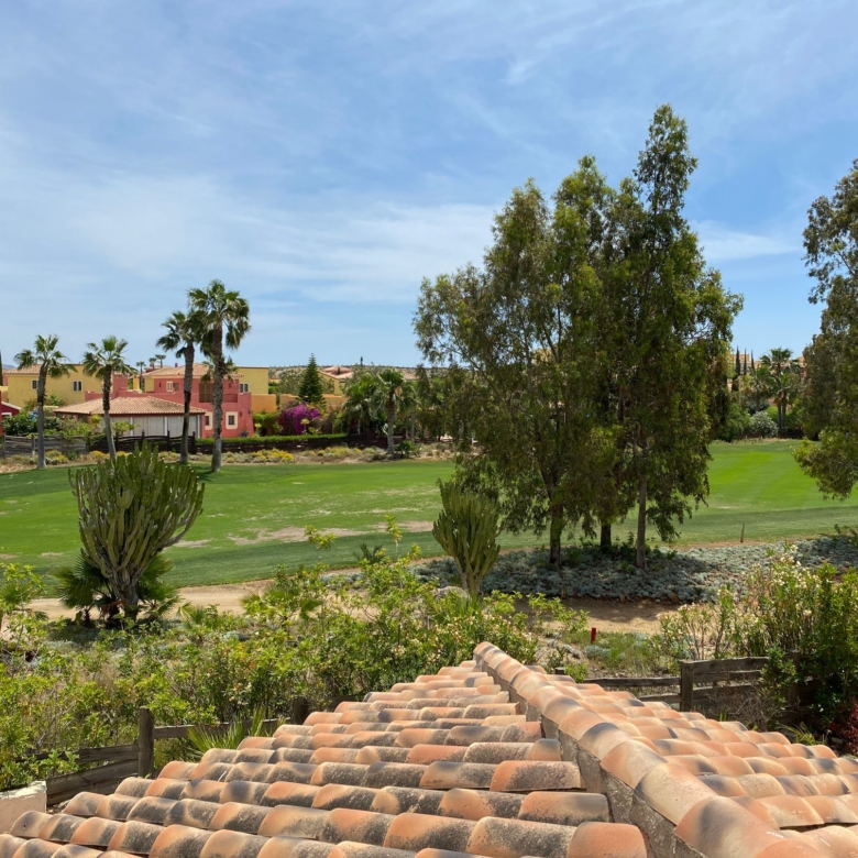 The spacious internal reception area opens out, with a ‘level through’ floor, onto the covered verandas to offer over 93m2 of combined interior/exterior living and dining space, designed to be used as one in this specially privileged climate. A stone-built fireplace internally and a built-in barbecue externally are provided. The master bedroom has an extensive private roof terrace with great views and a separate dressing and bathroom.