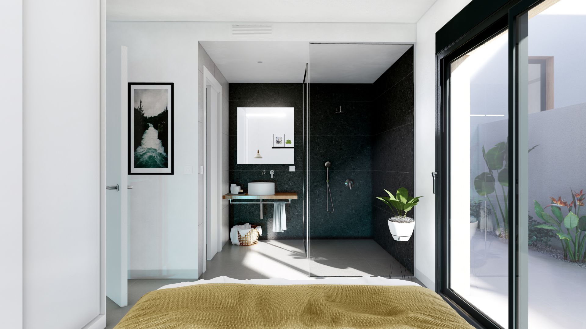 washbasin in vitrified white porcelain, shower floor made with anti-slip resin and