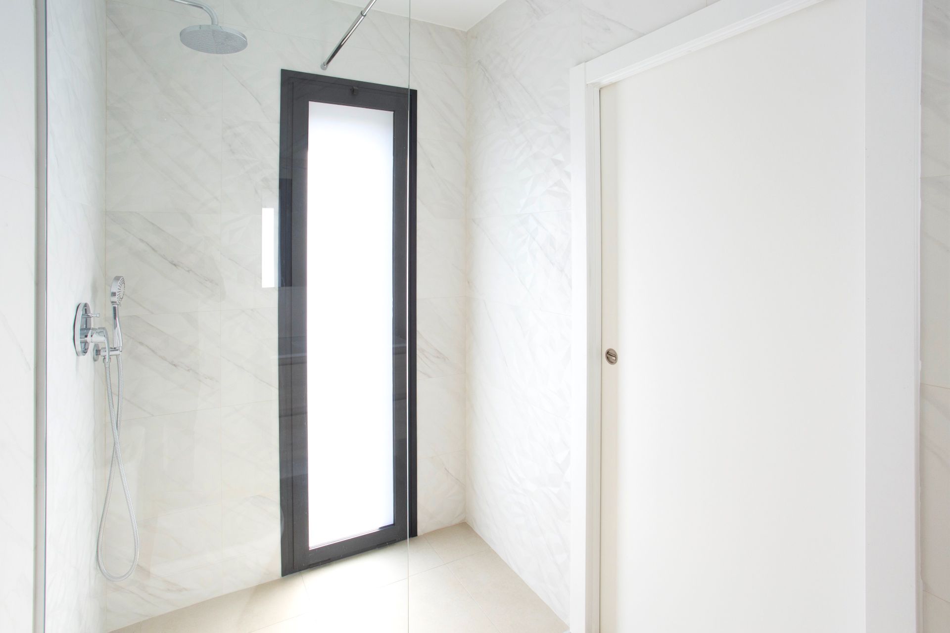 steel drain grate finished in colour white and shower enclosure with fixed glass.