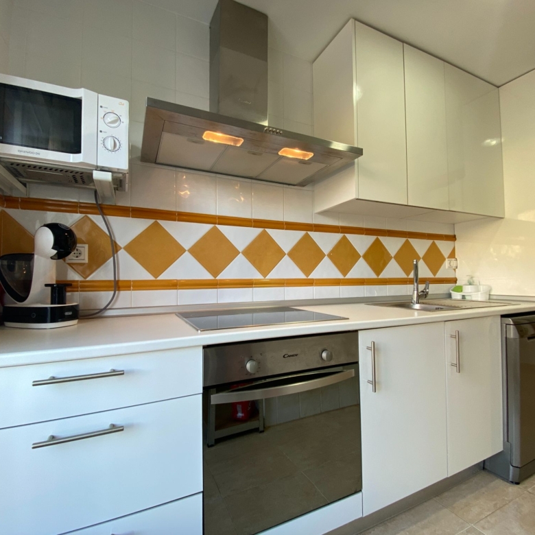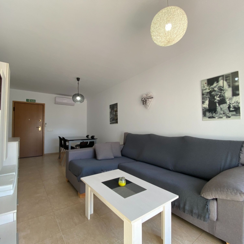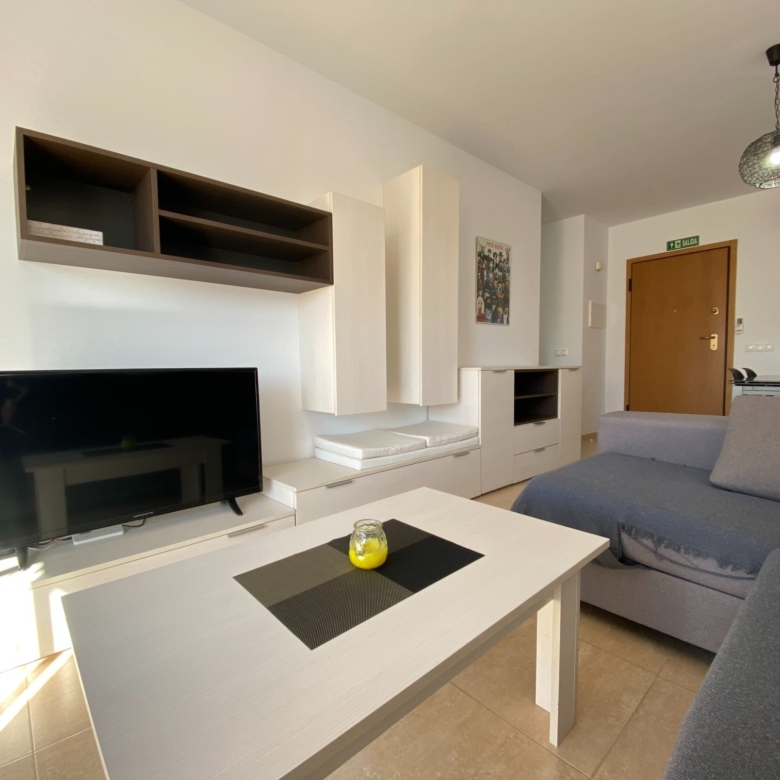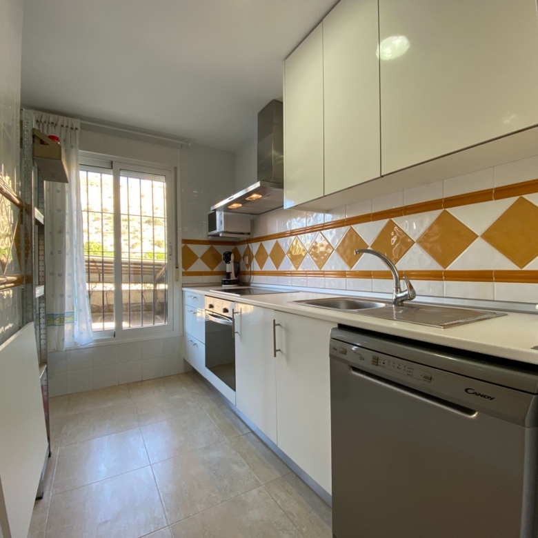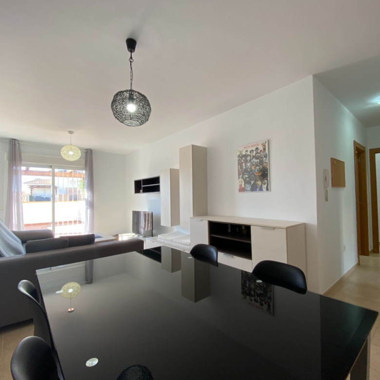 The living room is divided into a rest area with a large sofa and a dining area, through the corridor on the right-hand side and very close we have the fully furnished and equipped kitchen, it even has a very folding table on the left side to be able to have breakfast, from the kitchen we can access the patio-laundry room, with windows to the outside and with bars.