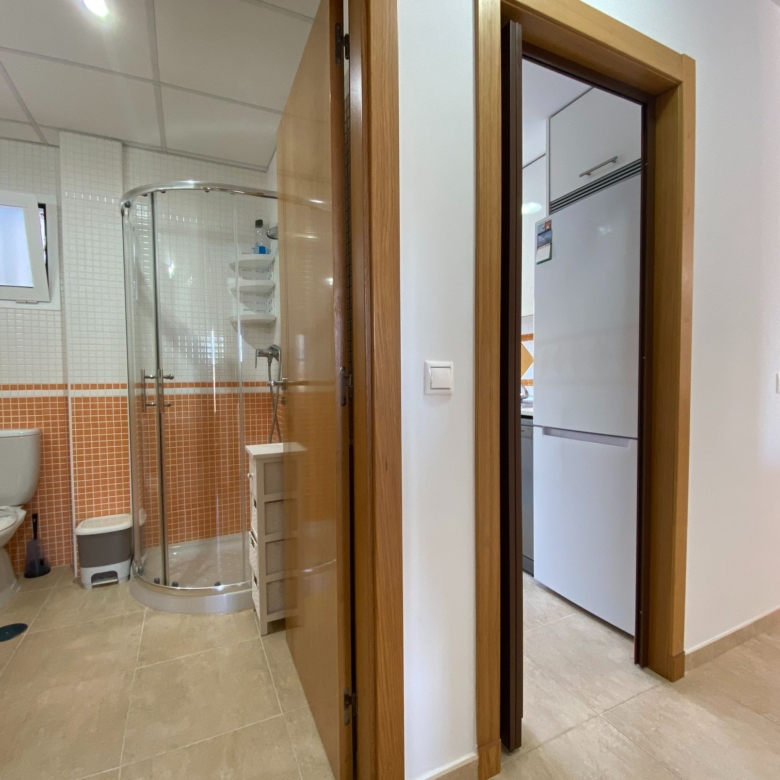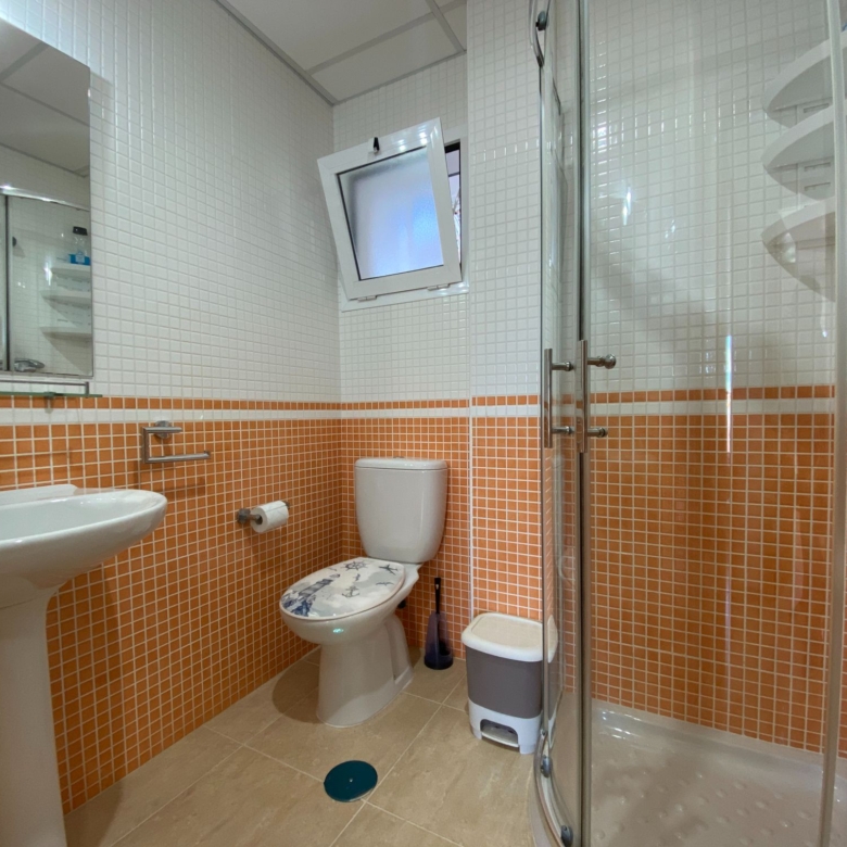 At the end of the corridor, we have a complete bathroom with a shower cabin and a very spacious window. The bedrooms have fitted wardrobes, one of them consists of two single beds and the other has a large double bed and an en-suite bathroom with a bathtub and window.