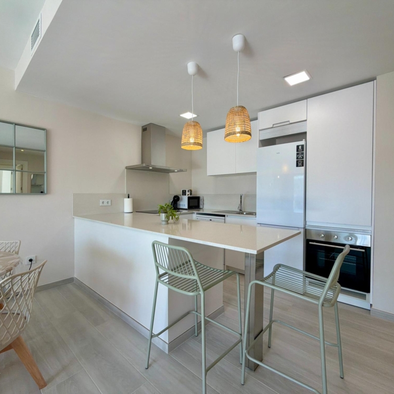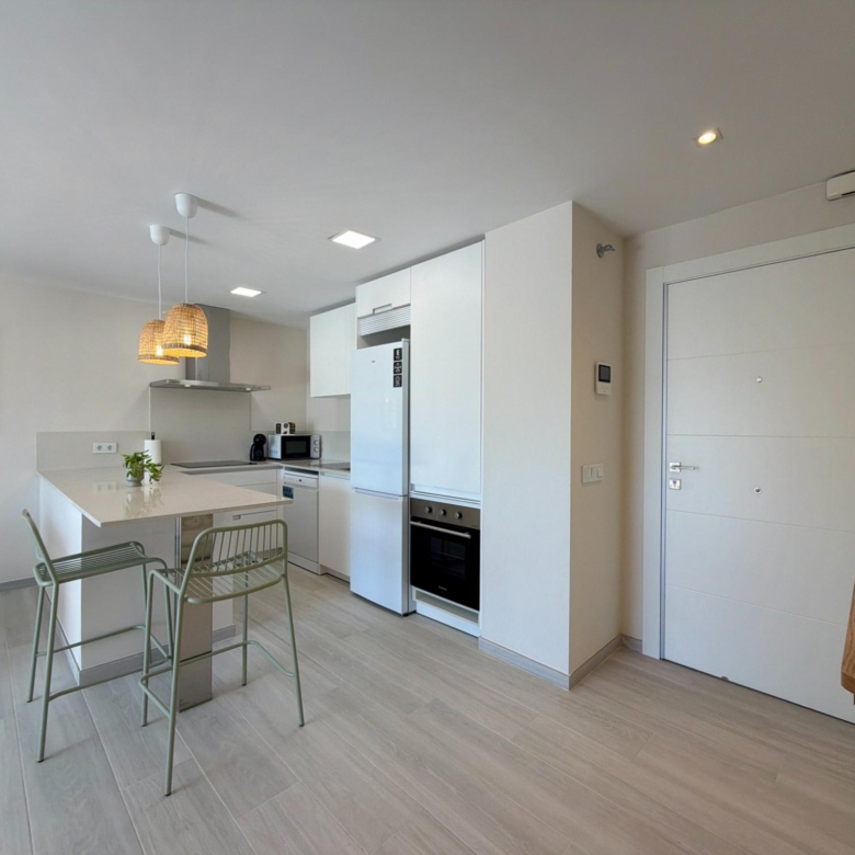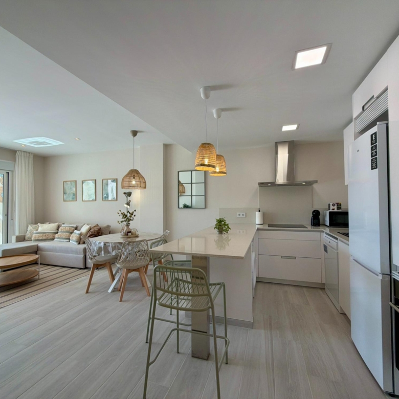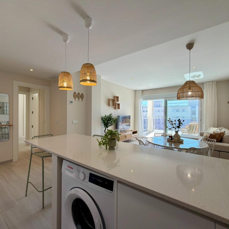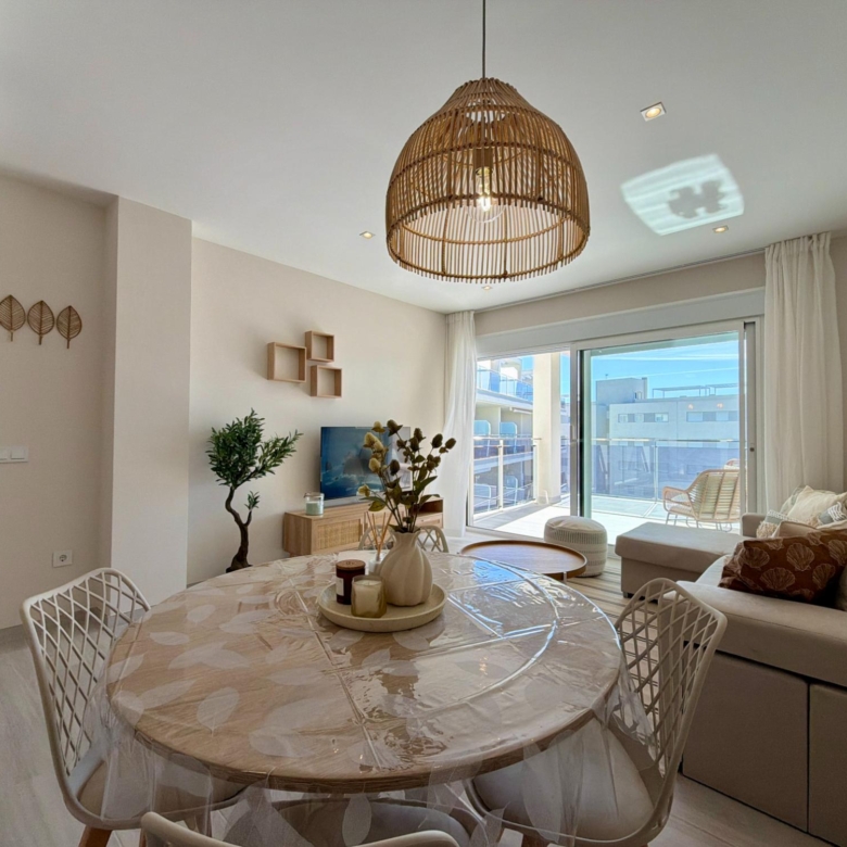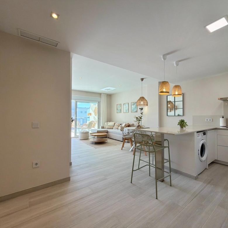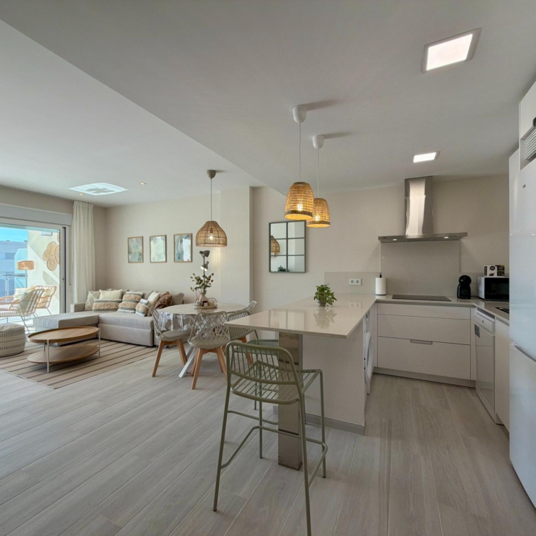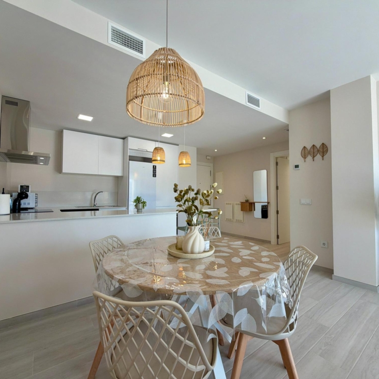 From the moment you step inside, you are welcomed by an expansive living–dining area flooded with natural light, thanks to its elevated 3rd-floor position and large panoramic windows. The ambience is warm, calm, and ideal for long stays—perfect for remote workers, retirees, or anyone wanting to enjoy the Spanish coastline during the quiet winter months.