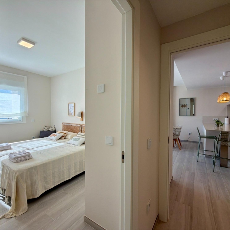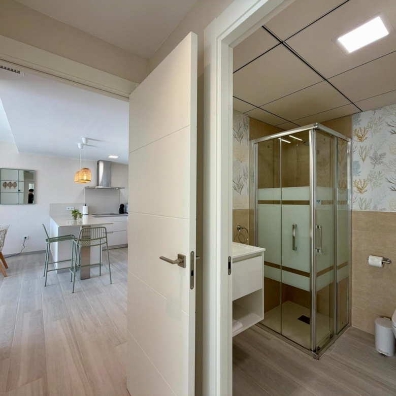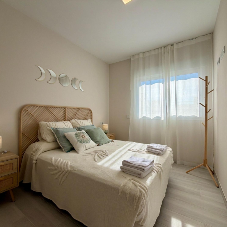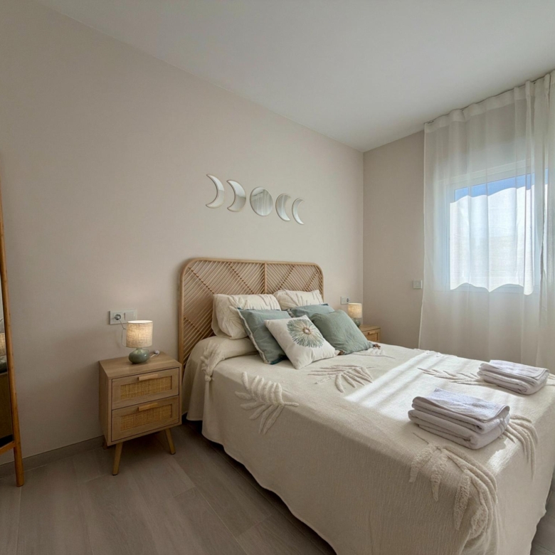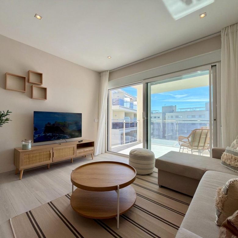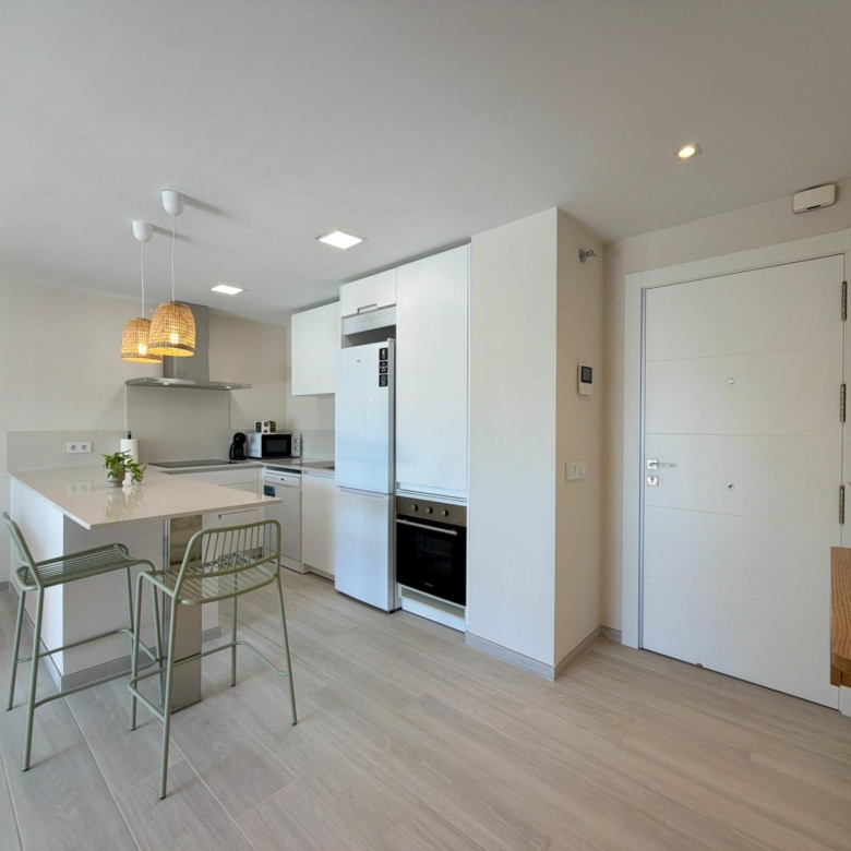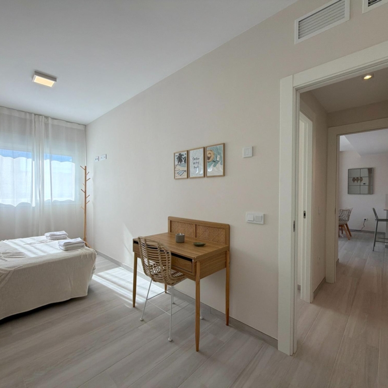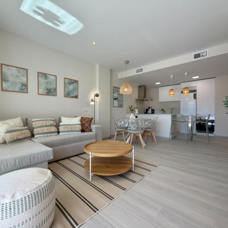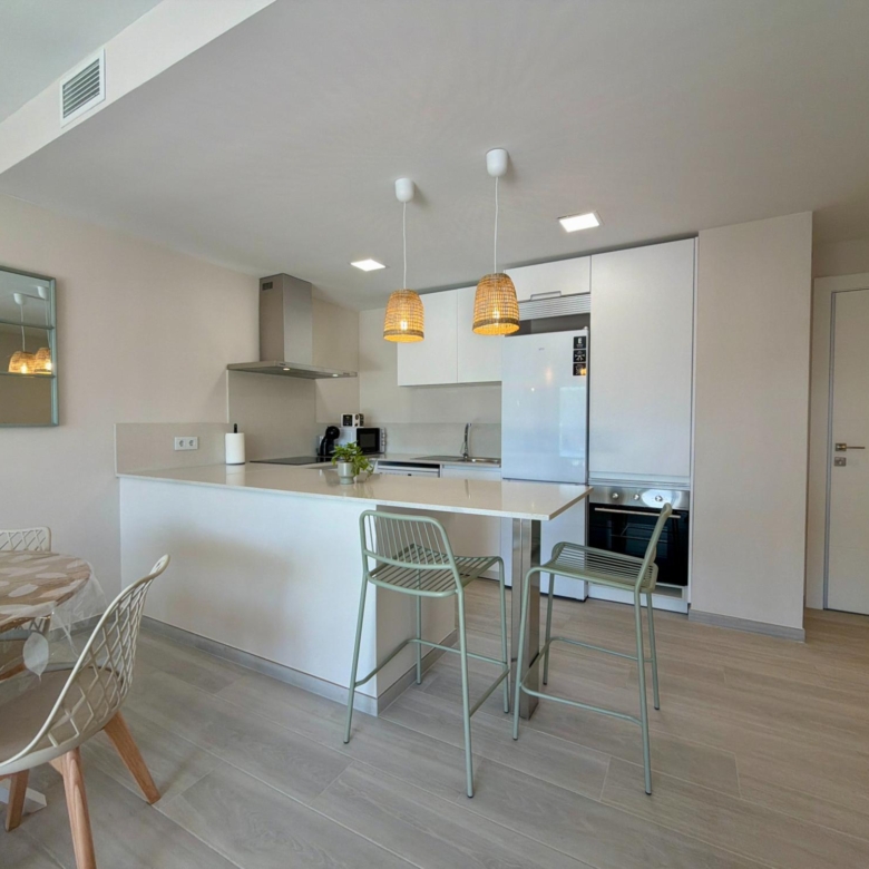 From the moment you step inside, you are welcomed by an expansive living–dining area flooded with natural light, thanks to its elevated 3rd-floor position and large panoramic windows. The ambience is warm, calm, and ideal for long stays—perfect for remote workers, retirees, or anyone wanting to enjoy the Spanish coastline during the quiet winter months.
