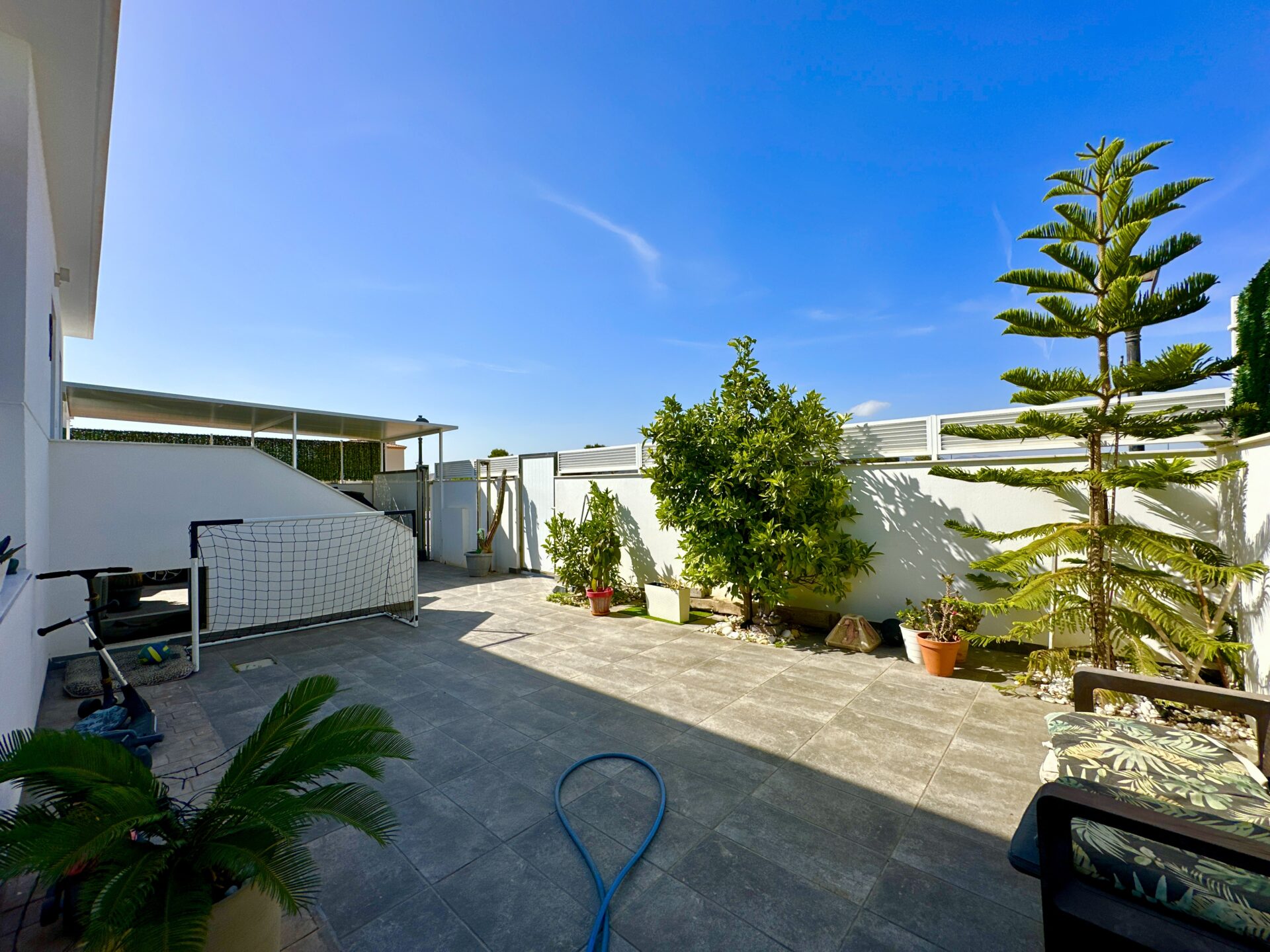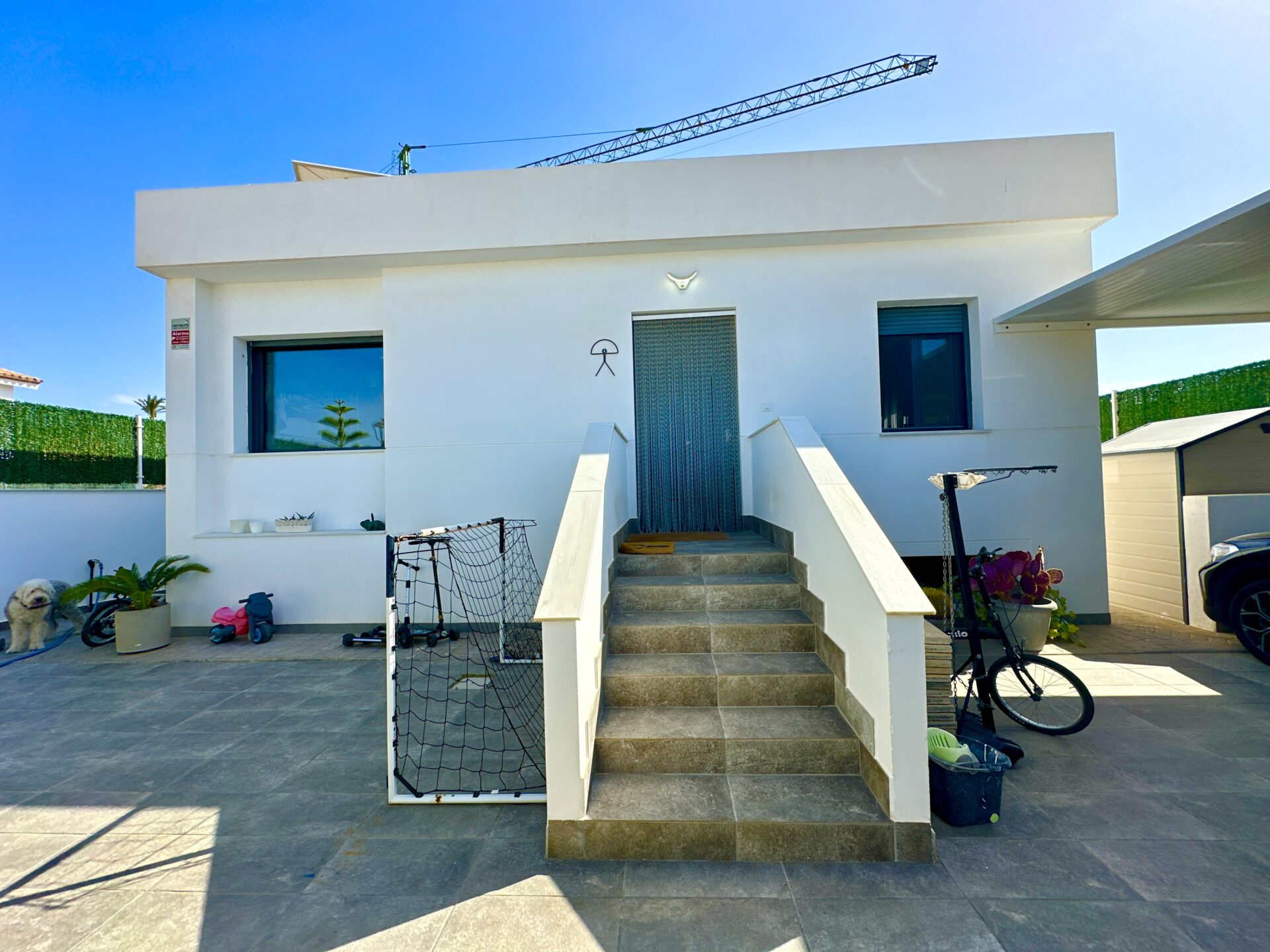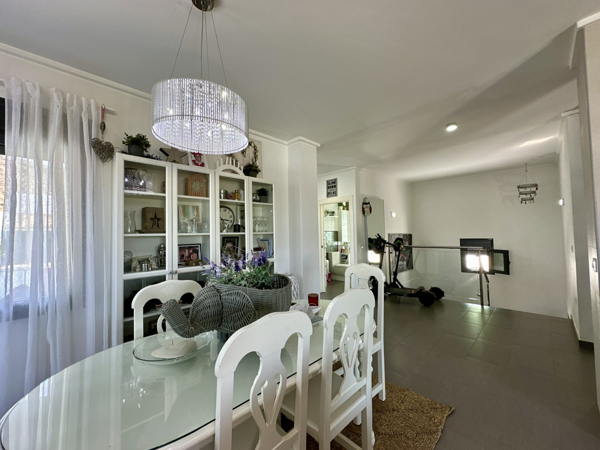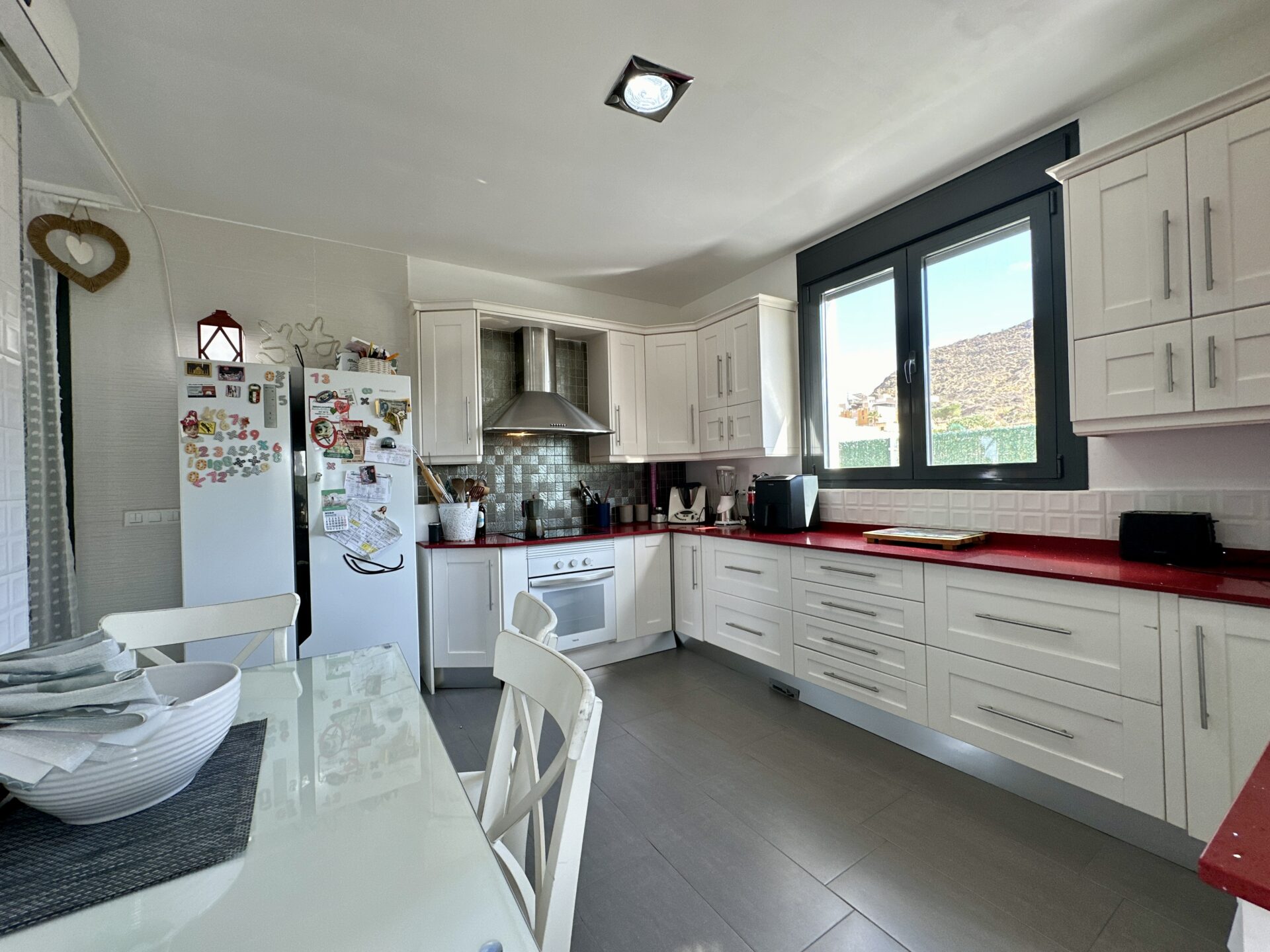 The living and dining area is spectacular, accommodating a 4-meter-long sofa and more. The bright kitchen, with a dining area, is a delightful space to spend time in. Additionally, the property offers two storage rooms, a laundry room, covered parking with a motorized access door, and a terrace with an awning next to the kitchen.