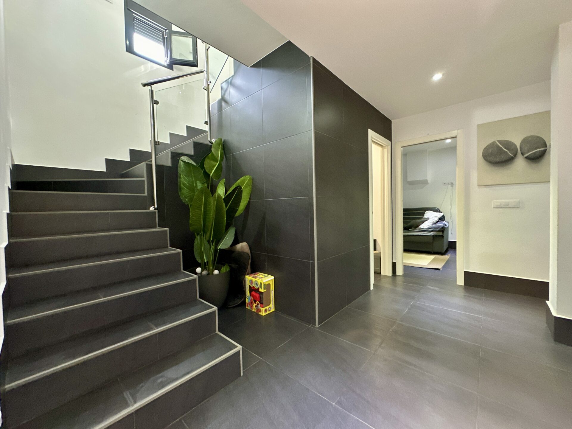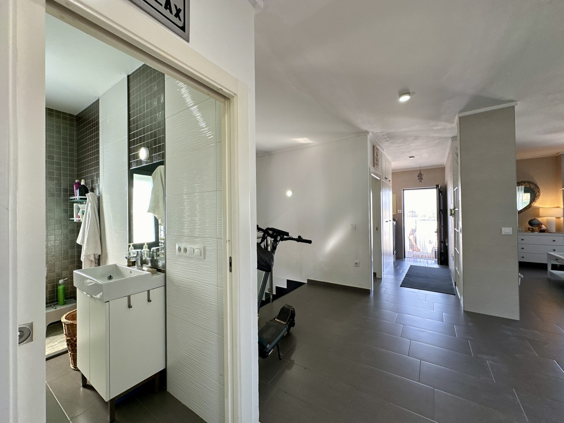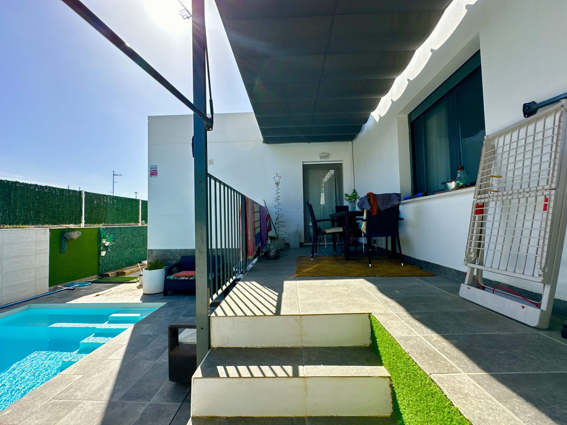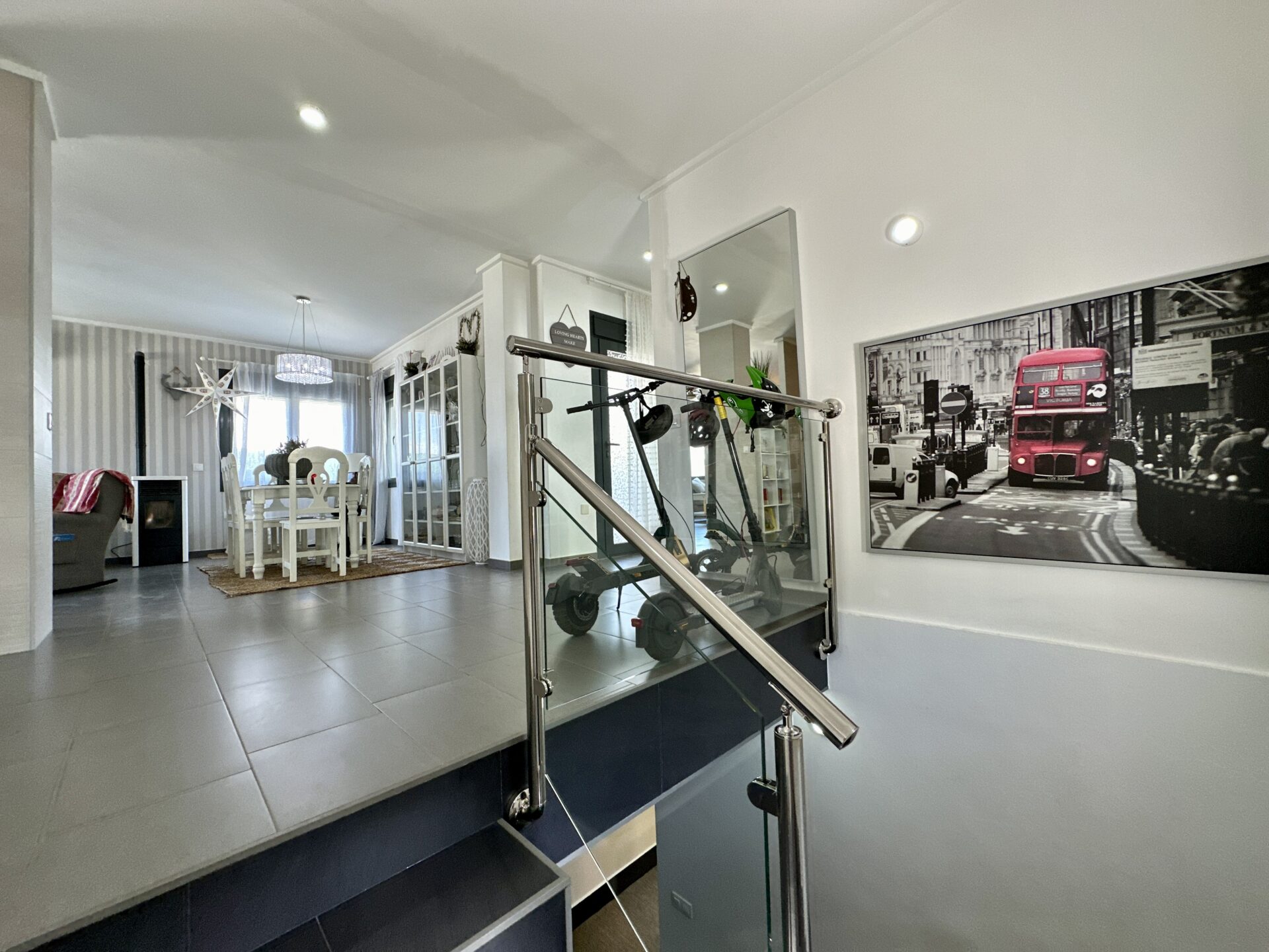 The living and dining area is spectacular, accommodating a 4-meter-long sofa and more. The bright kitchen, with a dining area, is a delightful space to spend time in. Additionally, the property offers two storage rooms, a laundry room, covered parking with a motorized access door, and a terrace with an awning next to the kitchen.