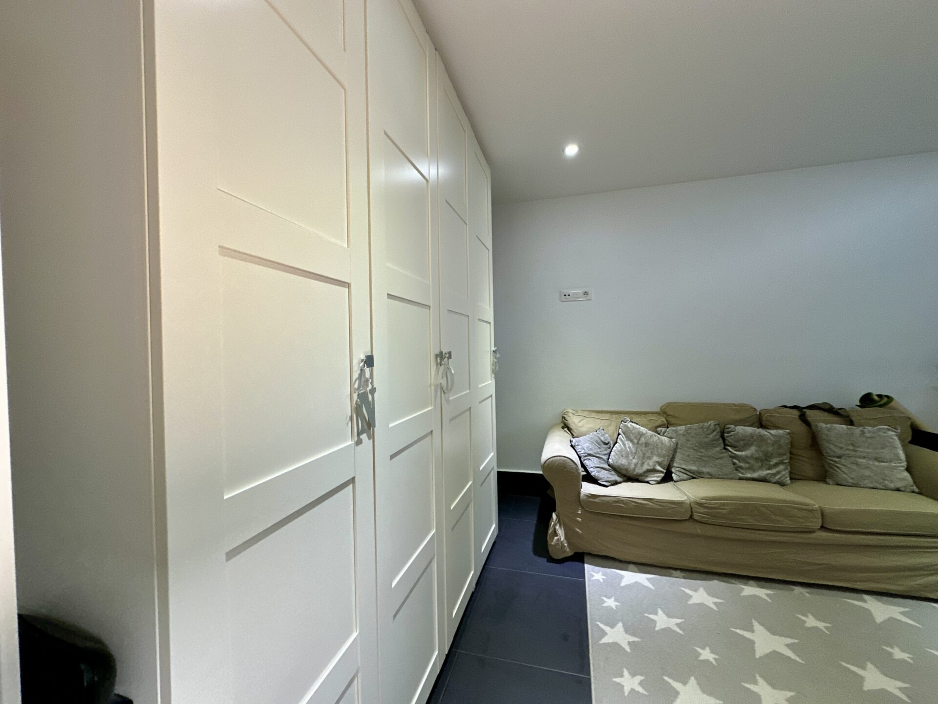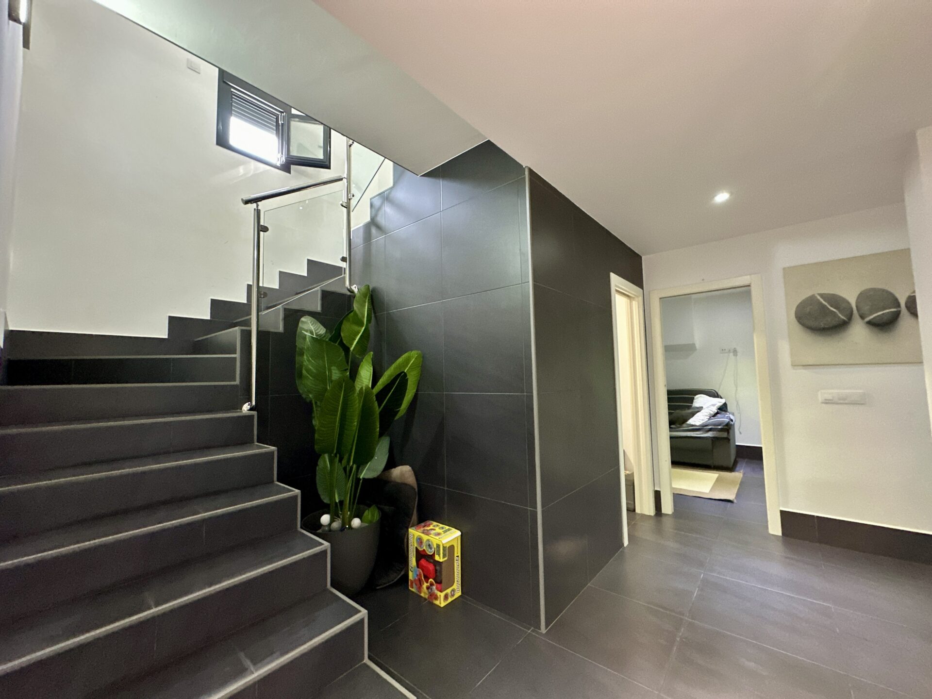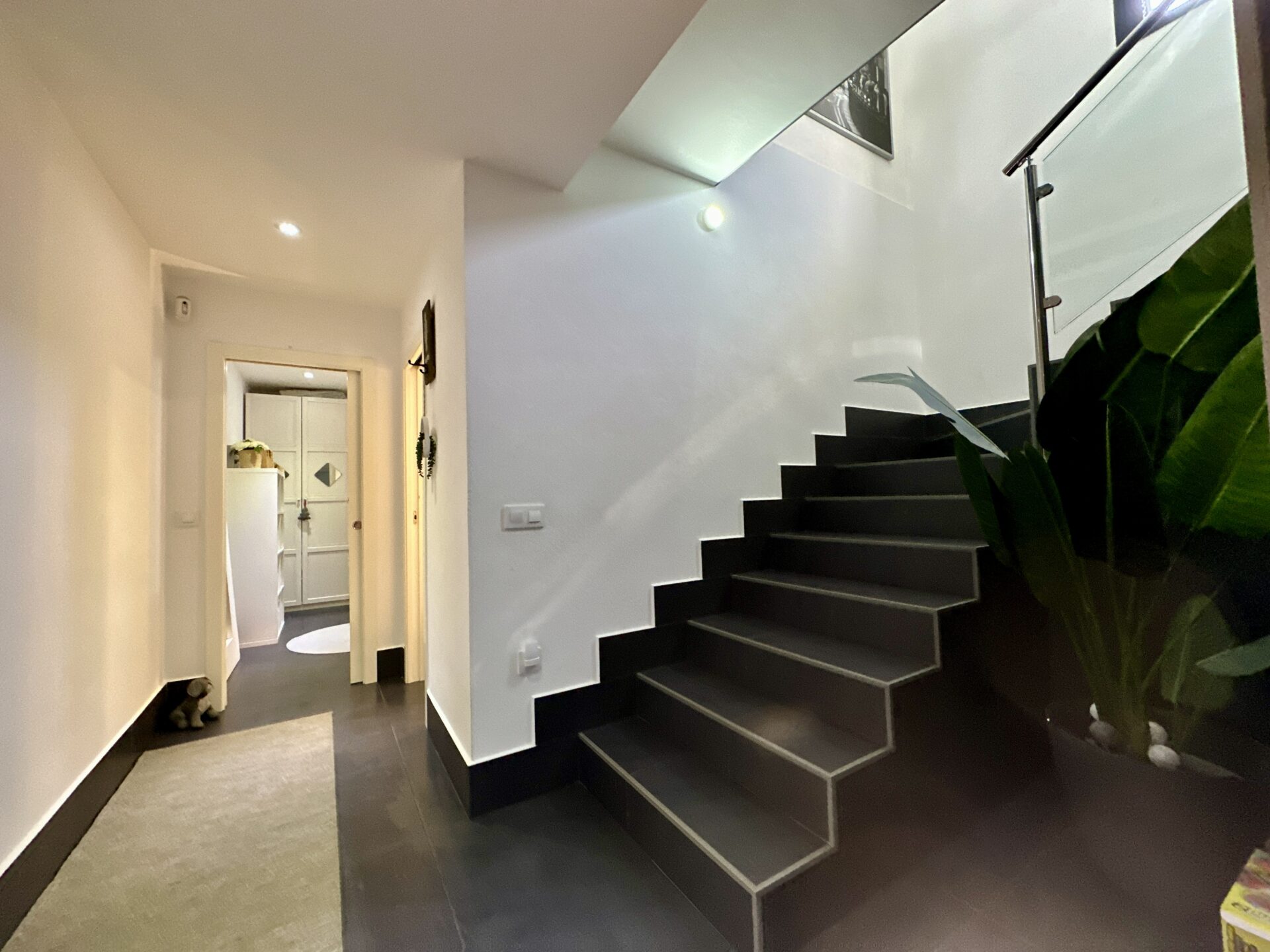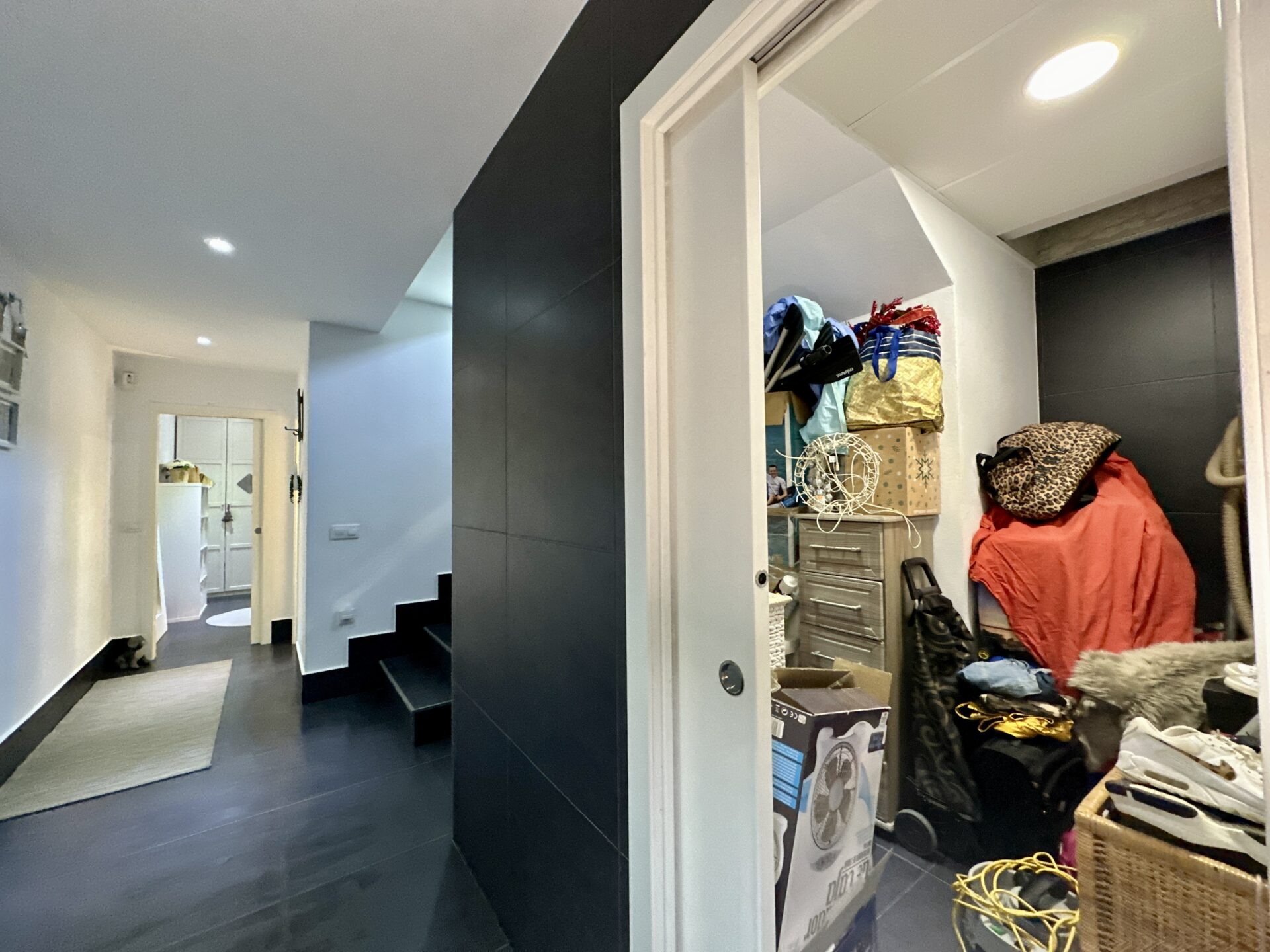 The living and dining area is spectacular, accommodating a 4-meter-long sofa and more. The bright kitchen, with a dining area, is a delightful space to spend time in. Additionally, the property offers two storage rooms, a laundry room, covered parking with a motorized access door, and a terrace with an awning next to the kitchen.