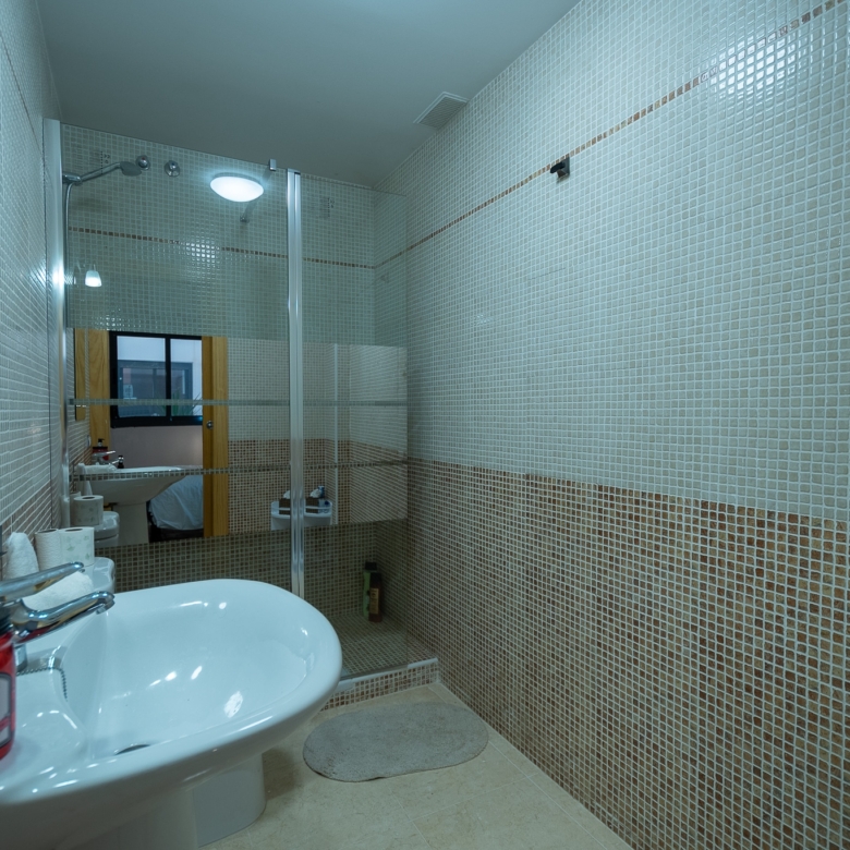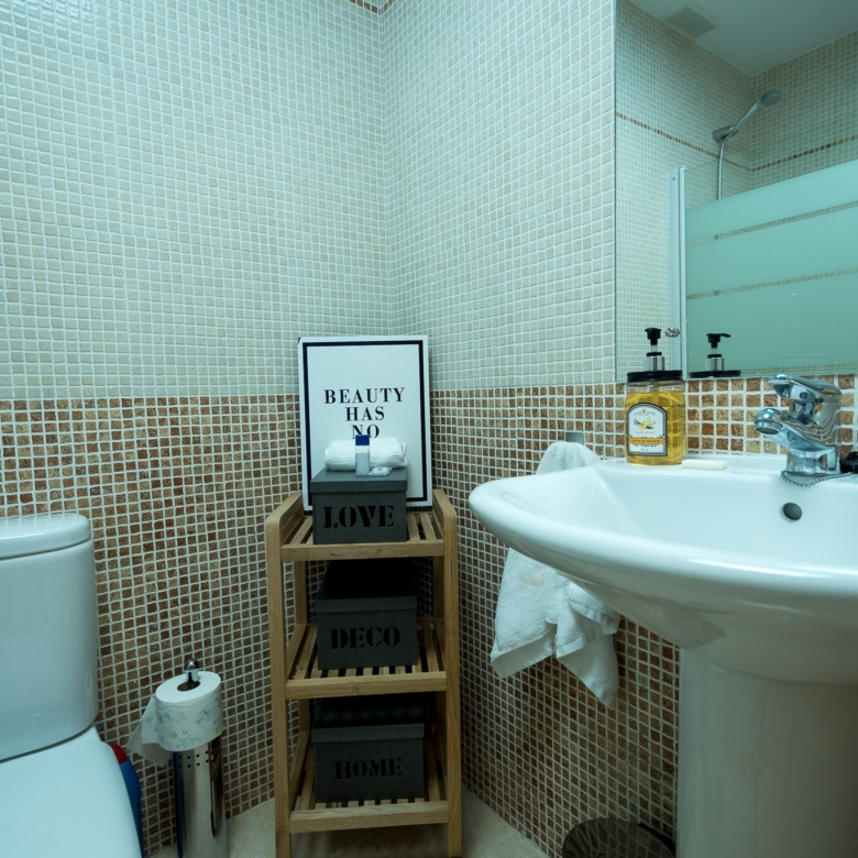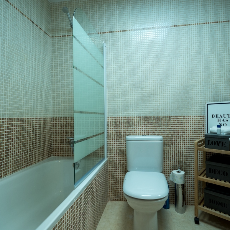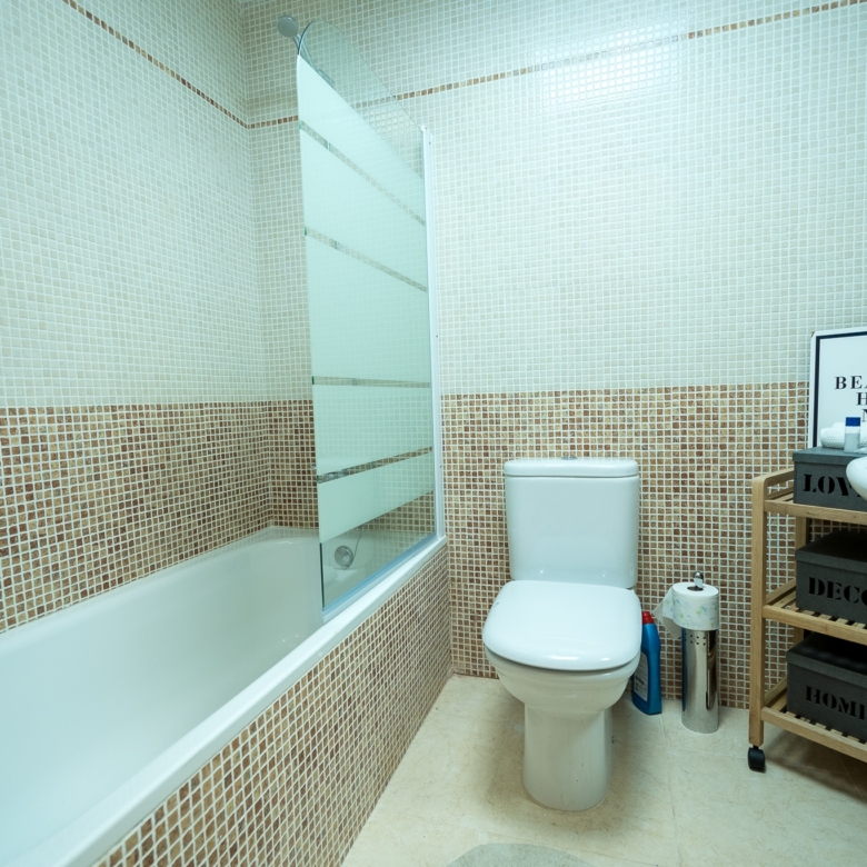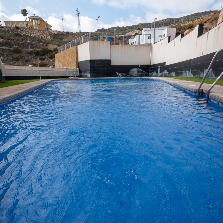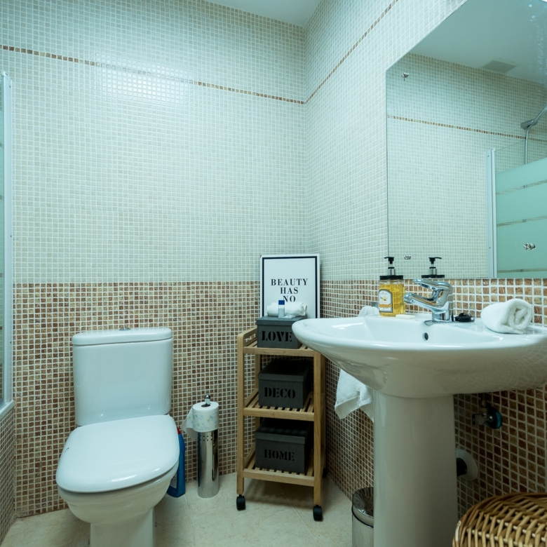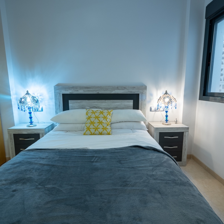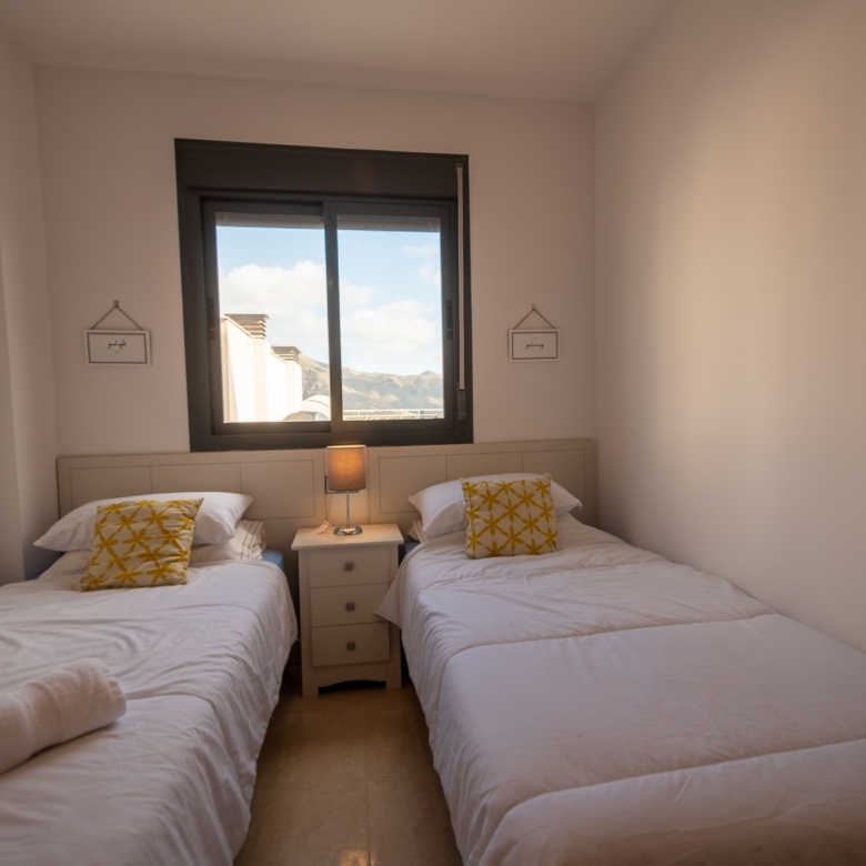 Located on the La Envia Golf Course Almeria this is a fabulous, air-conditioned, 2 bedroom, 2 bathroom apartment with wonderful sea views. The Lounge and dining room are well proportioned. The lounge area has a sofas coffee table and 45″ Flat Screen TV (UK & Spanish channels). The dining area has a dining table with 2 chairs and a dresser. Patio doors from the lounge to the terrace. Terrace furniture includes a round table and 4 chairs – an ideal place for breakfast, lunch, and dinner!