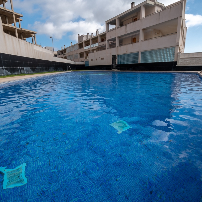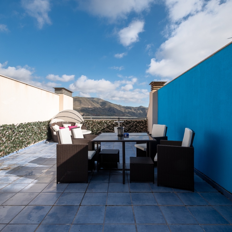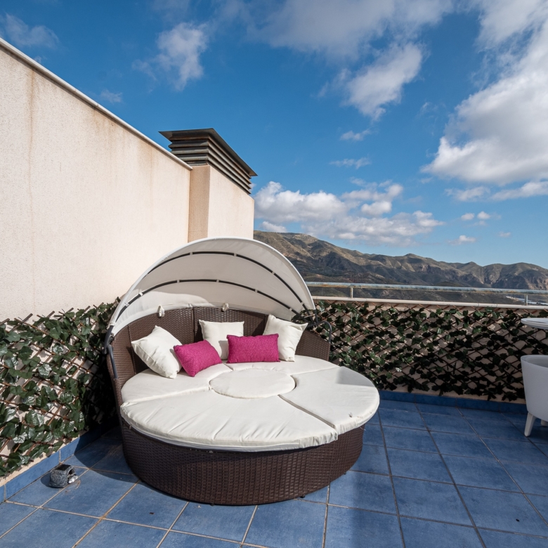 The sun terrace areas have sea and mountain views. Terrace furniture includes a table and 4 chairs. There is 2 swimming pool within the back of the apartment and indoor swimming pool heated. The outdoor pool is not heated.
