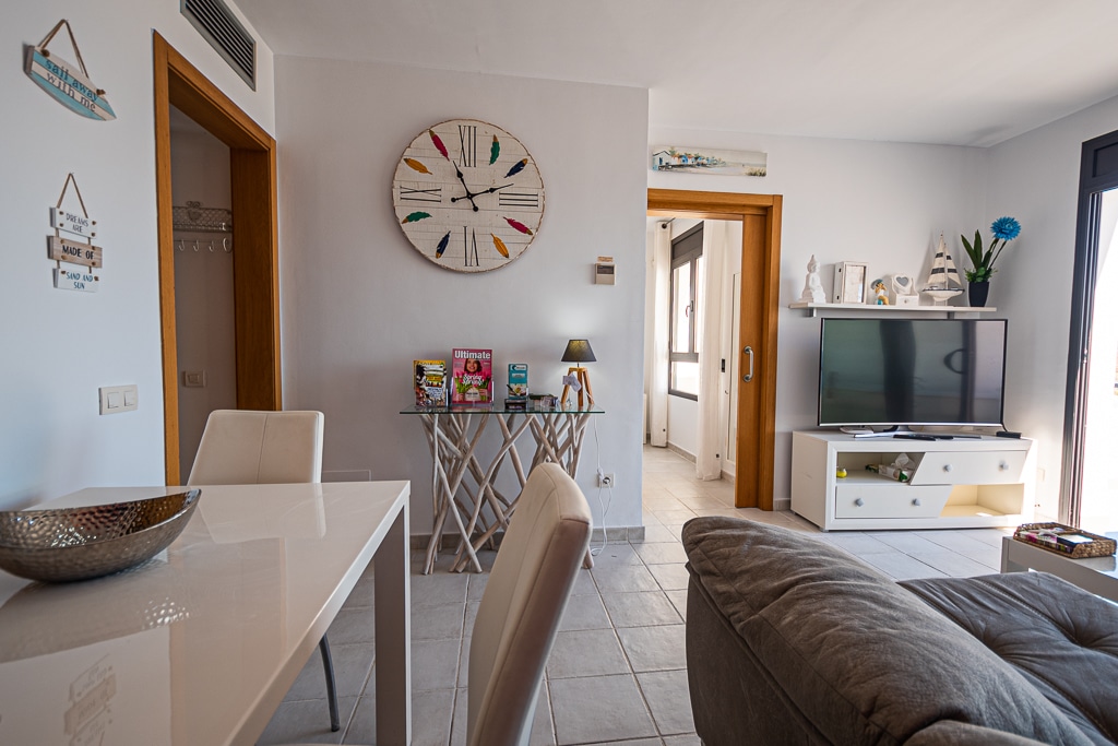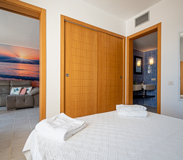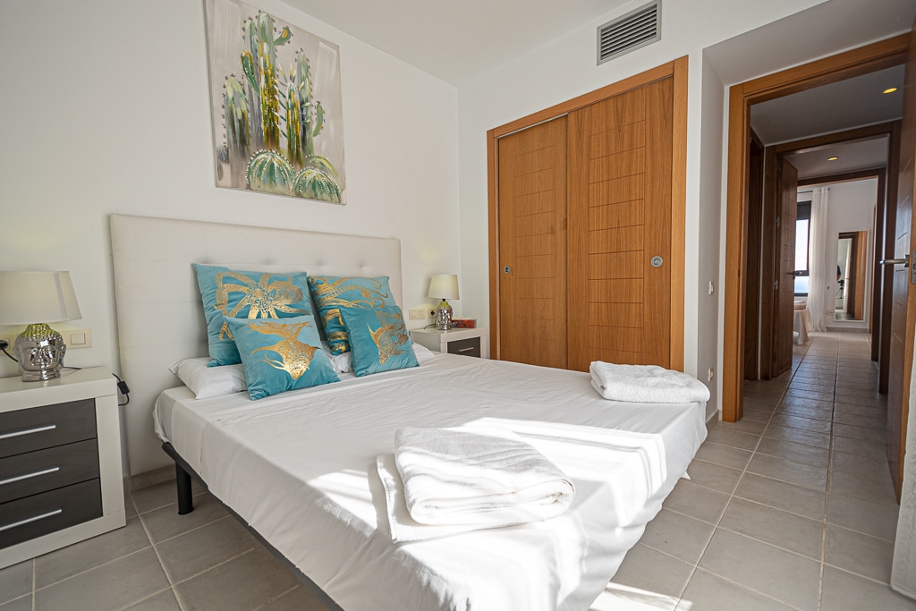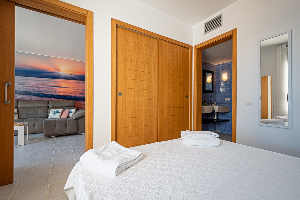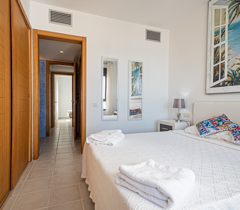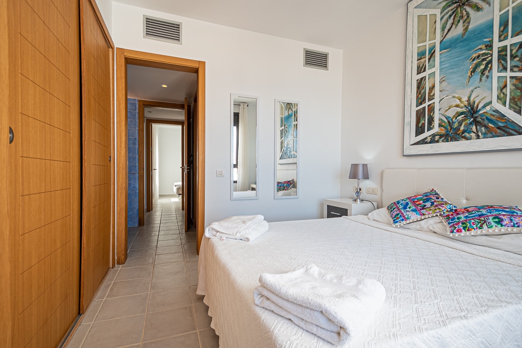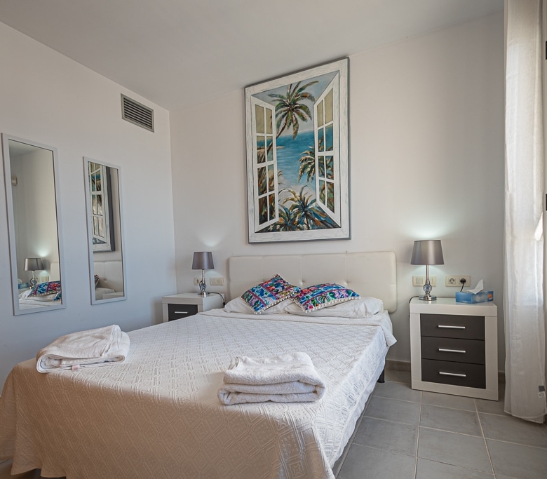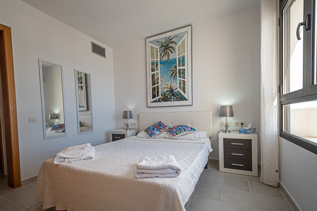 Located on the Playa Macenas Beach Resort, this is a fabulous, air-conditioned, 2 bedroom, 2 bathroom apartment with wifi and wonderful sea views. The Lounge and dining room are well proportioned. The lounge area has a sofas coffee table and 58″ Flat Screen TV (UK & Spanish channels). The dining area has a dining table with 4 chairs and a dresser. Patio doors from the lounge to the terrace. Terrace furniture includes a round table and 4 chairs – an ideal place for breakfast, lunch and dinner!