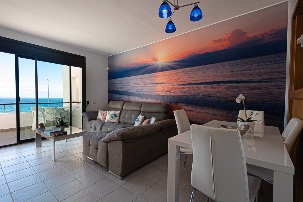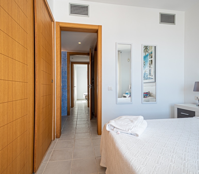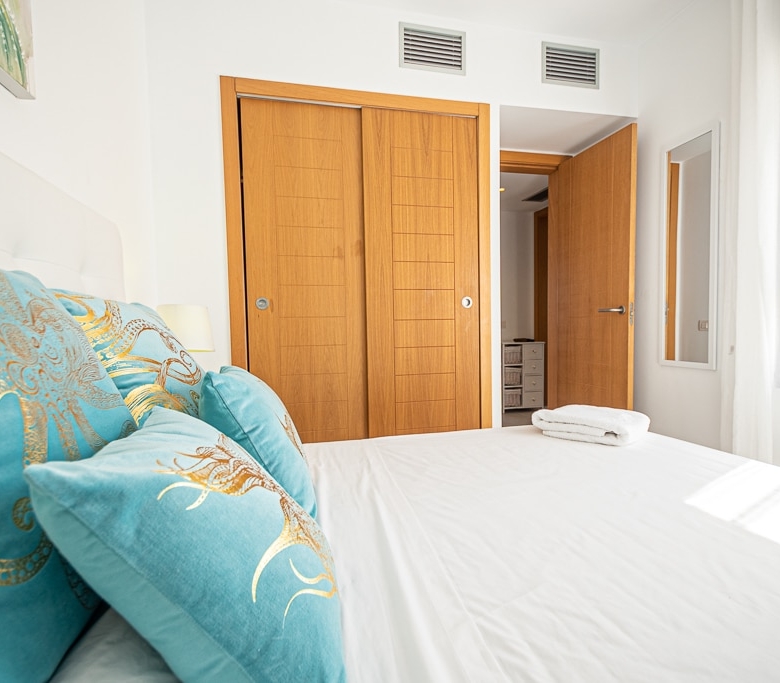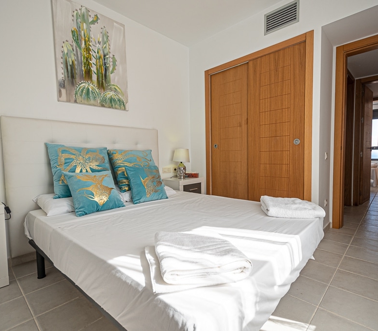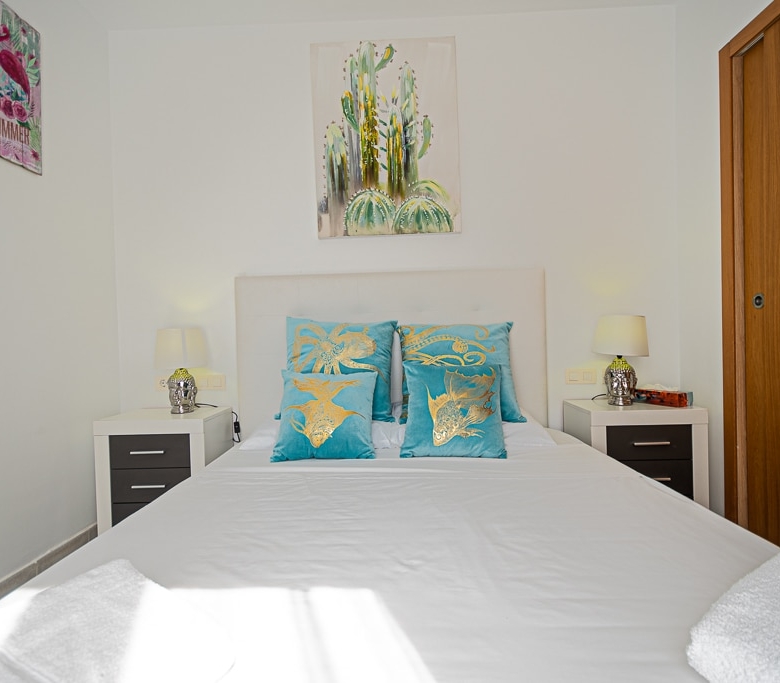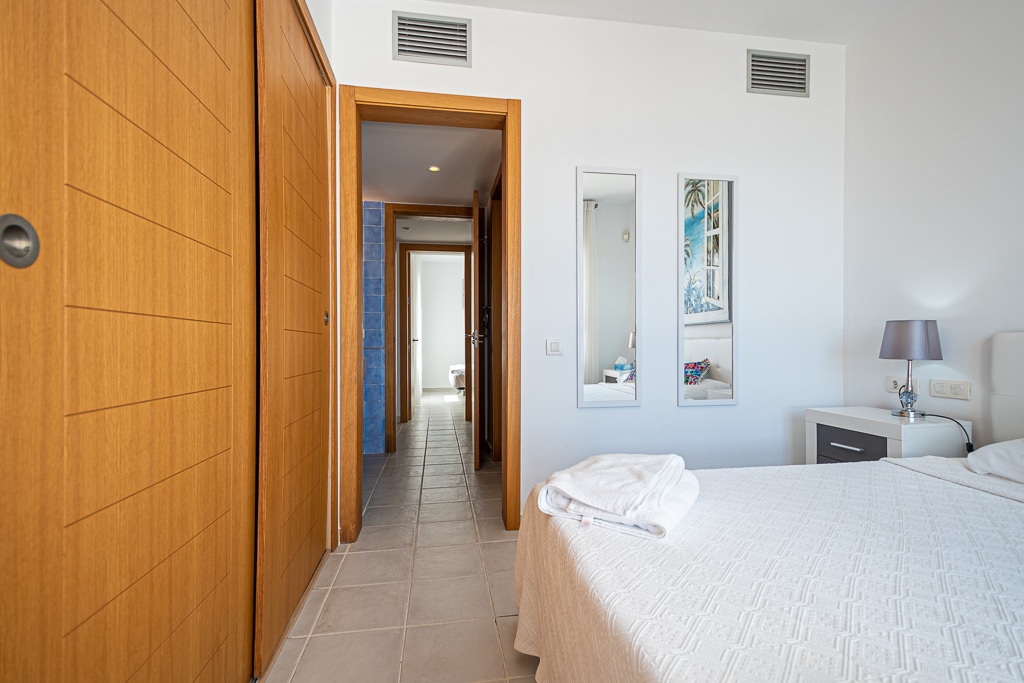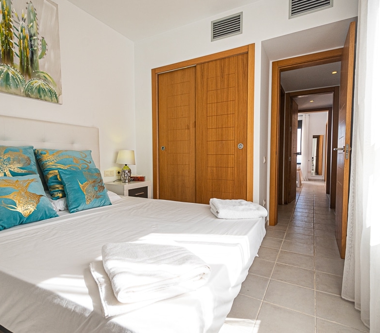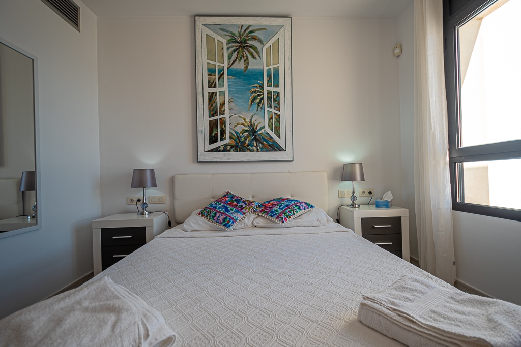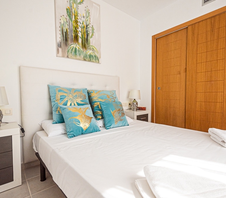 Located on the Playa Macenas Beach Resort, this is a fabulous, air-conditioned, 2 bedroom, 2 bathroom apartment with wifi and wonderful sea views. The Lounge and dining room are well proportioned. The lounge area has a sofas coffee table and 58″ Flat Screen TV (UK & Spanish channels). The dining area has a dining table with 4 chairs and a dresser. Patio doors from the lounge to the terrace. Terrace furniture includes a round table and 4 chairs – an ideal place for breakfast, lunch and dinner!