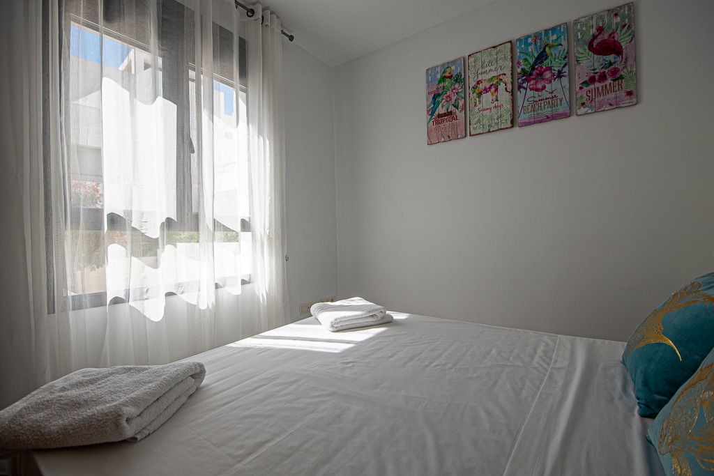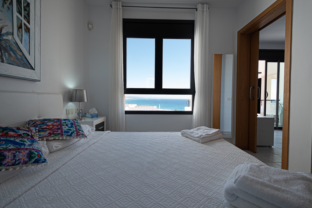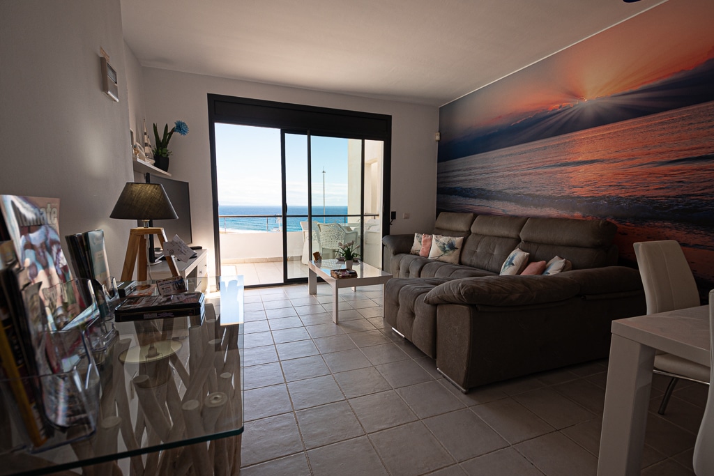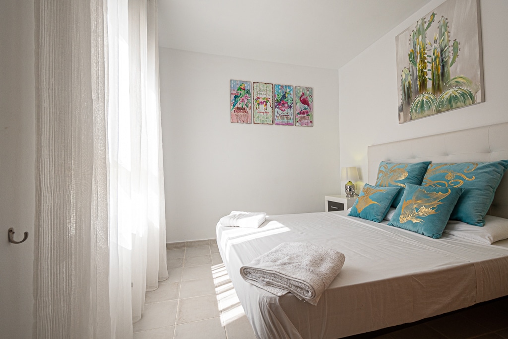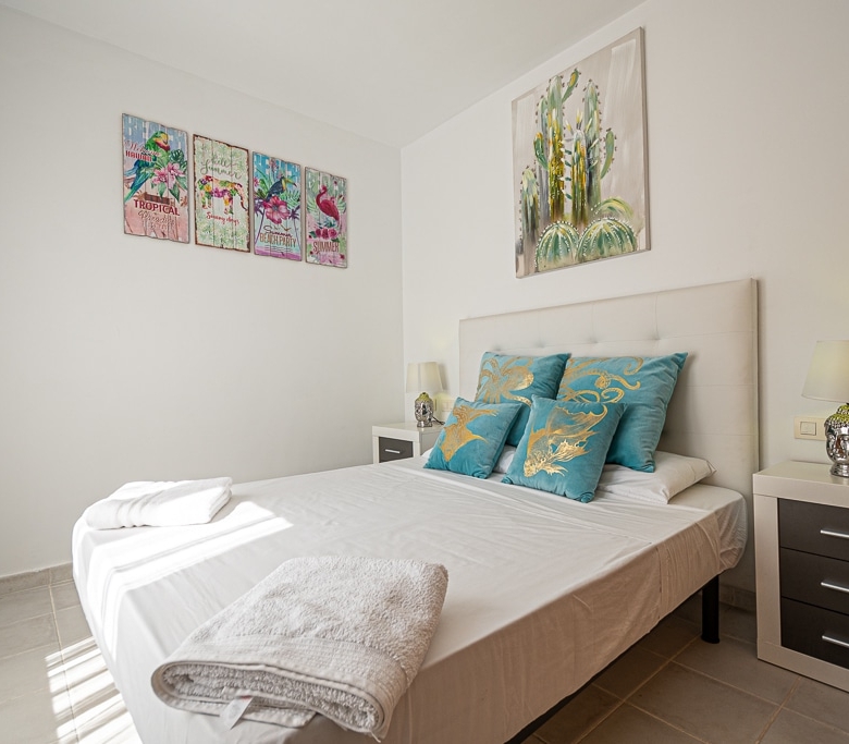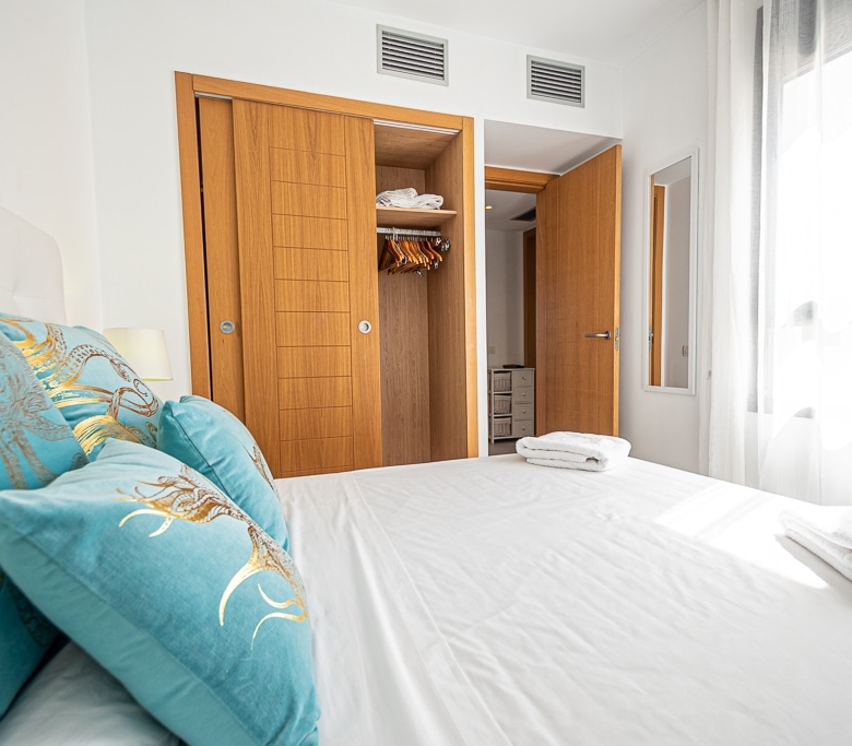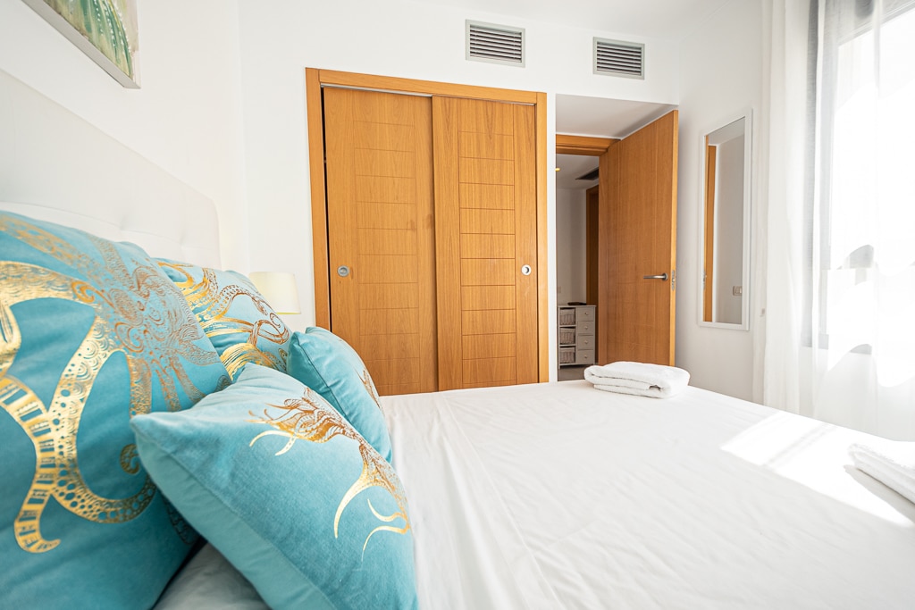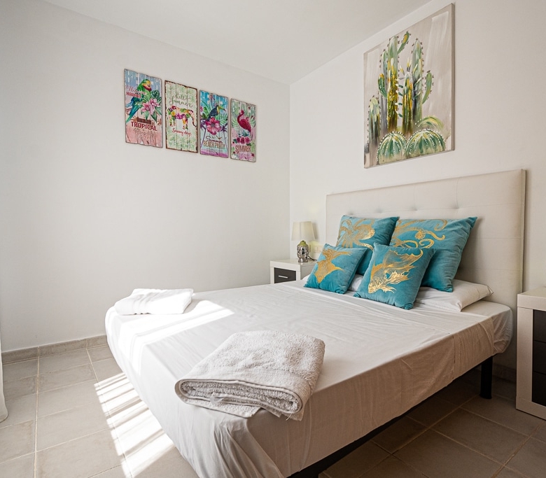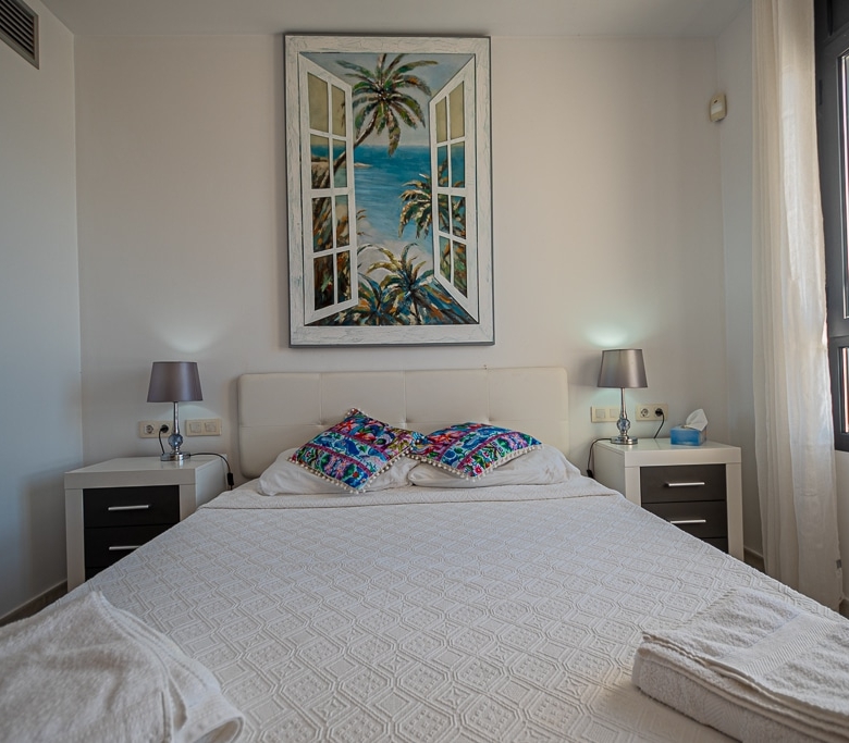 Located on the Playa Macenas Beach Resort, this is a fabulous, air-conditioned, 2 bedroom, 2 bathroom apartment with wifi and wonderful sea views. The Lounge and dining room are well proportioned. The lounge area has a sofas coffee table and 58″ Flat Screen TV (UK & Spanish channels). The dining area has a dining table with 4 chairs and a dresser. Patio doors from the lounge to the terrace. Terrace furniture includes a round table and 4 chairs – an ideal place for breakfast, lunch and dinner!