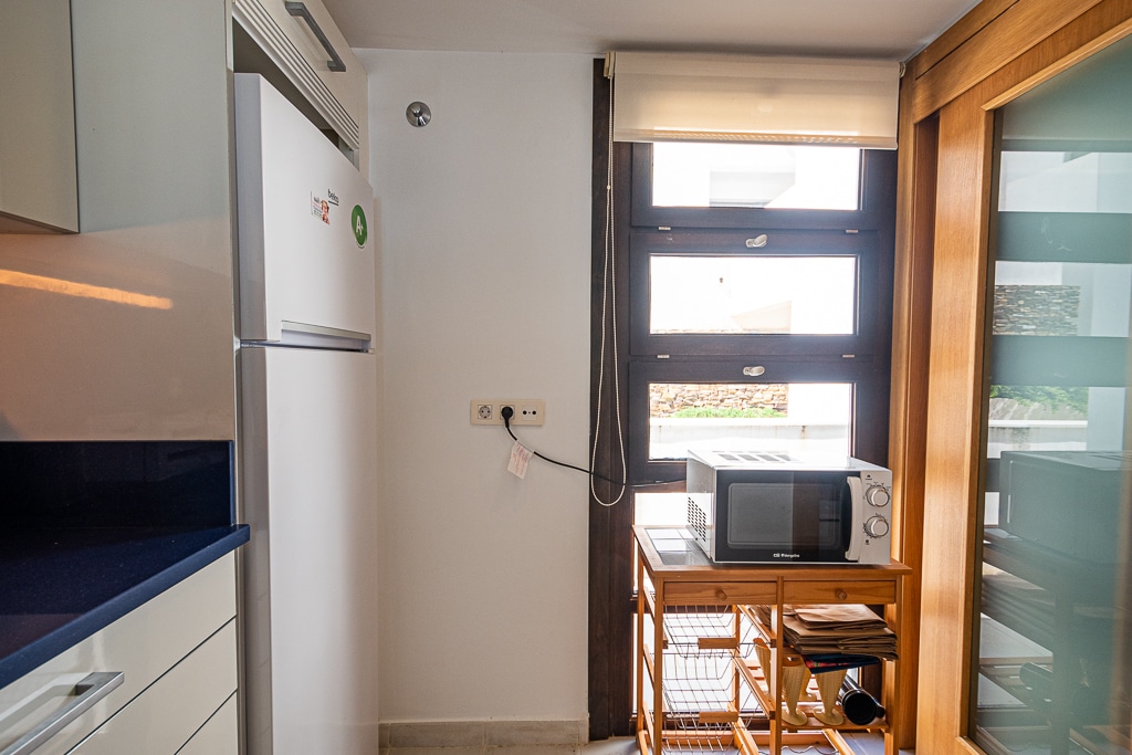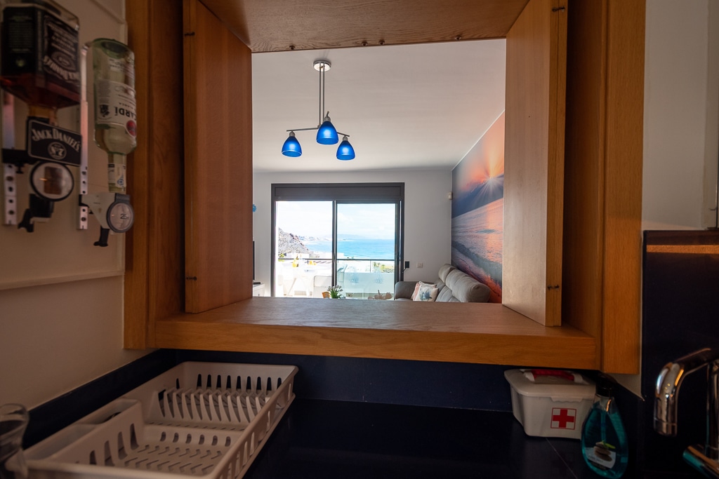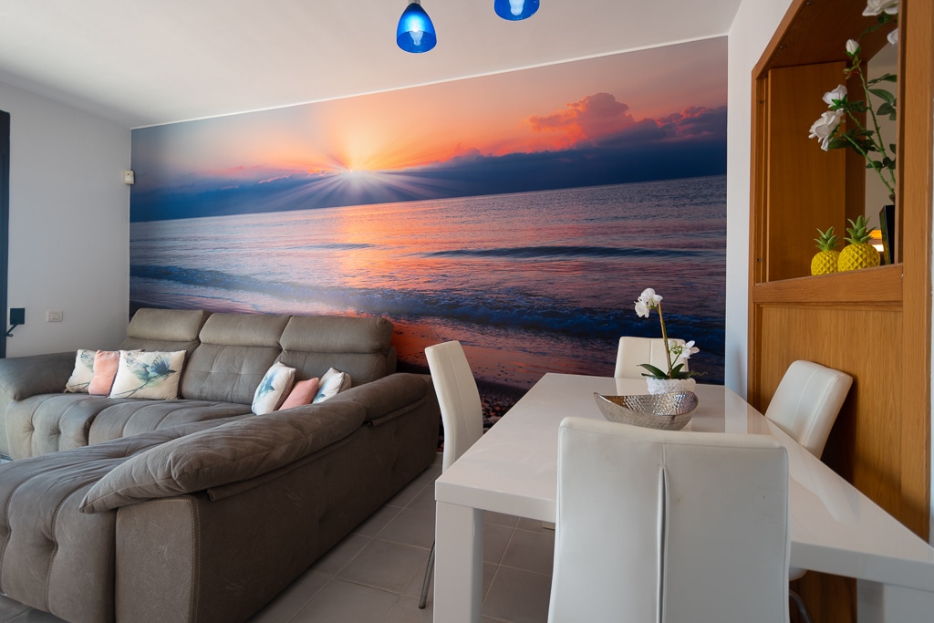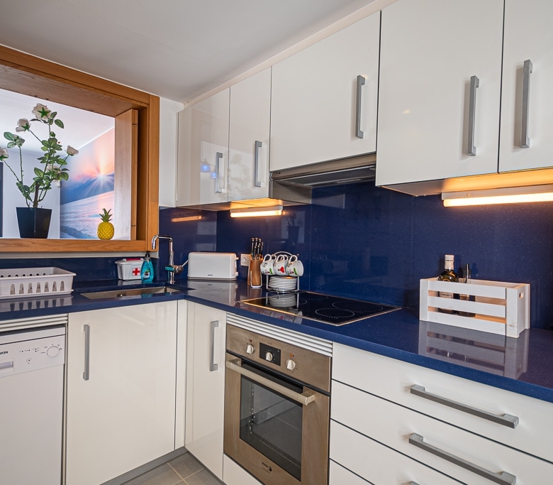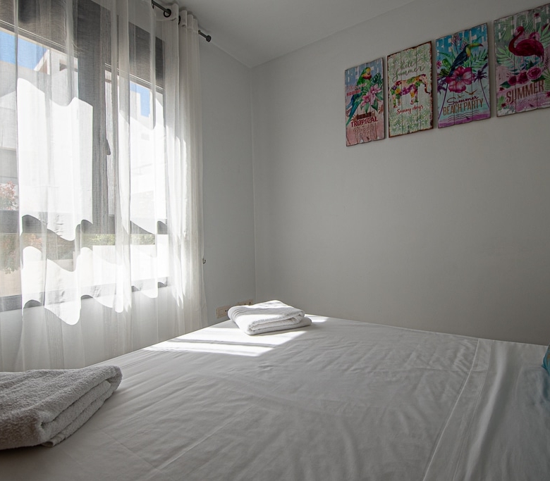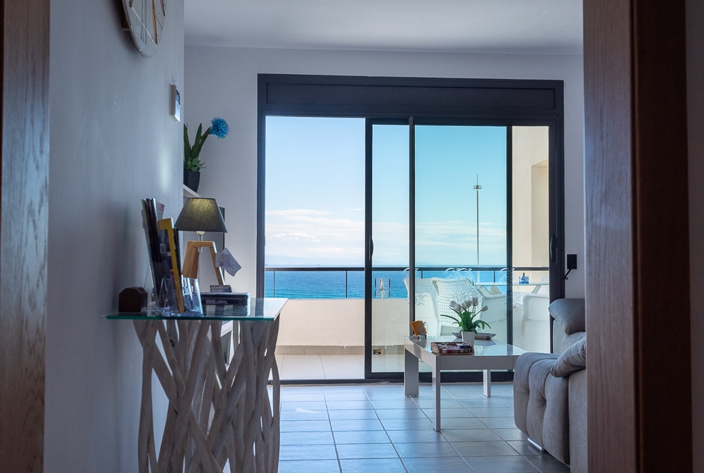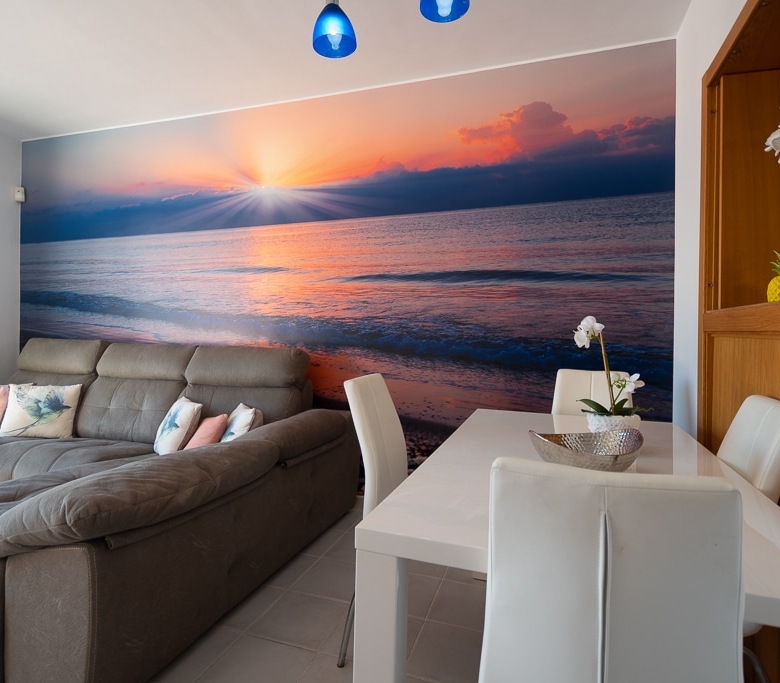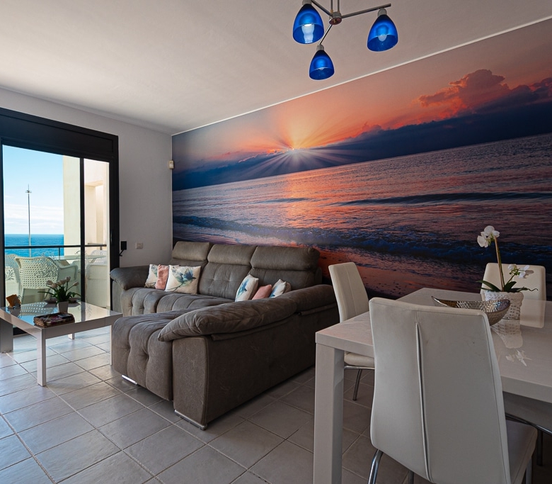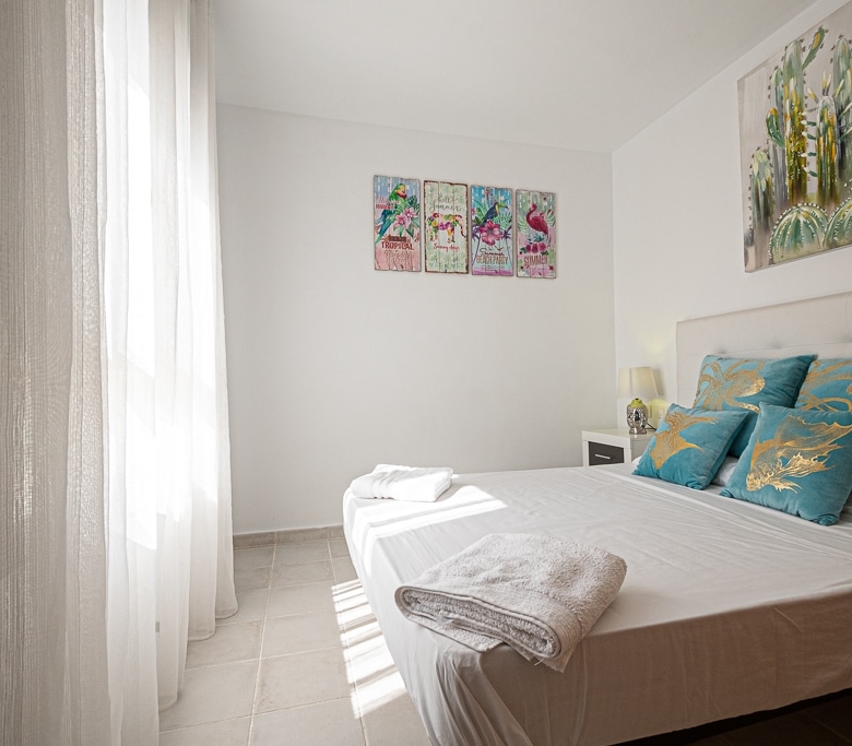 Located on the Playa Macenas Beach Resort, this is a fabulous, air-conditioned, 2 bedroom, 2 bathroom apartment with wifi and wonderful sea views. The Lounge and dining room are well proportioned. The lounge area has a sofas coffee table and 58″ Flat Screen TV (UK & Spanish channels). The dining area has a dining table with 4 chairs and a dresser. Patio doors from the lounge to the terrace. Terrace furniture includes a round table and 4 chairs – an ideal place for breakfast, lunch and dinner!