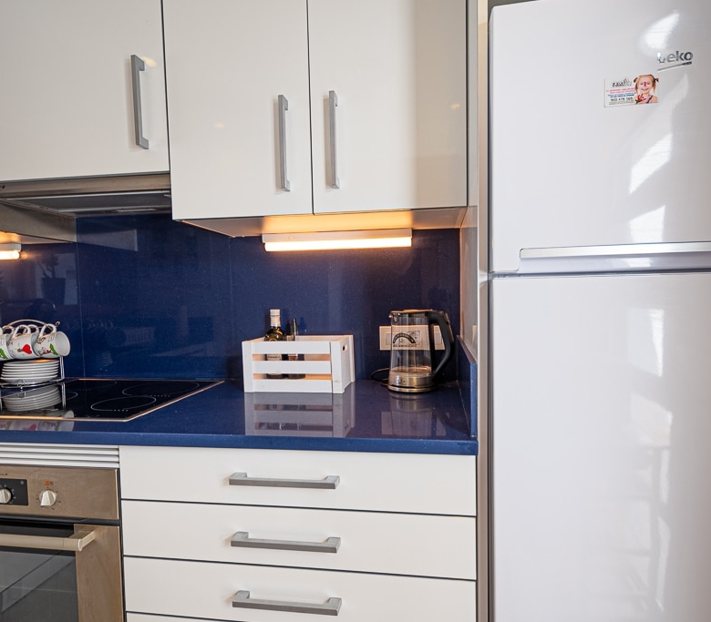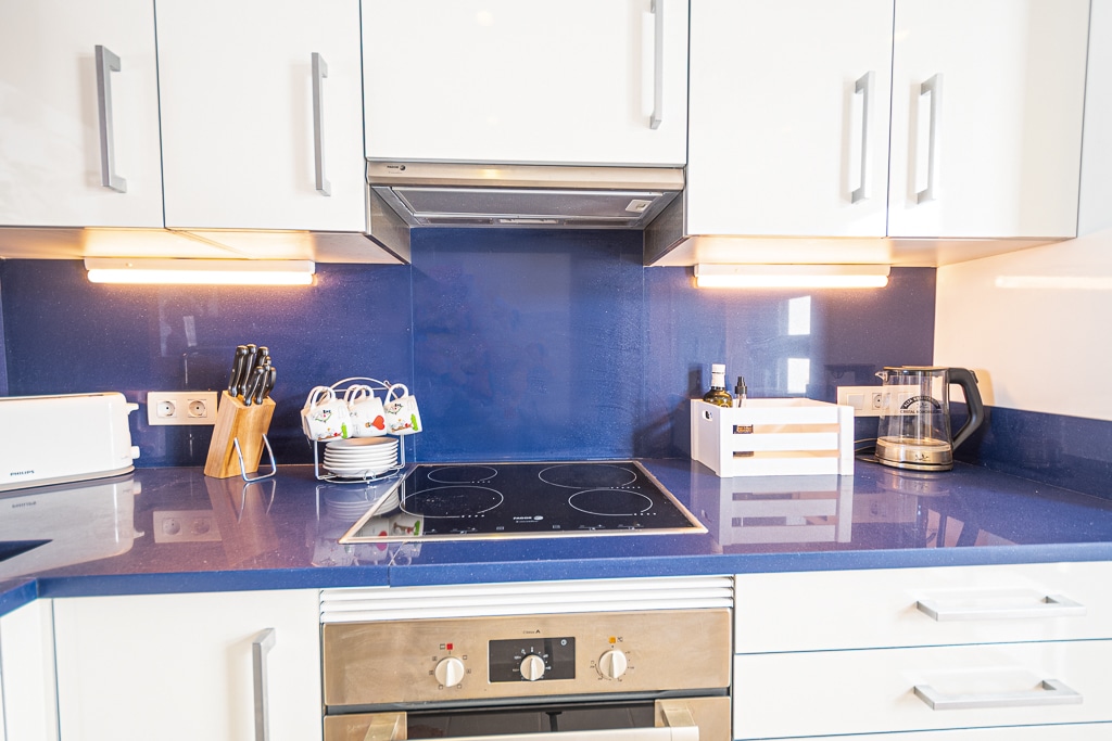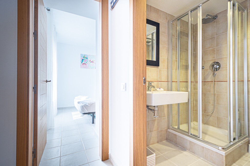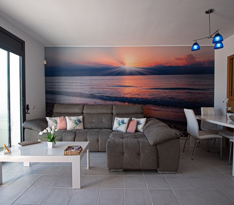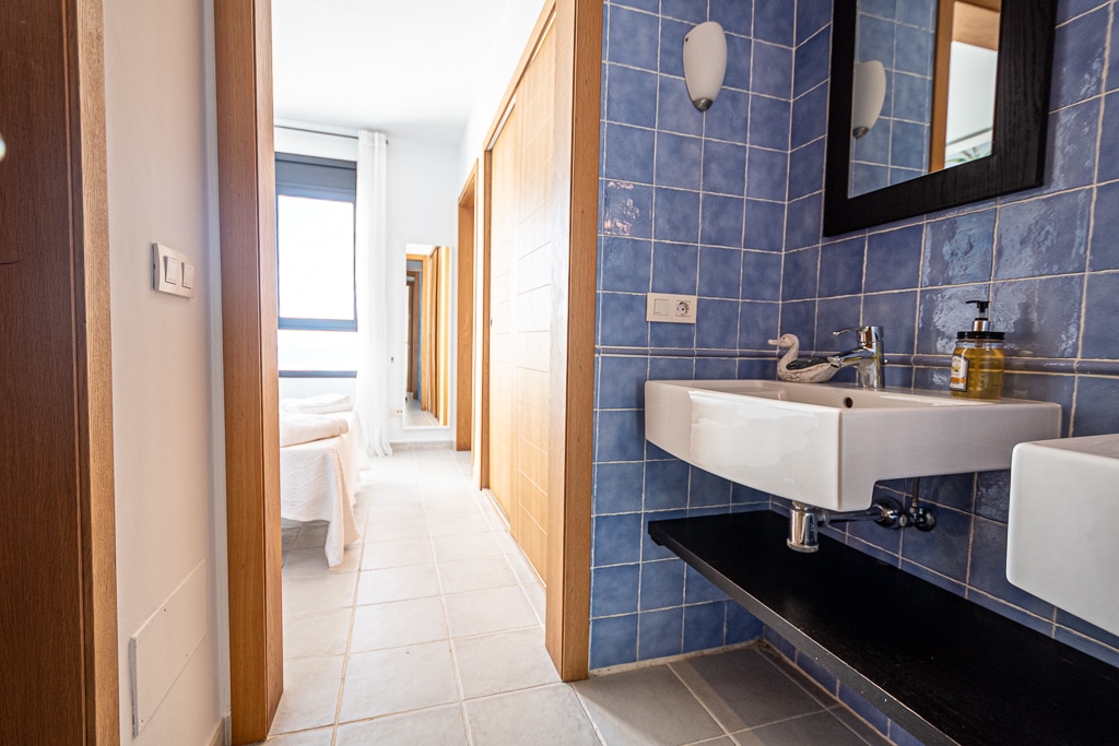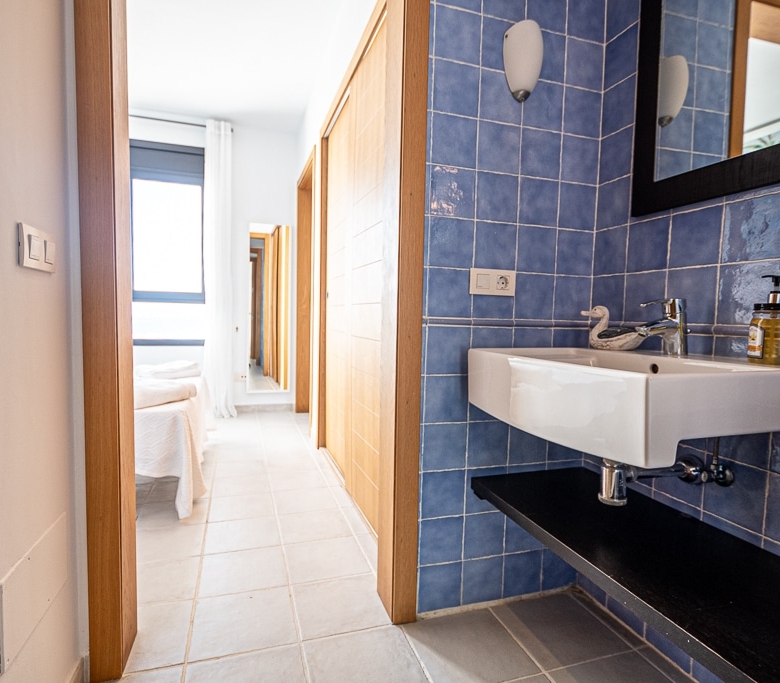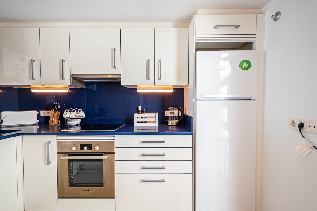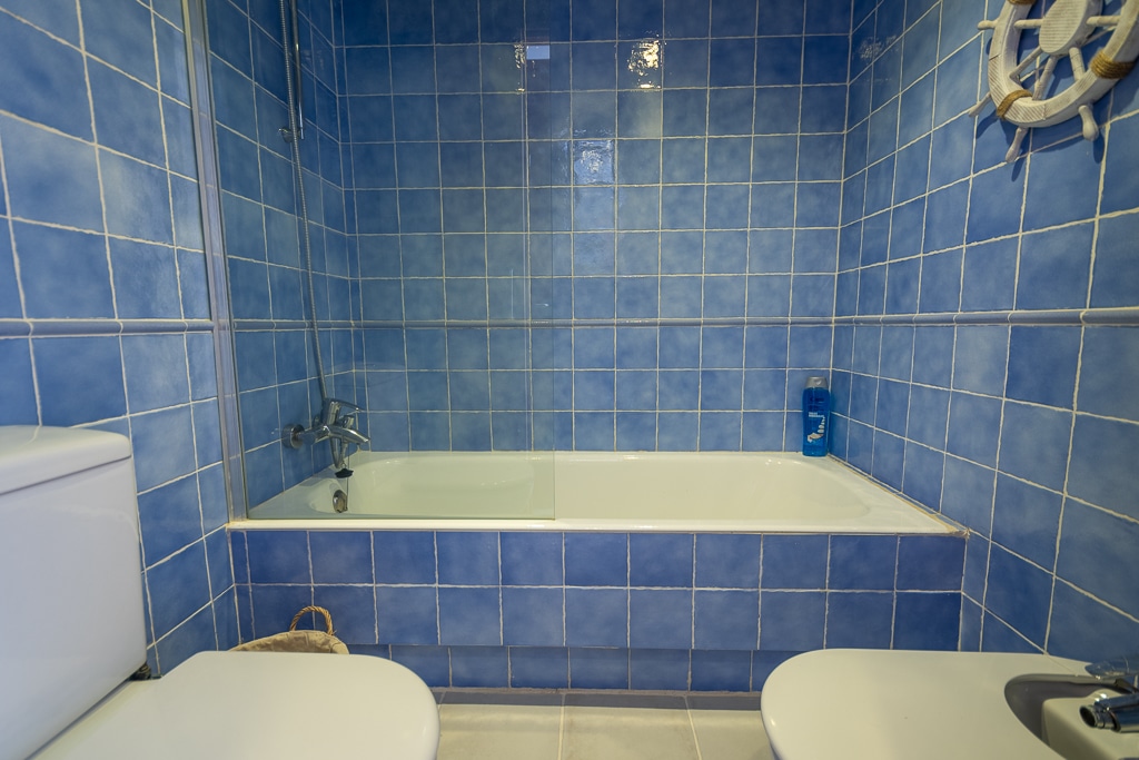 Located on the Playa Macenas Beach Resort, this is a fabulous, air-conditioned, 2 bedroom, 2 bathroom apartment with wifi and wonderful sea views. The Lounge and dining room are well proportioned. The lounge area has a sofas coffee table and 58″ Flat Screen TV (UK & Spanish channels). The dining area has a dining table with 4 chairs and a dresser. Patio doors from the lounge to the terrace. Terrace furniture includes a round table and 4 chairs – an ideal place for breakfast, lunch and dinner!