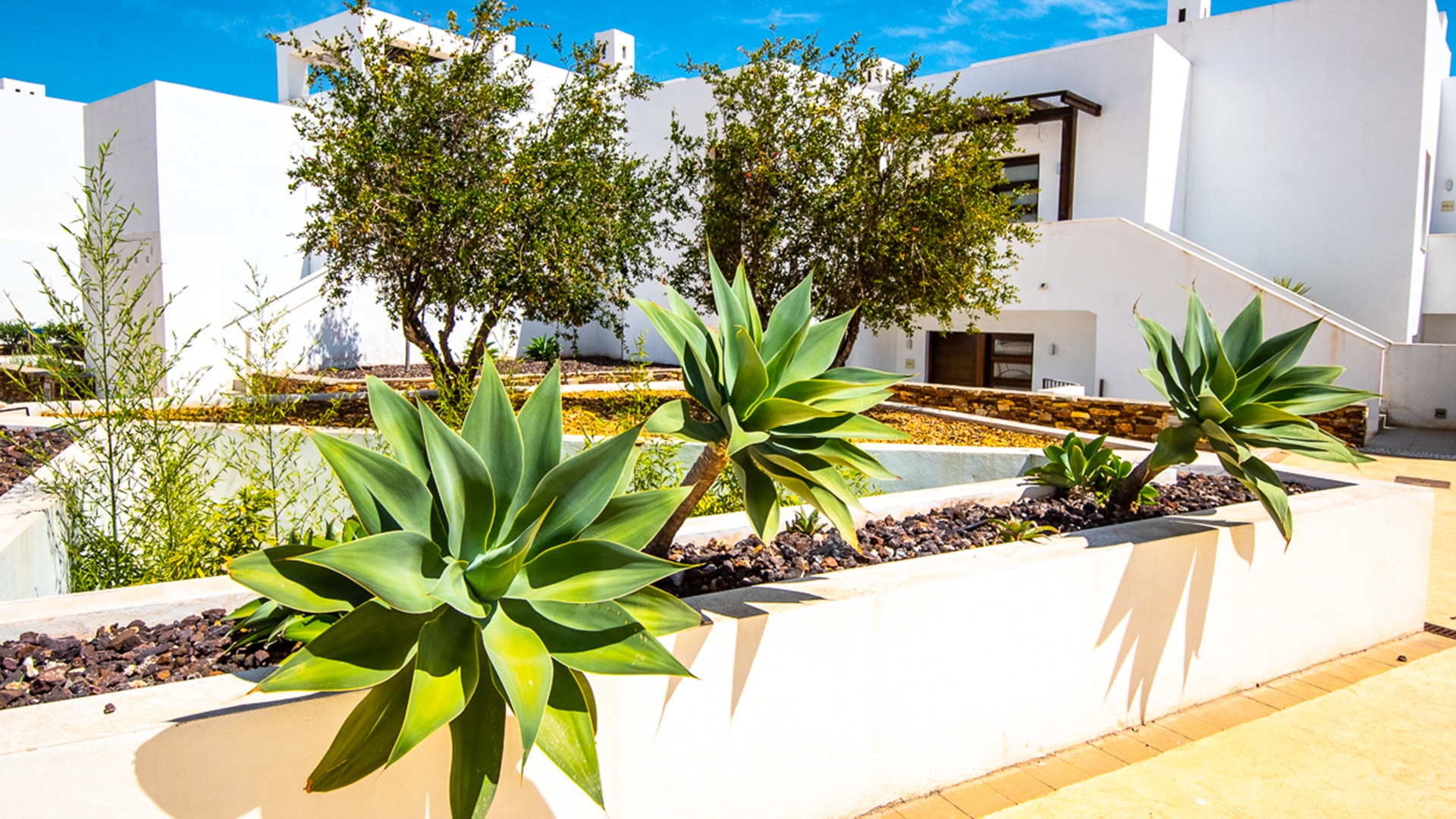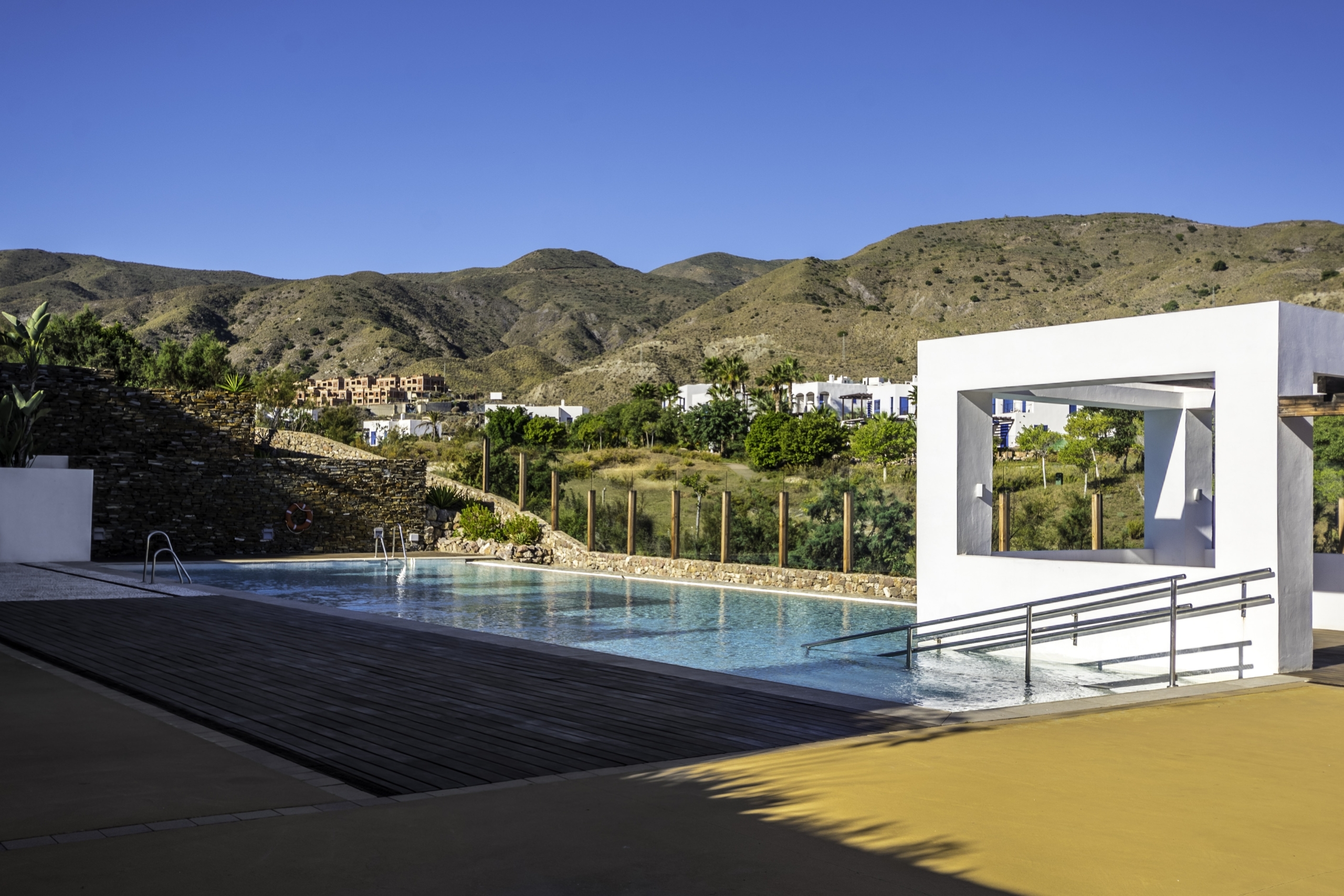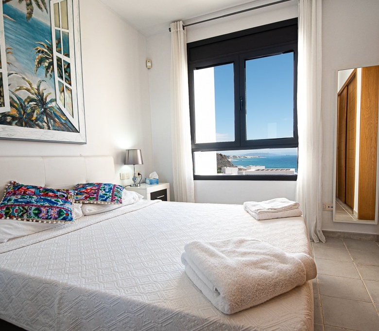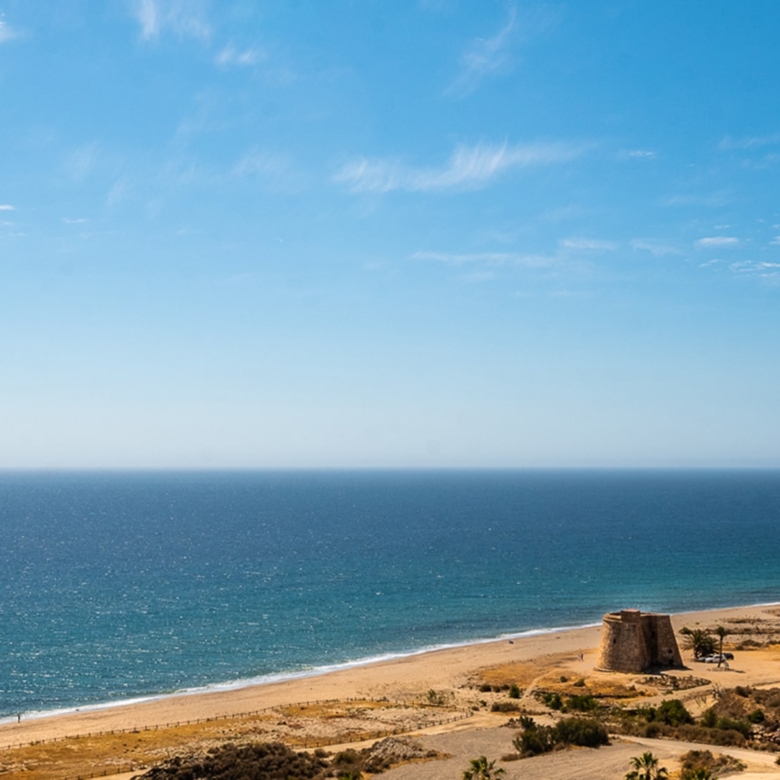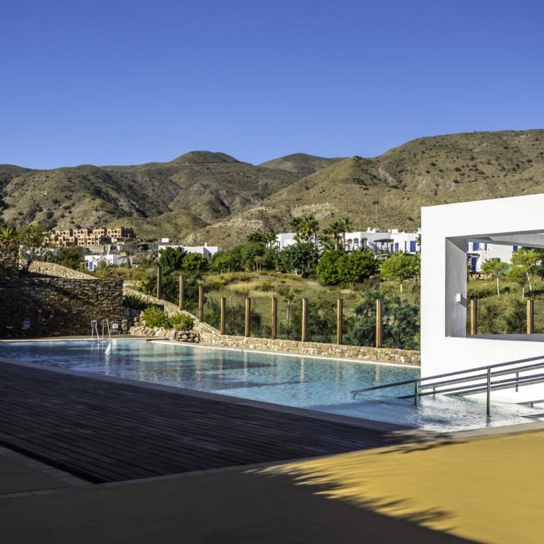 Playa Macenas beach resort is five minutes drive along the coast from our office in Mojacar in the province of Almeria. This is a great location for a family holiday or a golfing break. The complex is quite different than the majority found in Spain with its superior build, architectural design and high-quality finish. There are many top golf courses within a short drive of the resort including Desert Springs, Valle Des Este and Aguillas. The nightlife of Mojacar provides an endless supply of evening entertainment in the form of restaurants, bars and clubs. For the family there are numerous swimming pools on the resort plus off resort there is 17km of unspoilt beaches to choose from, two great water parks, go-karting and also the mini Hollywood Studios at the Tabernas Desert. The romantic white village of Old Mojacar is perched high on the nearby hilltop.