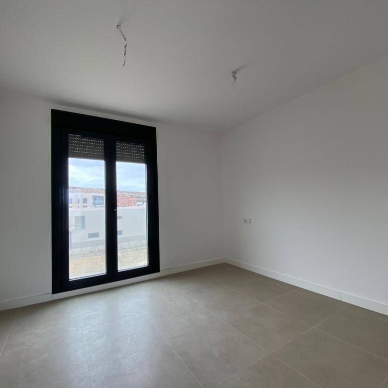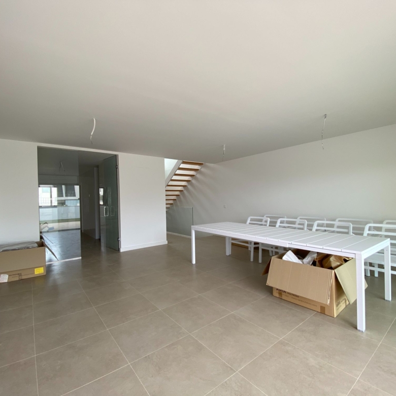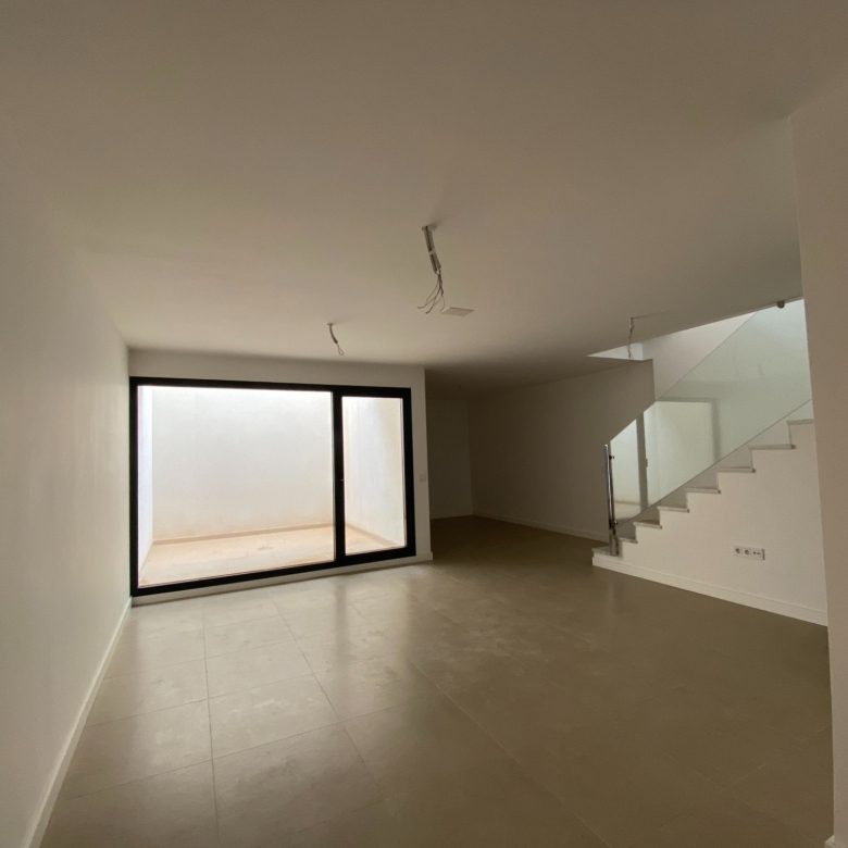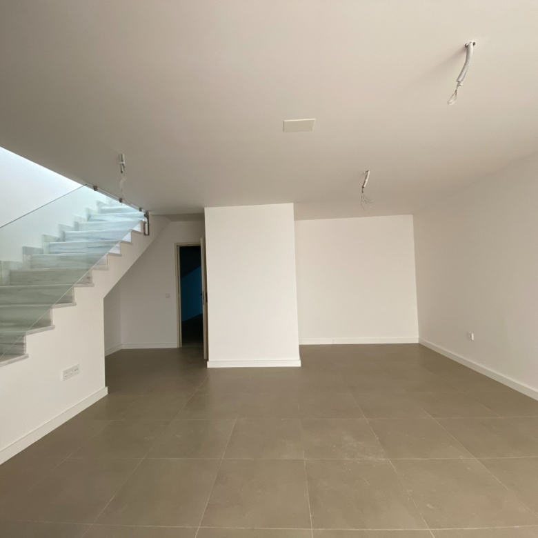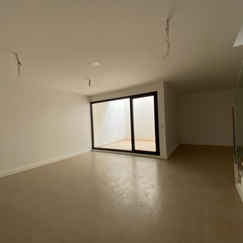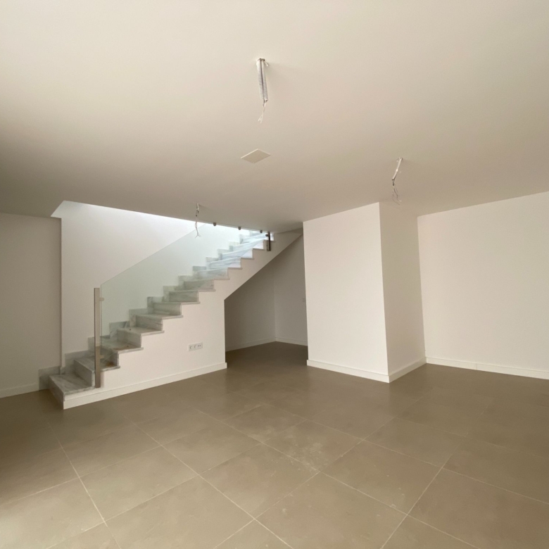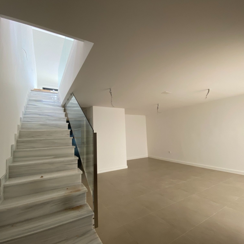 The house is distributed in semi-basement with garage and English patio. On the first floor, we find a toilet, kitchen with utility room and living room with access to a large terrace. On the 2nd and 3rd floor we find the bedrooms and one bathroom on each floor. Located in a quiet and newly built residential area.