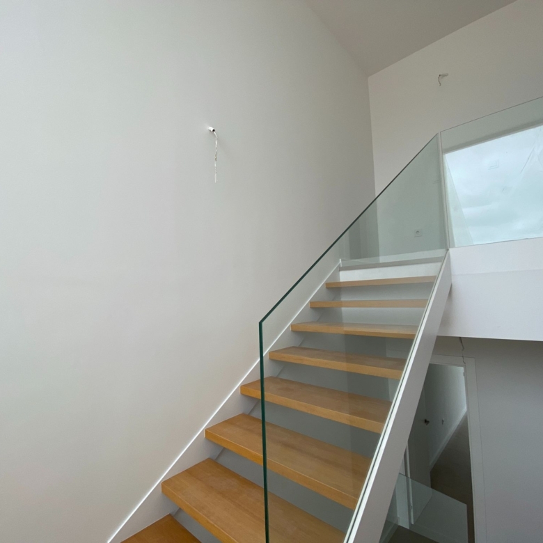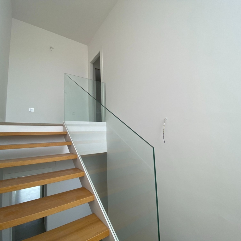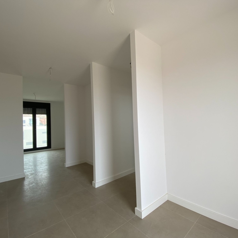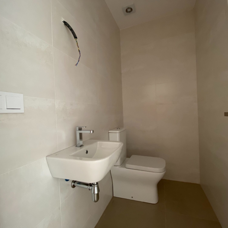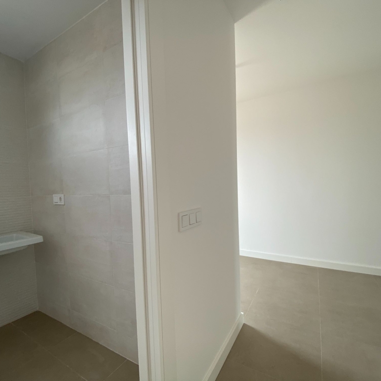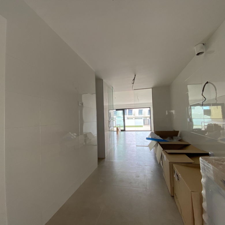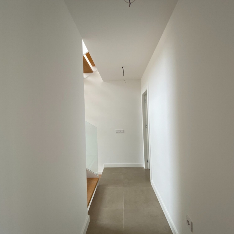 The house is distributed in semi-basement with garage and English patio. On the first floor, we find a toilet, kitchen with utility room and living room with access to a large terrace. On the 2nd and 3rd floor we find the bedrooms and one bathroom on each floor. Located in a quiet and newly built residential area.