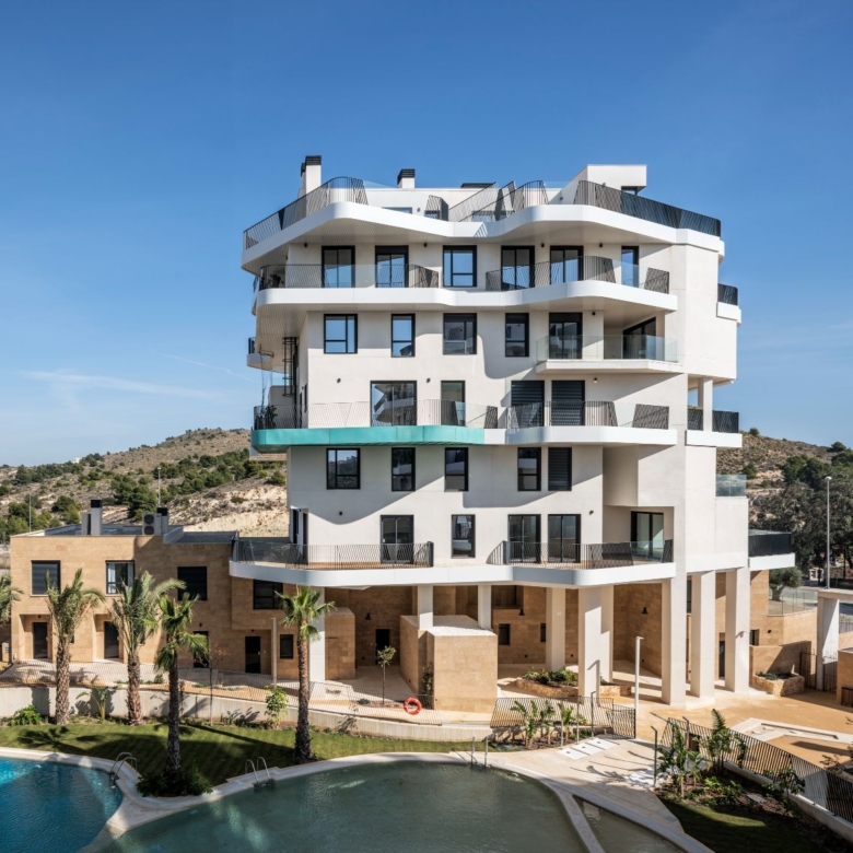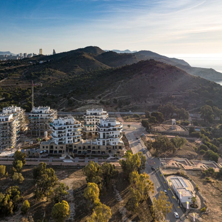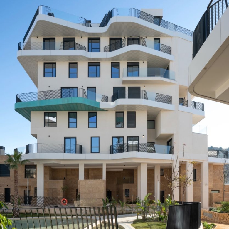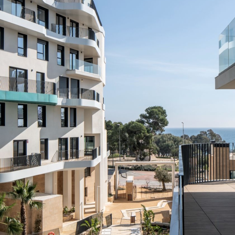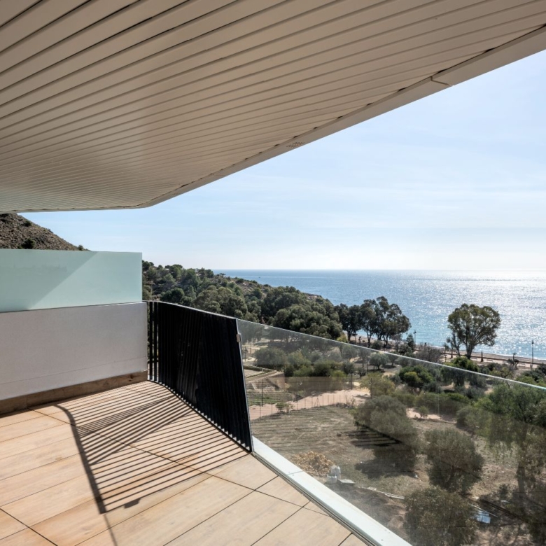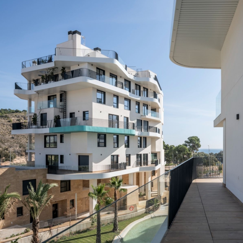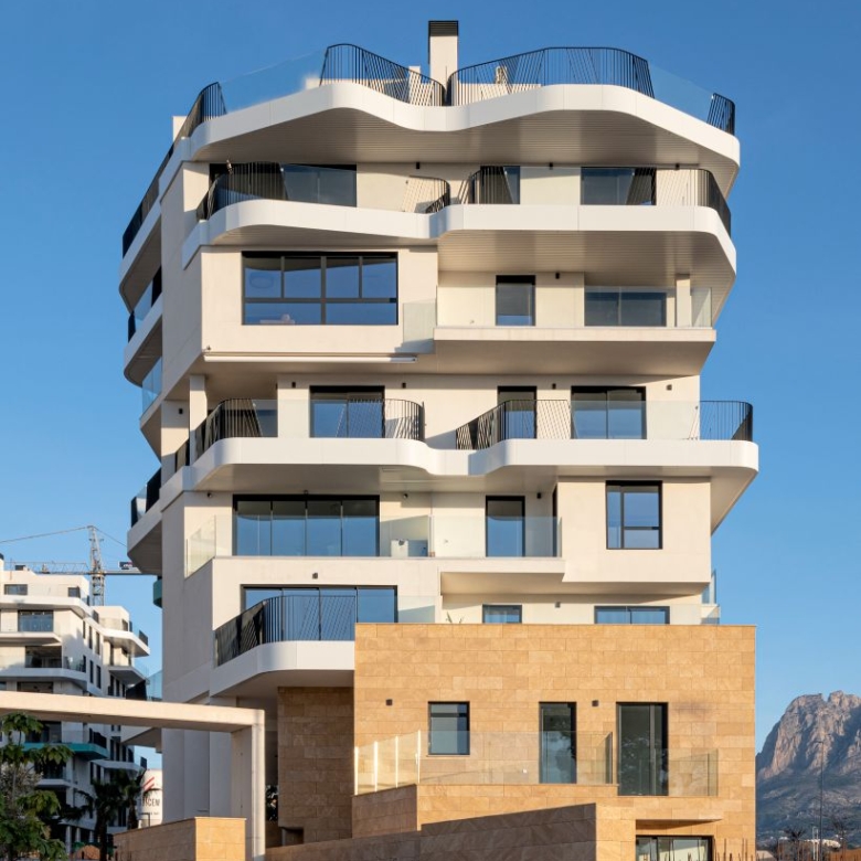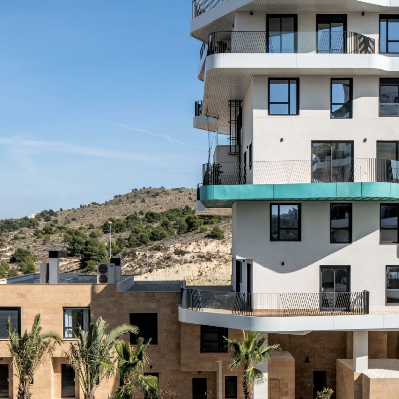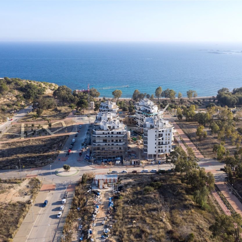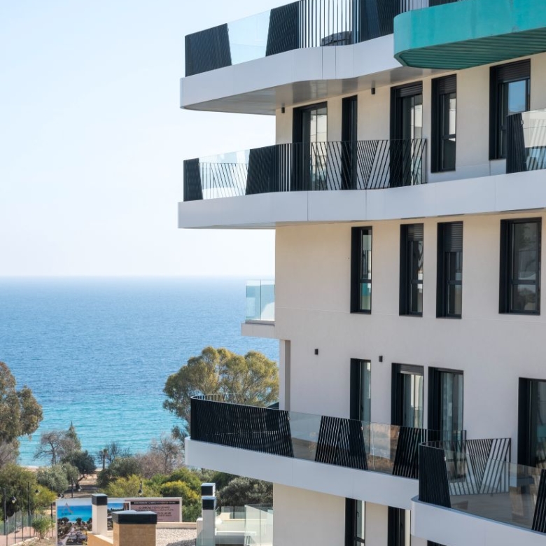 Newly built apartments, duplexes, and penthouses on the beachfront, next to Benidorm and Villajoyosa (Costa Blanca Alicante, Spain). Top-quality properties built with first-class materials such as thermal insulation, Marazzi… Peerless in design with spacious terraces to take in the splendour of the sea views. All the elegant white tower blocks have just six floors and there are vast green areas between them all.