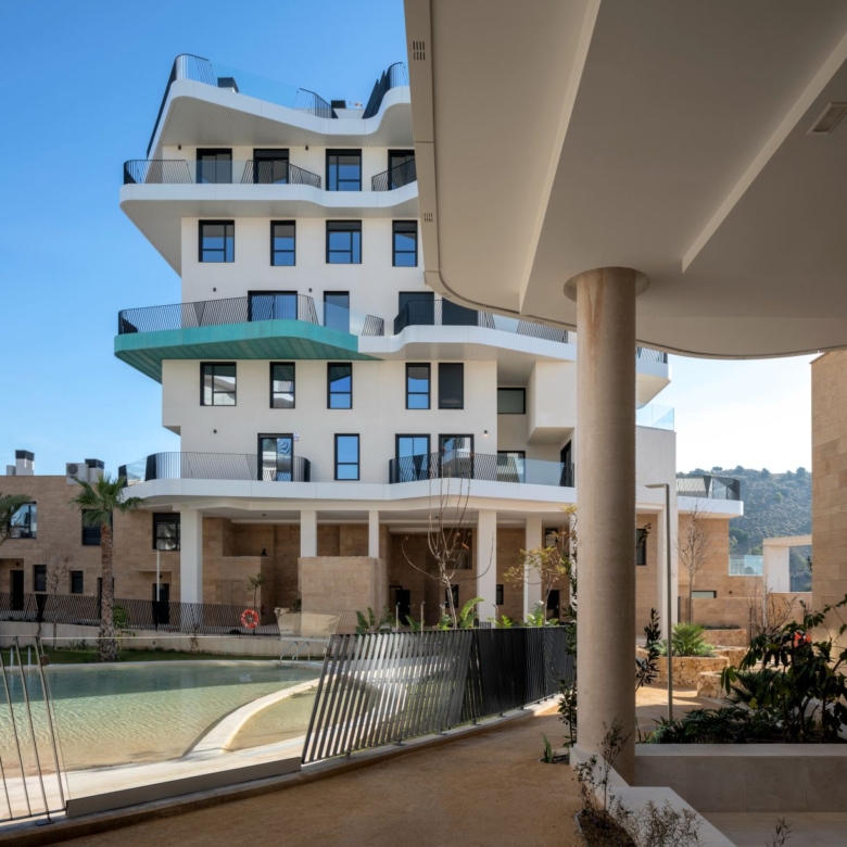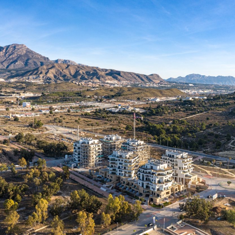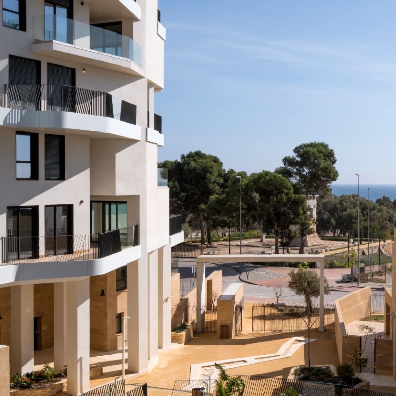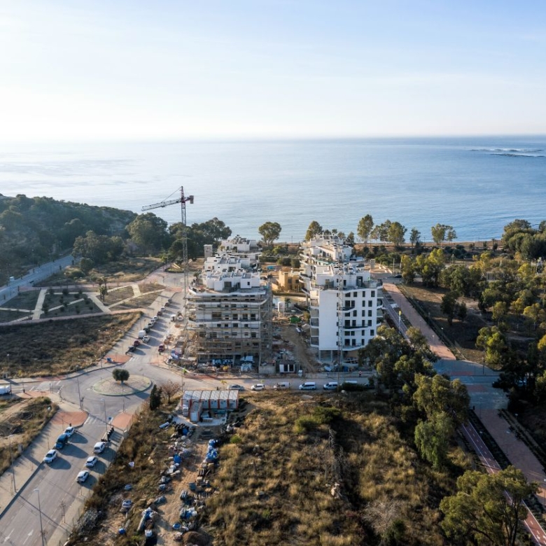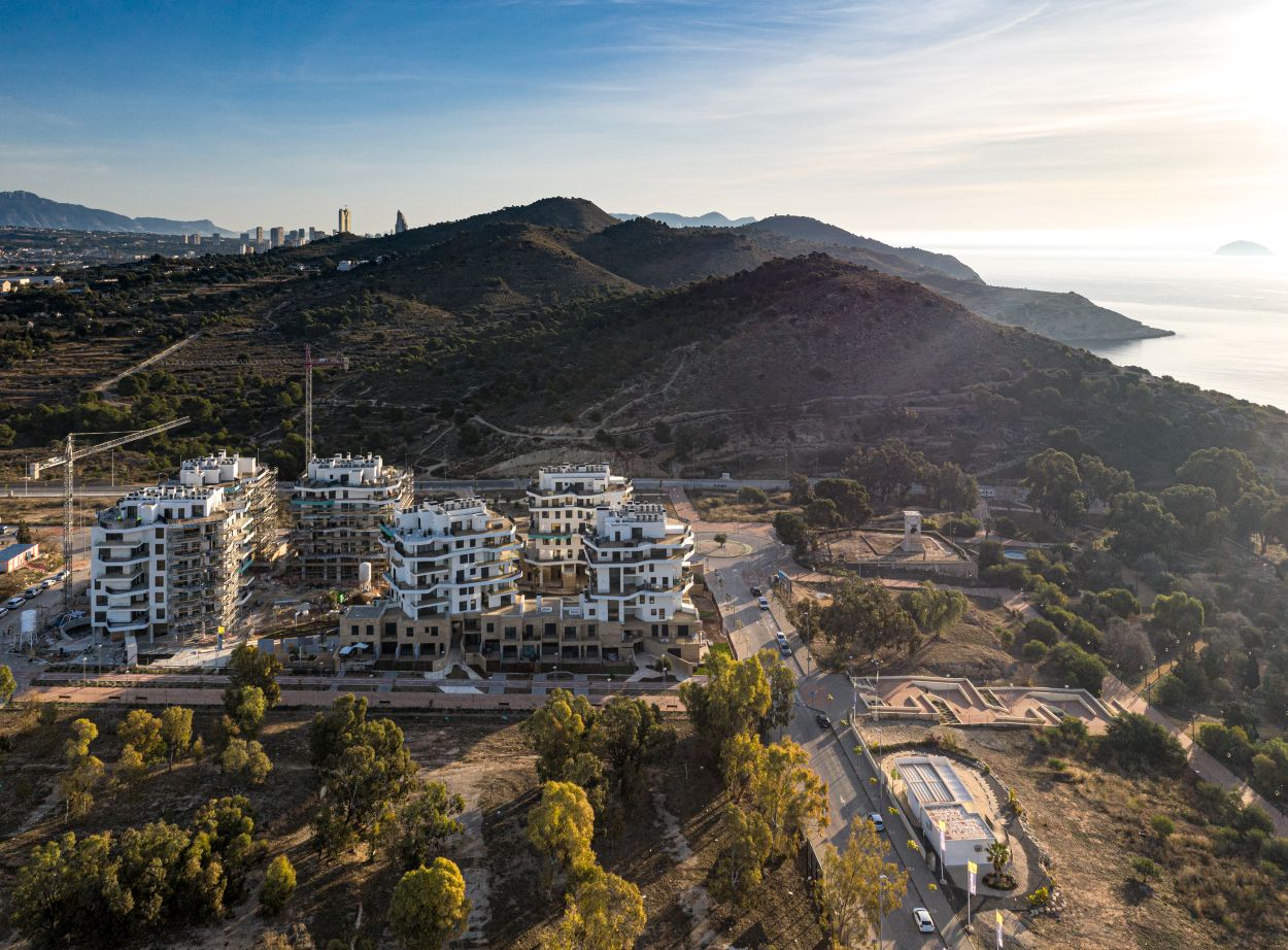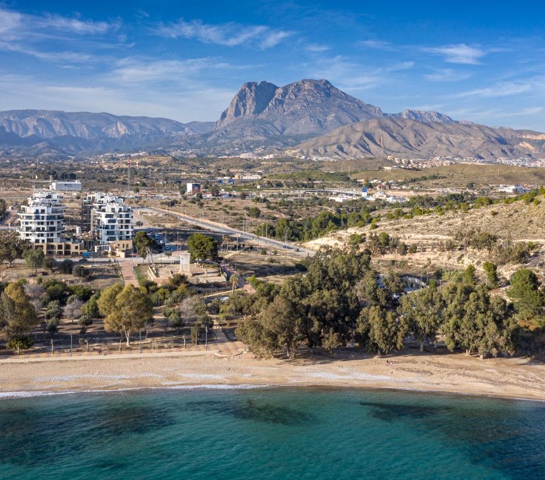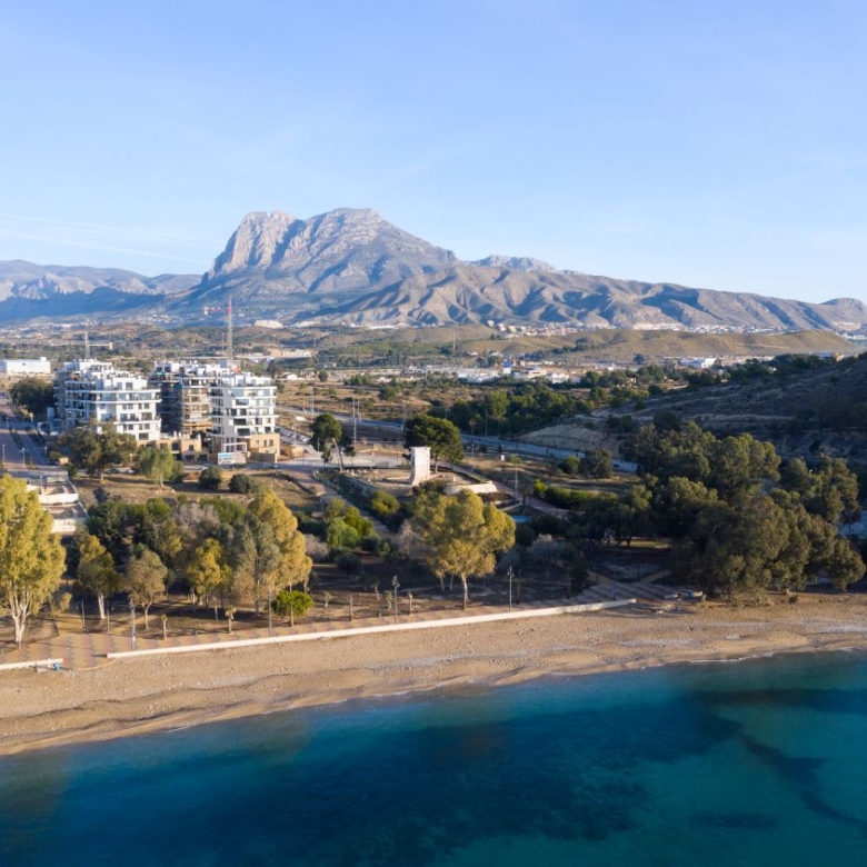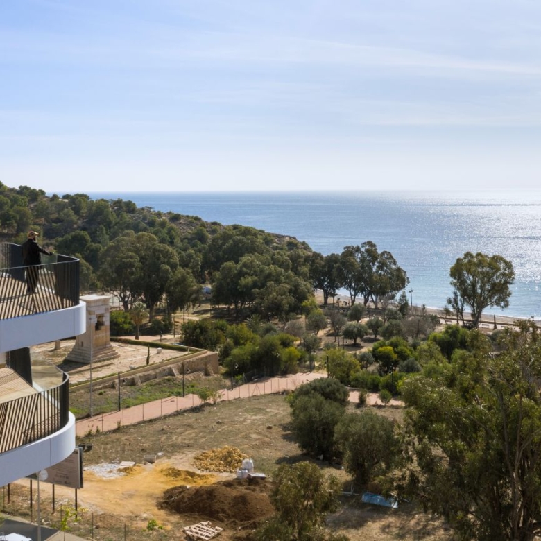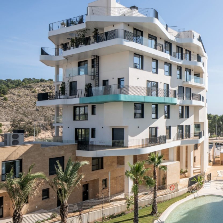 Newly built apartments, duplexes, and penthouses on the beachfront, next to Benidorm and Villajoyosa (Costa Blanca Alicante, Spain). Top-quality properties built with first-class materials such as thermal insulation, Marazzi… Peerless in design with spacious terraces to take in the splendour of the sea views. All the elegant white tower blocks have just six floors and there are vast green areas between them all.
