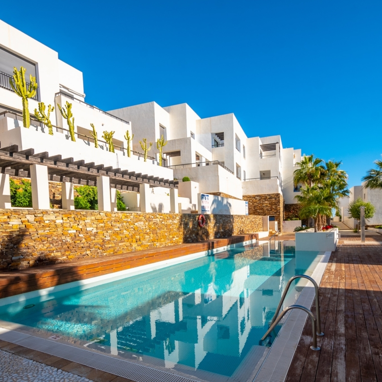 Playa Macenas beach resort is five minutes drive along the coast from Mojacar in the province of Almeria. This is a great location for a family holiday or a golfing break. The complex is quite different from the majority found in Spain with its superior build, architectural design, and high-quality finish. There are many top golf courses within a short drive of the resort including Desert Springs, Valle Des Este, and Aguillas. The nightlife of Mojacar provides an endless supply of evening entertainment in the form of restaurants, bars, and clubs. For the family there are numerous swimming pools on the resort plus off the resort there is 17 km of unspoiled beaches to choose from, two great water parks, go-karting and also the mini Hollywood Studios at the Tabernas Desert. The romantic white village of Old Mojacar is perched high on the nearby hilltop.