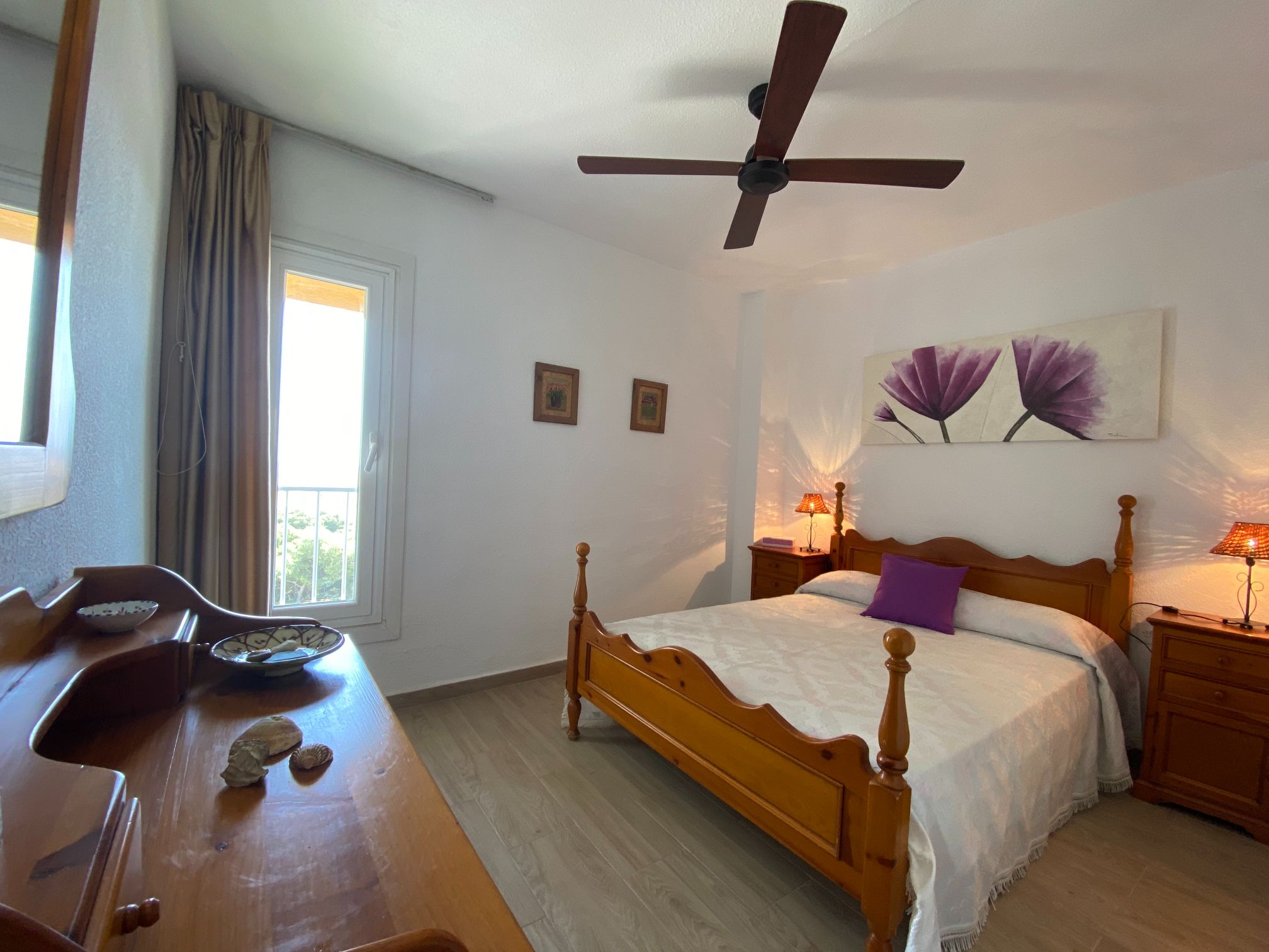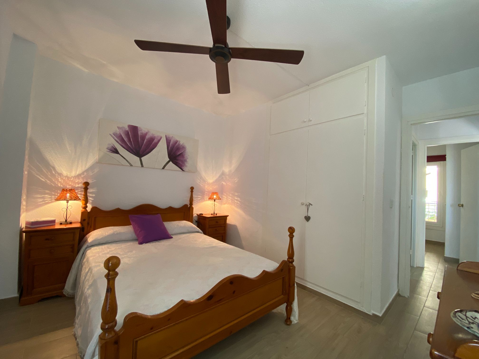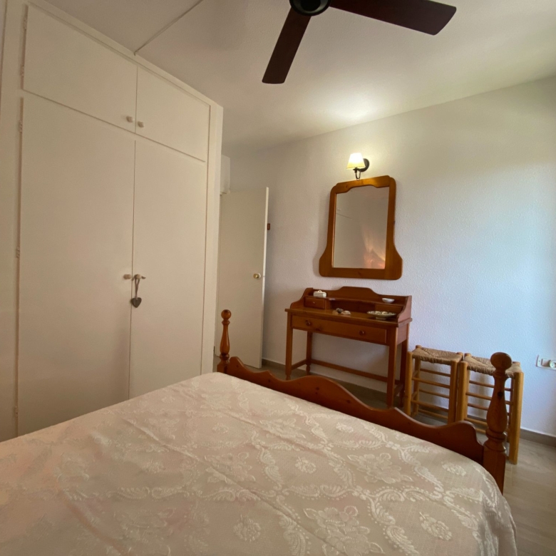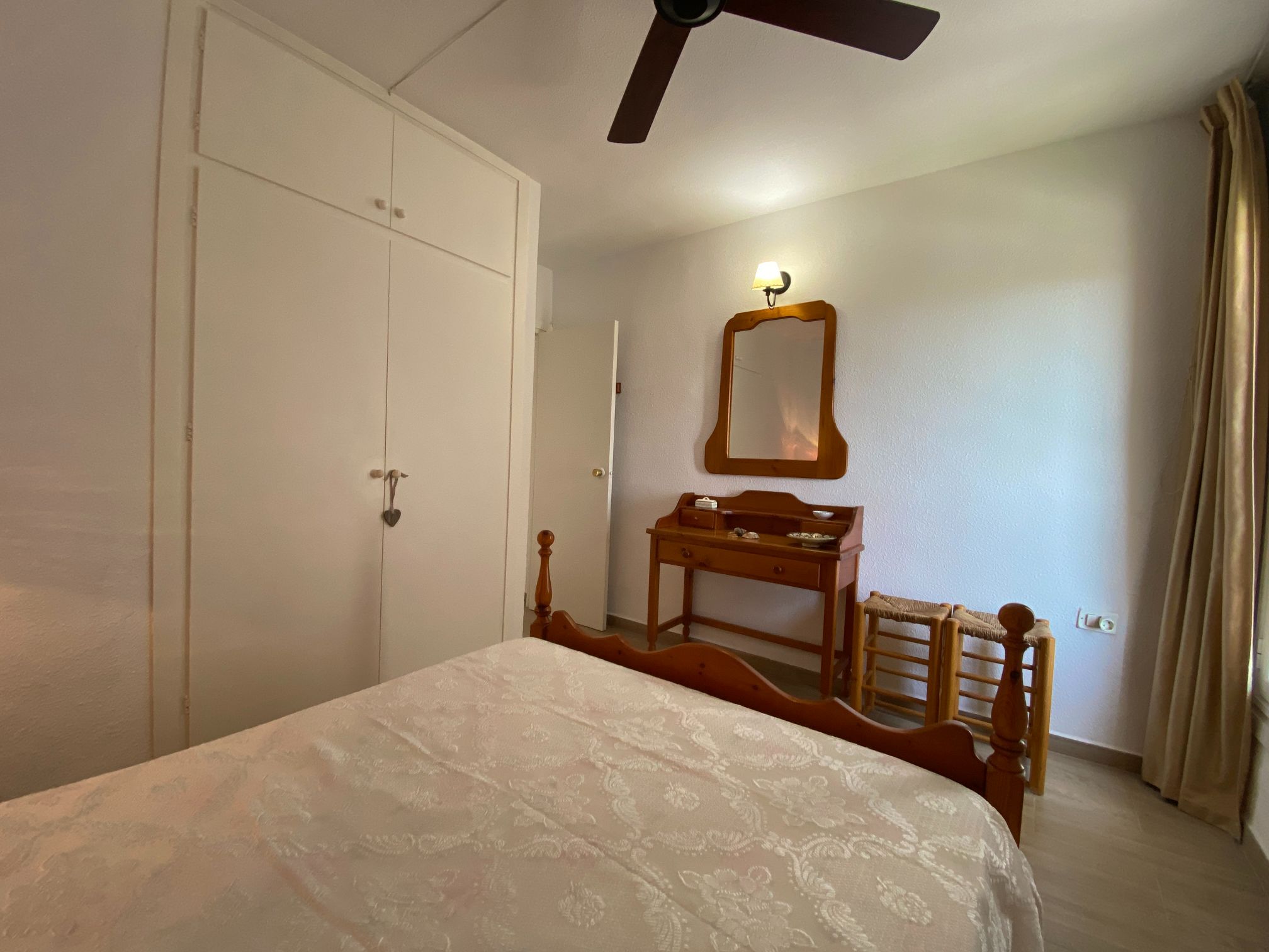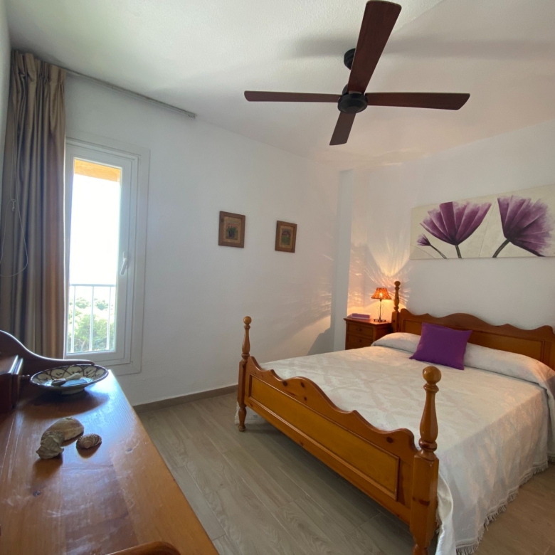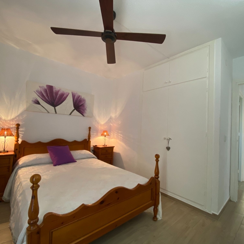 The apartment has two spacious bedrooms with fitted wardrobes, one with a large bed, ceiling fan and beautiful sea views.