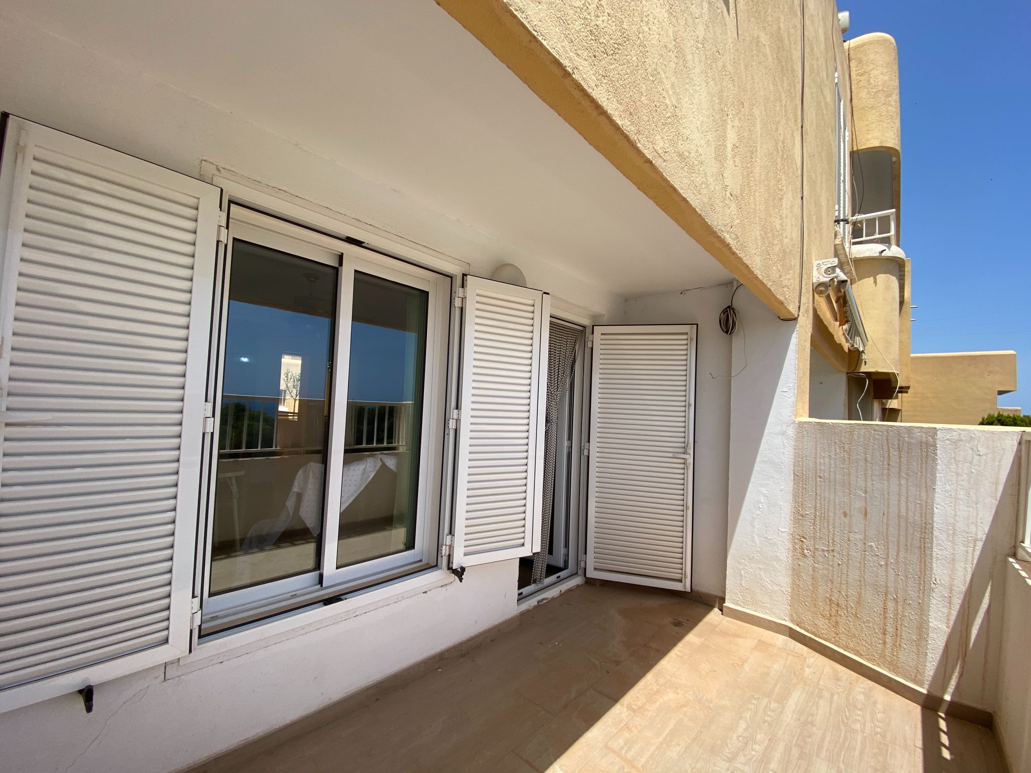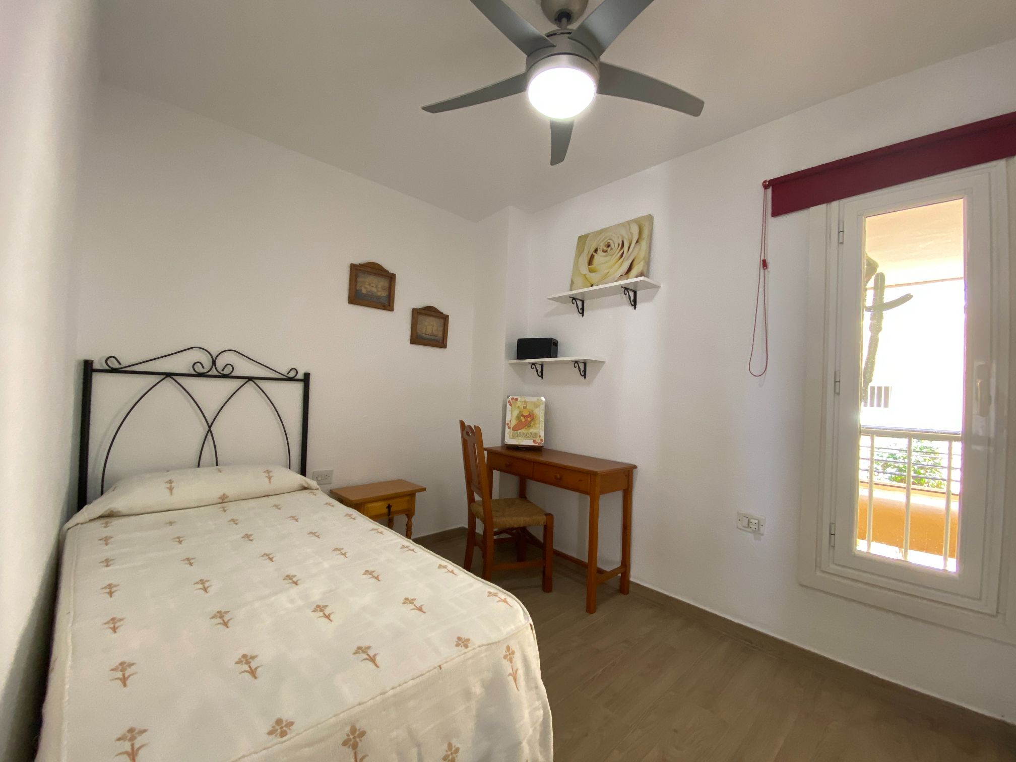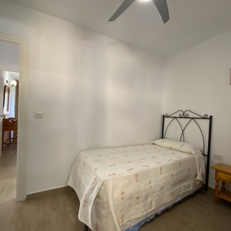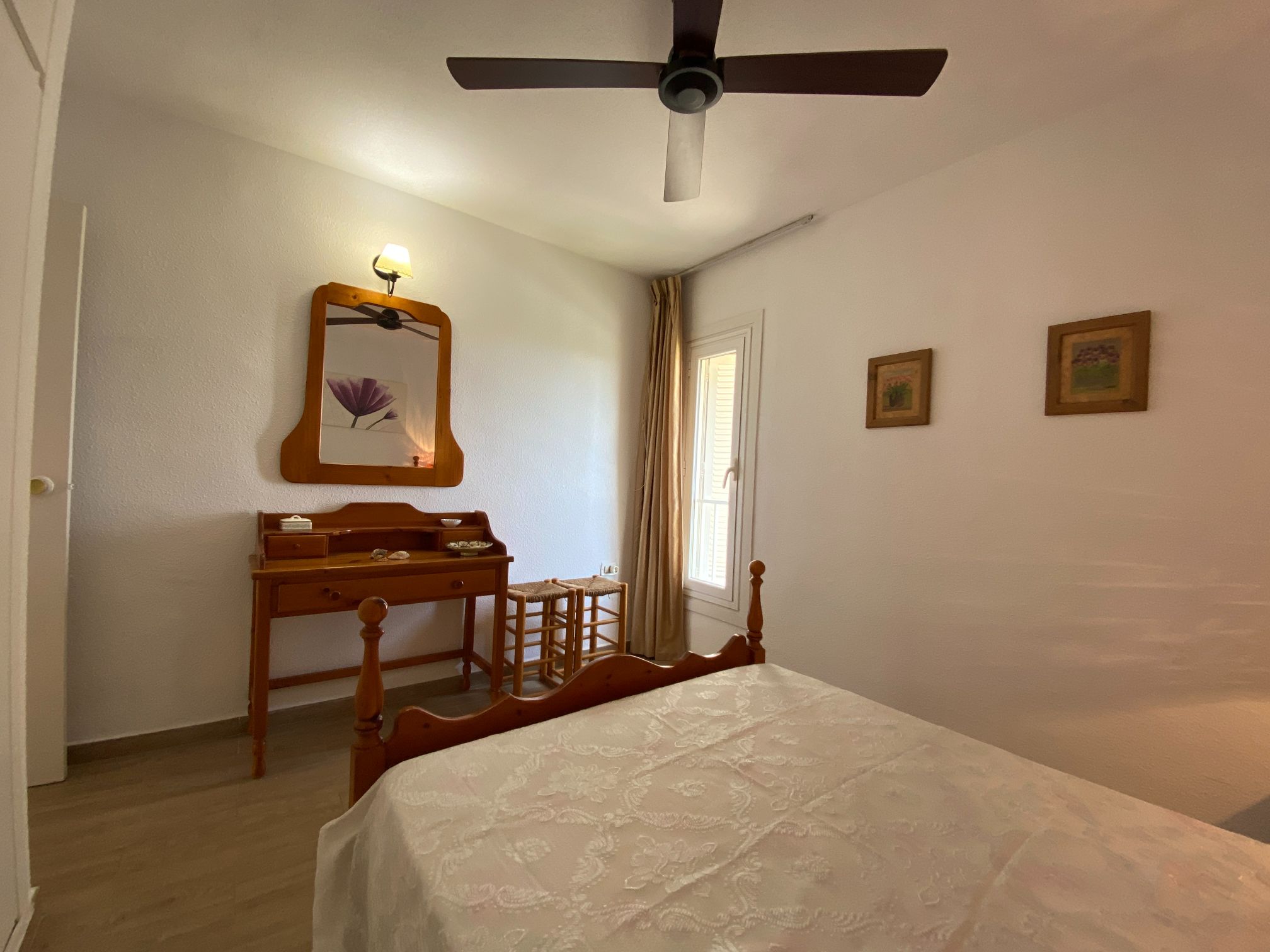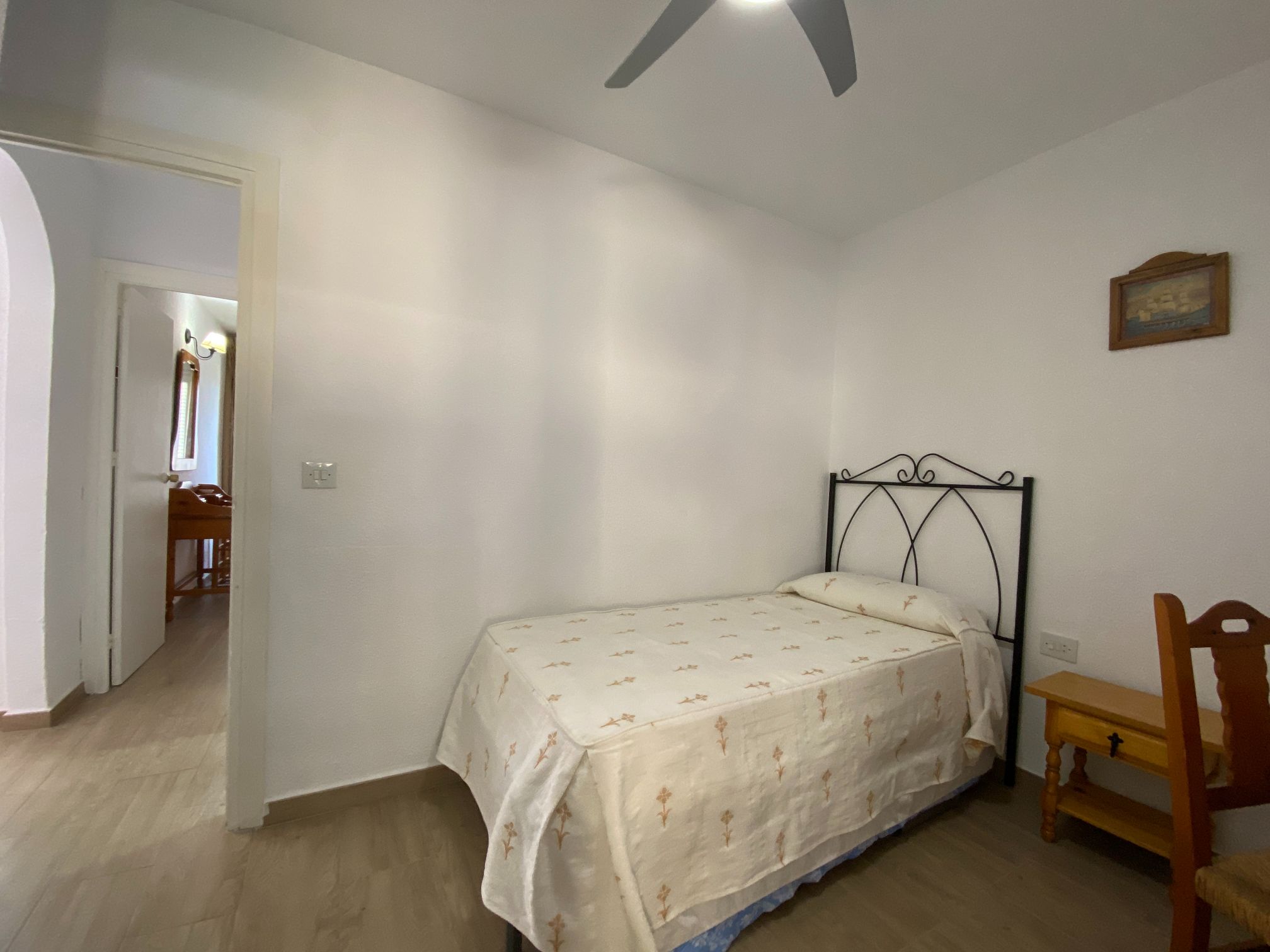 The apartment has two spacious bedrooms with fitted wardrobes, one with a large bed, ceiling fan and beautiful sea views.