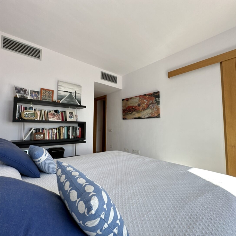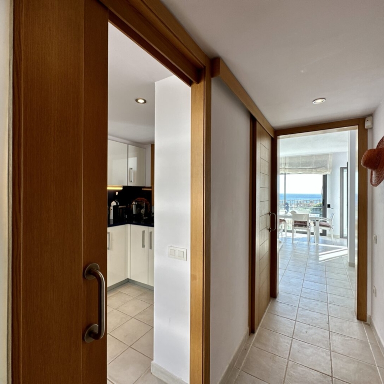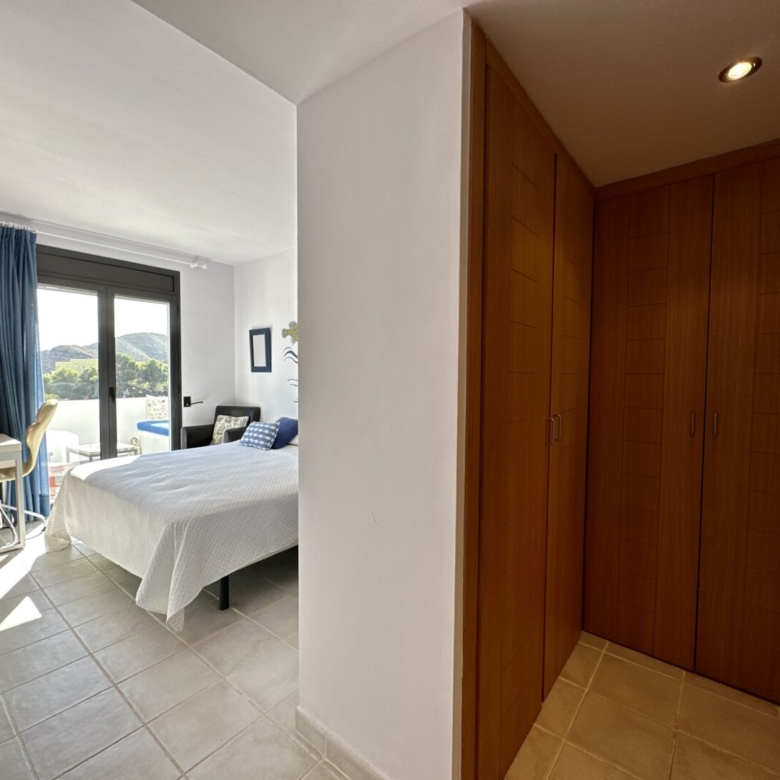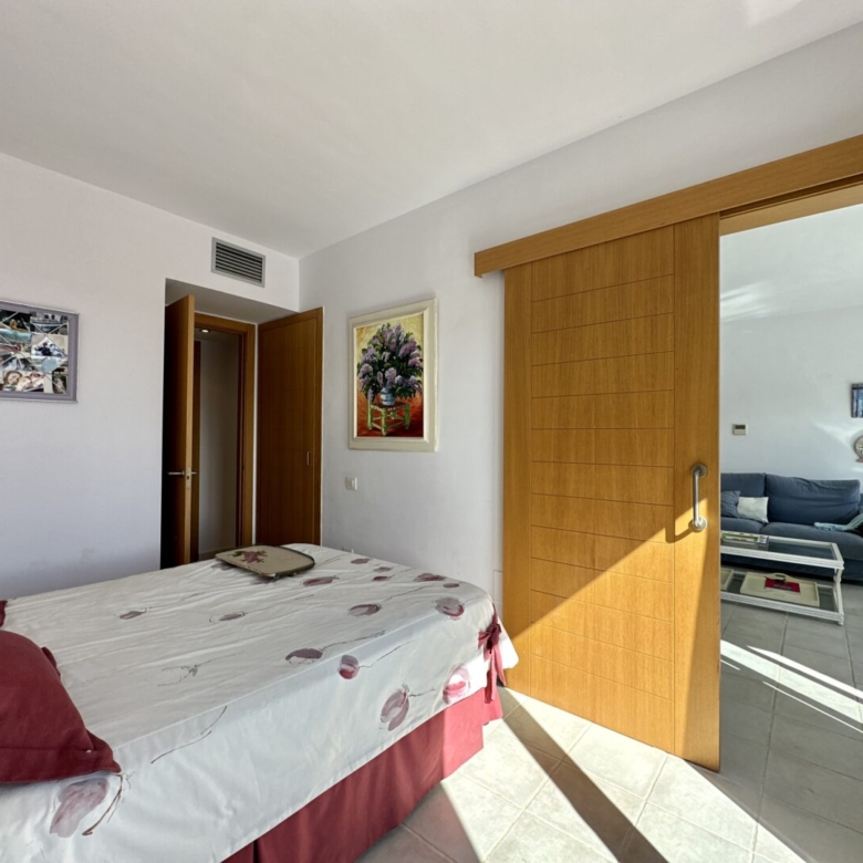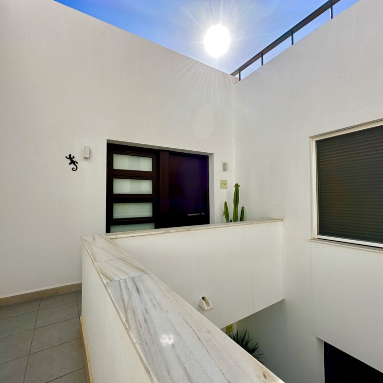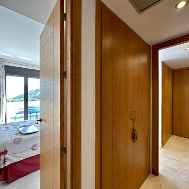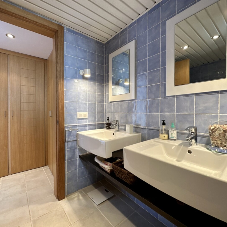Access to the apartment is via a staircase that leads to the main door. Inside, you’ll find three double bedrooms, with the master bedroom featuring an en-suite bathroom. The master bathroom has a unique design, with separate access from a Jack and Jill arrangement and includes its own sinks with a built-in dressing/wardrobe area. Two of the three bedrooms offer fantastic sea views and direct access to the terrace.