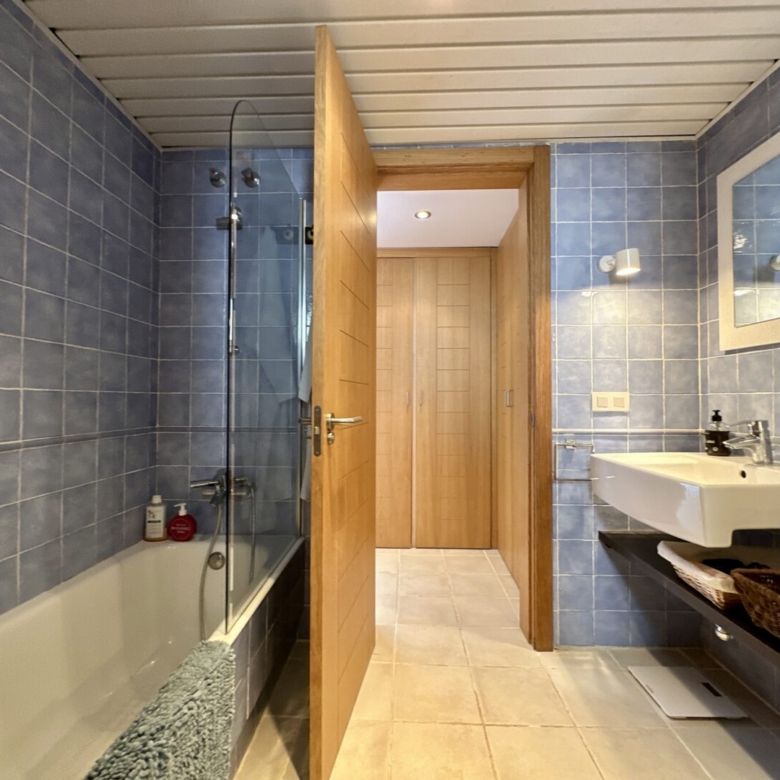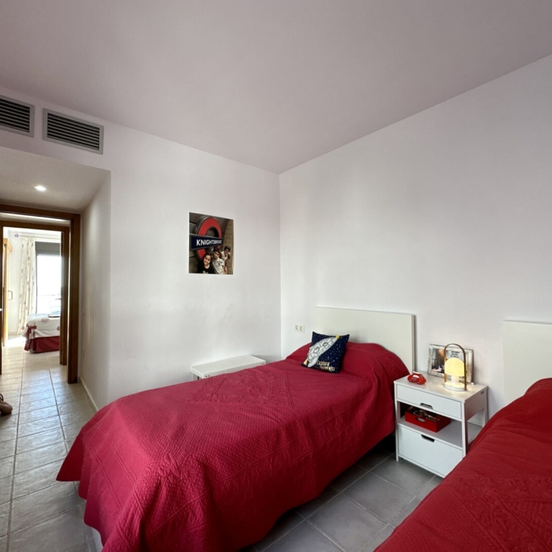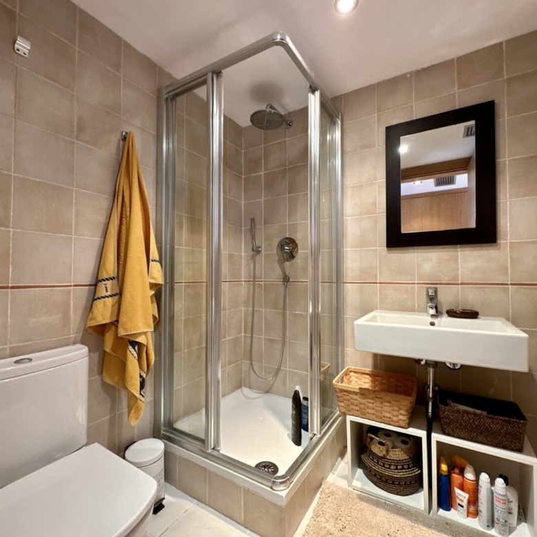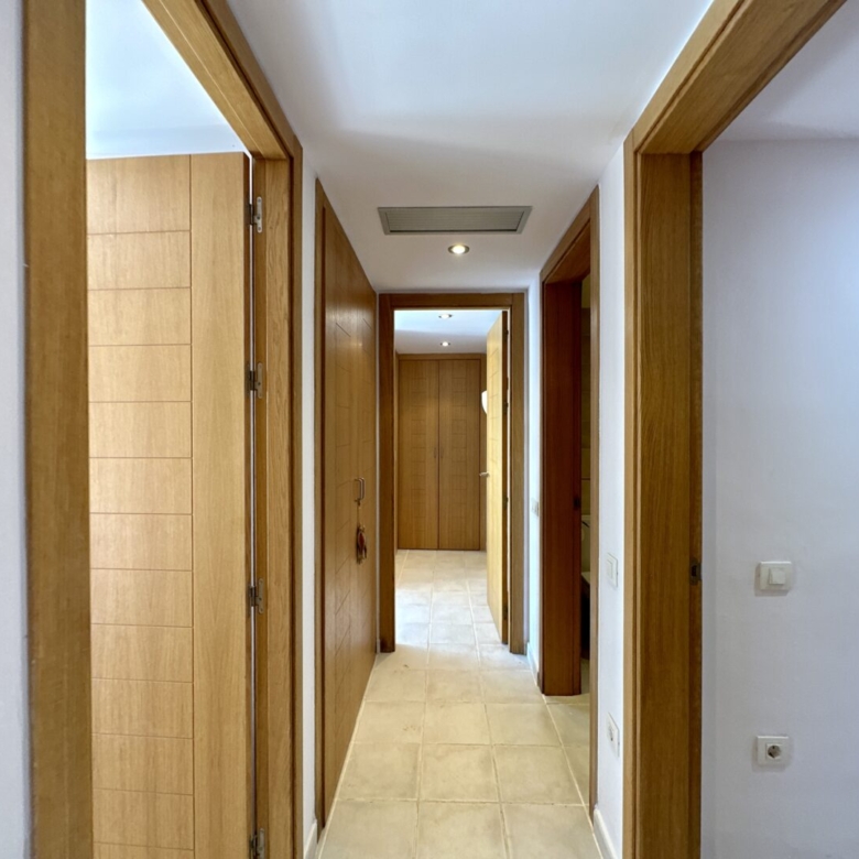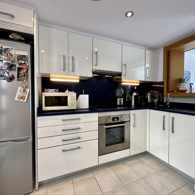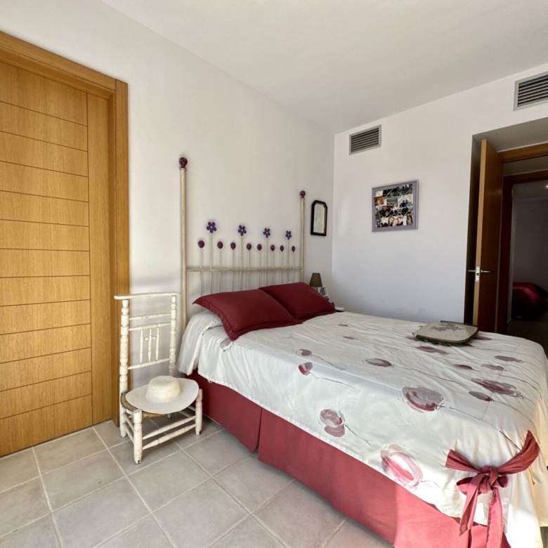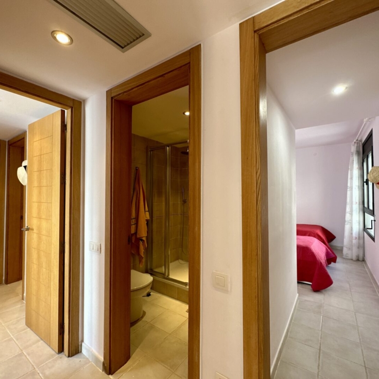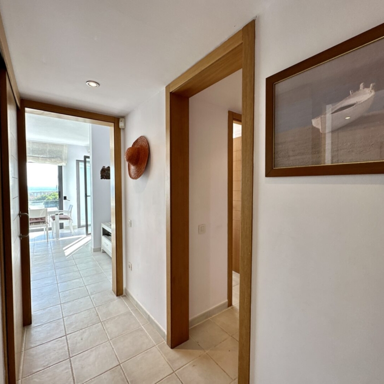 Access to the apartment is via a staircase that leads to the main door. Inside, you’ll find three double bedrooms, with the master bedroom featuring an en-suite bathroom. The master bathroom has a unique design, with separate access from a Jack and Jill arrangement and includes its own sinks with a built-in dressing/wardrobe area. Two of the three bedrooms offer fantastic sea views and direct access to the terrace.