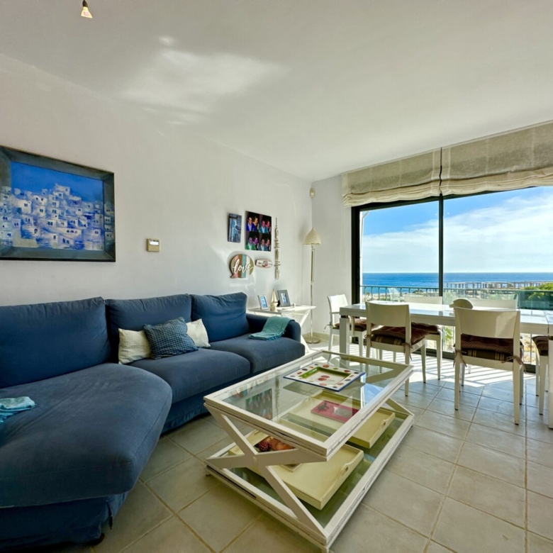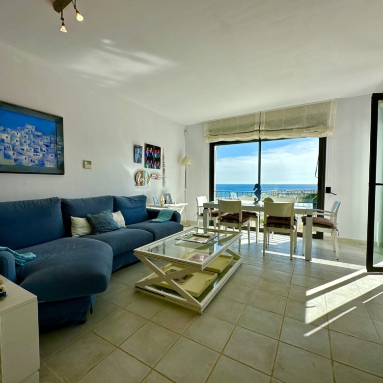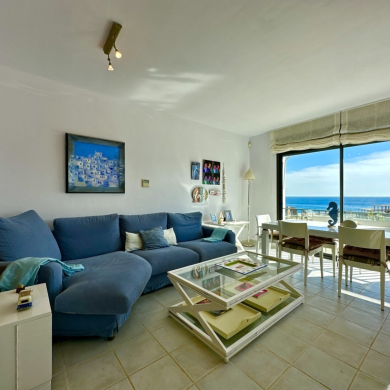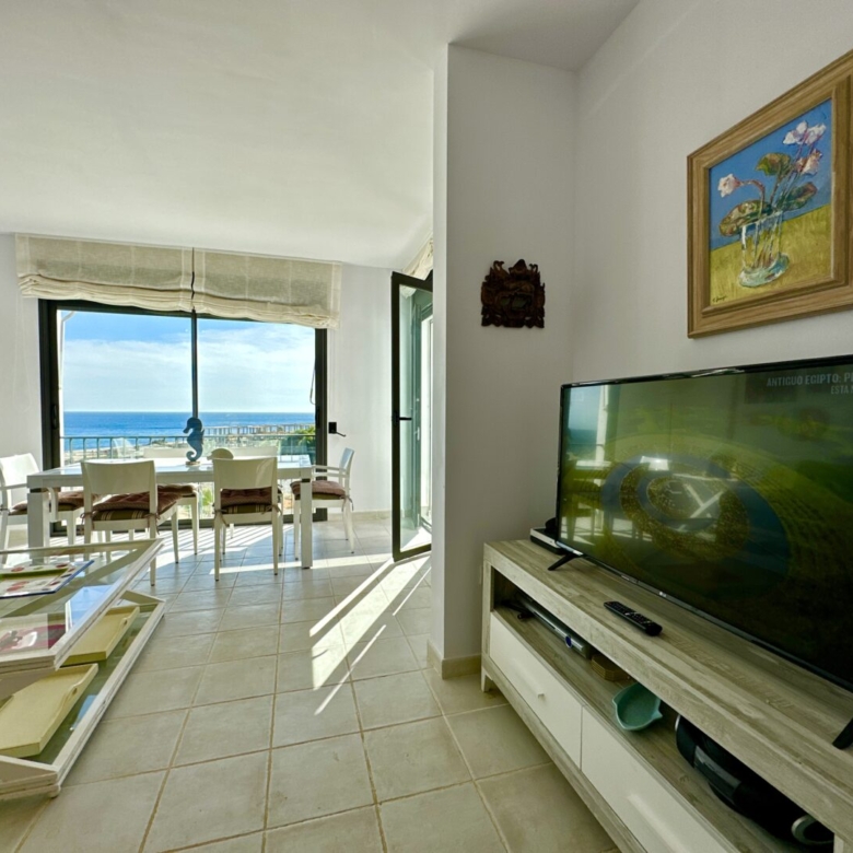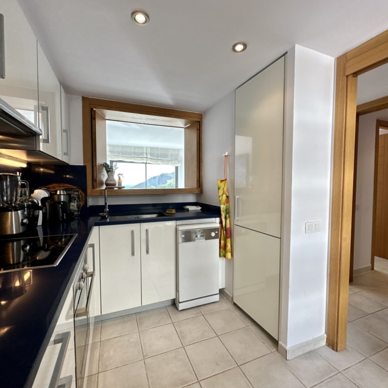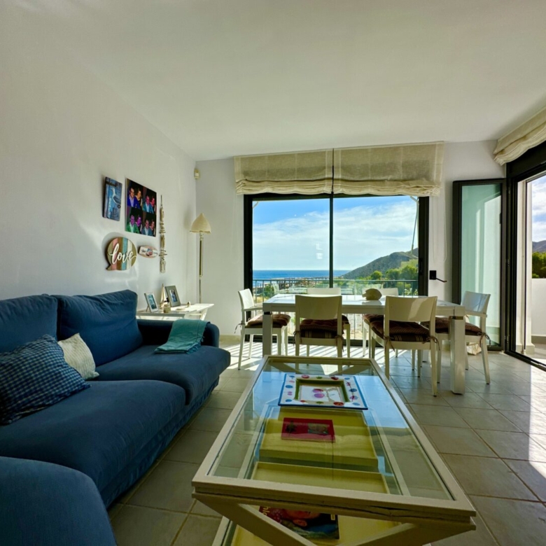 As you enter the spacious living room, you’ll be greeted by an abundance of natural light. The apartment comprises an entrance hallway, a modern fully-equipped independent kitchen with a serving hatch, and a roomy living/dining area with large windows that frame the lush green landscapes of the beach. An awning on the terrace ensures that you can enjoy the sun or shade at any time of the day. Day or night, the sea and mountain views from this apartment are simply stunning.