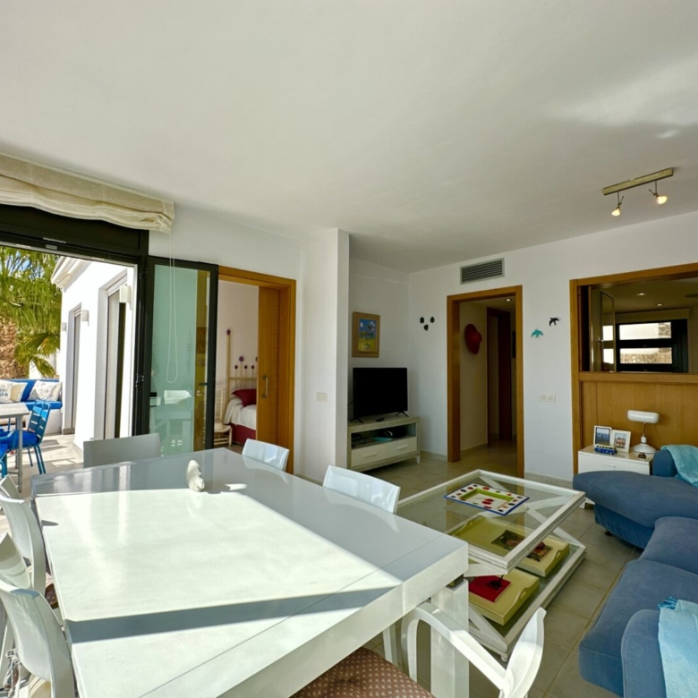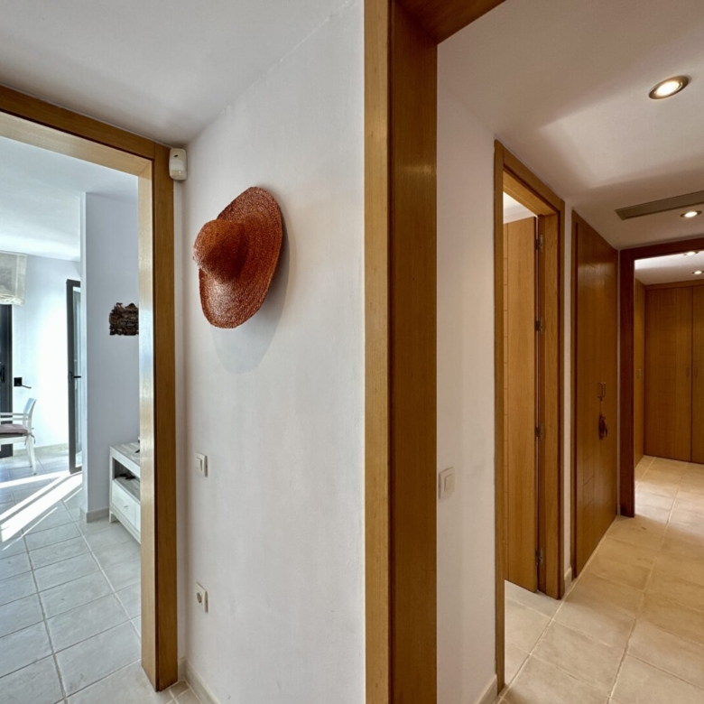 The apartment is strategically located near one of the community swimming pools. The design of the complex is inspired by the charm of an Andalusian village, with white houses nestled among meadows and rocks, under the vast sky and beside the sea. The houses are arranged on staggered levels, resembling the architecture of a traditional Pueblo. Cobblestone paths, wooden terraces, and red bricks lead to expansive communal garden courtyards with large swimming pools, which serve as the communal focal point in this ‘village.’