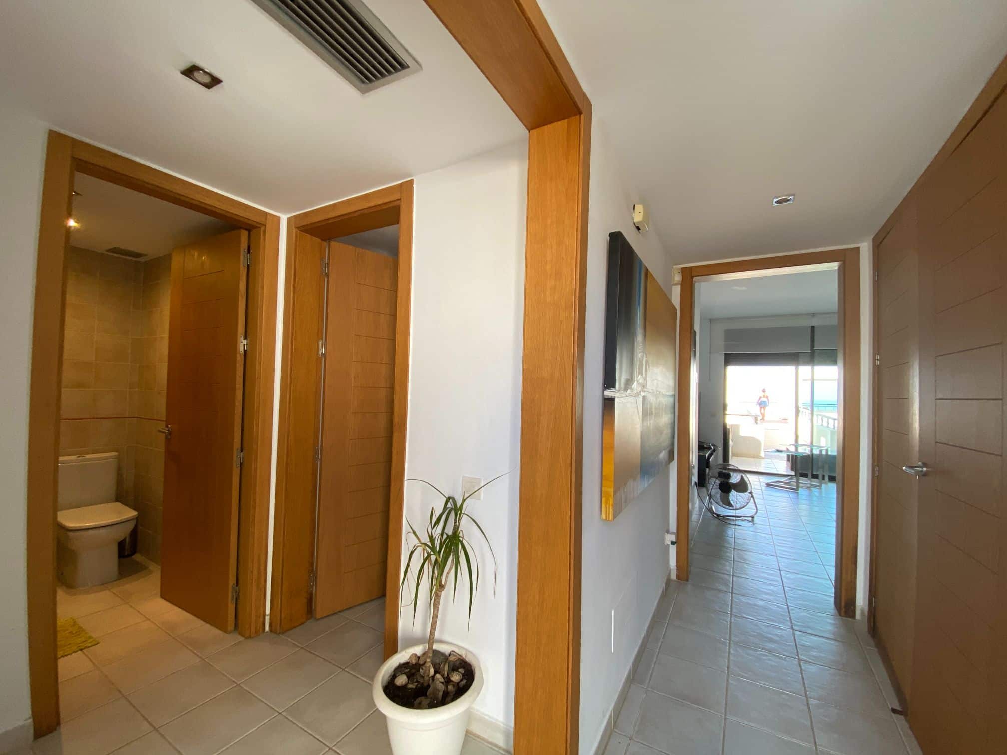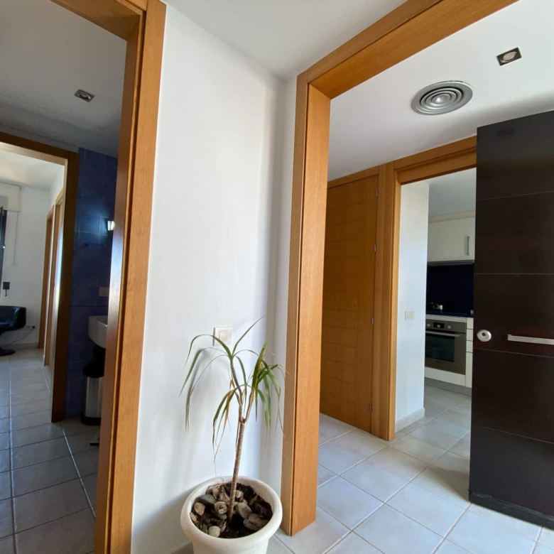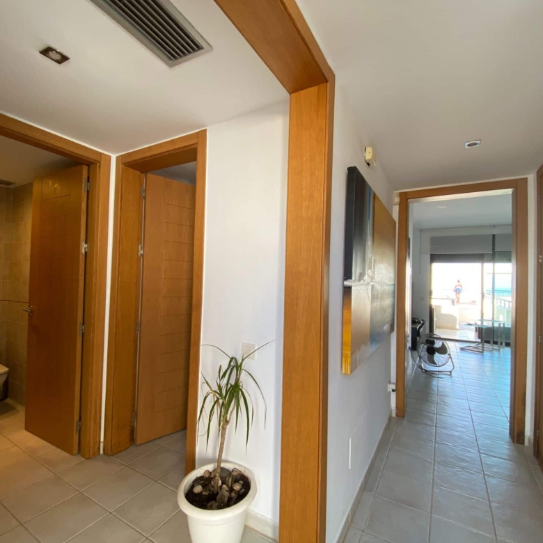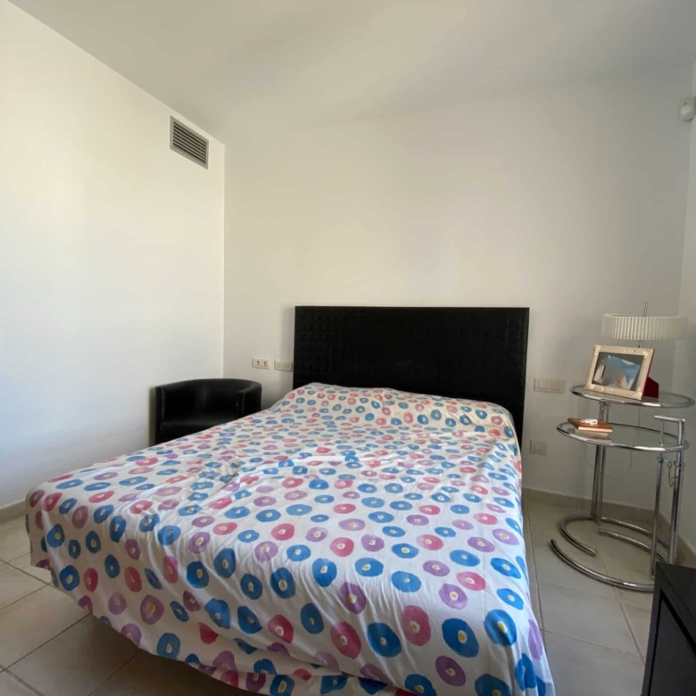 Located on the Playa Macenas Beach Resort, this is a fabulous, air-conditioned, 2 bedroom, 2 bathroom apartment with wonderful sea views. The Lounge and dining room are well proportioned. The lounge area has a sofa coffee table and 65″ Flat Screen TV (UK & Spanish channels). The dining area has a dining table with 4 chairs and a dresser. Patio doors from the lounge to the terrace. Terrace furniture includes a round table and 4 chairs – an ideal place for breakfast, lunch, and dinner!