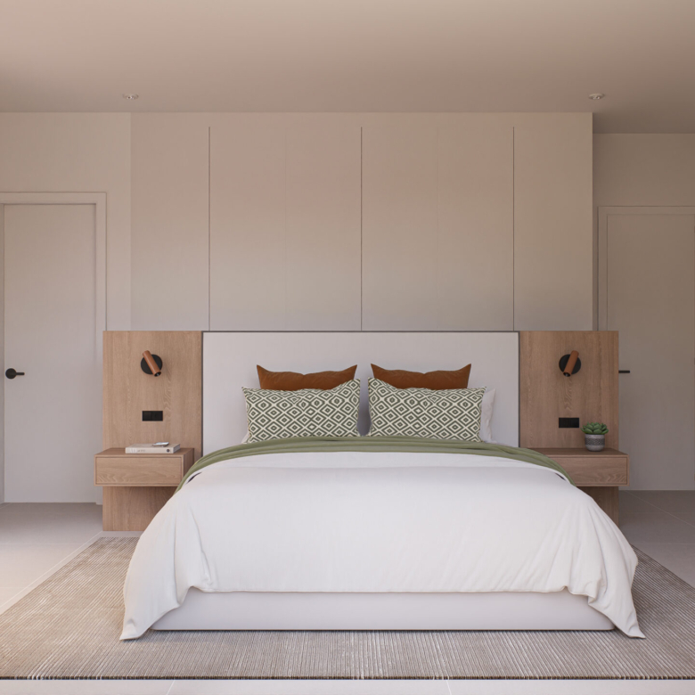 – Integrated white goods and bedroom wardrobes.