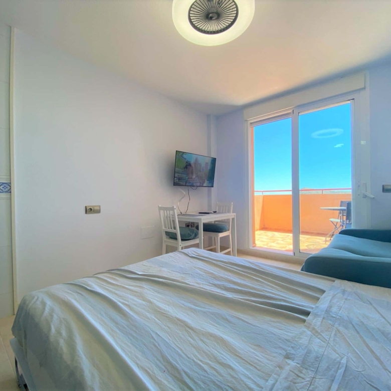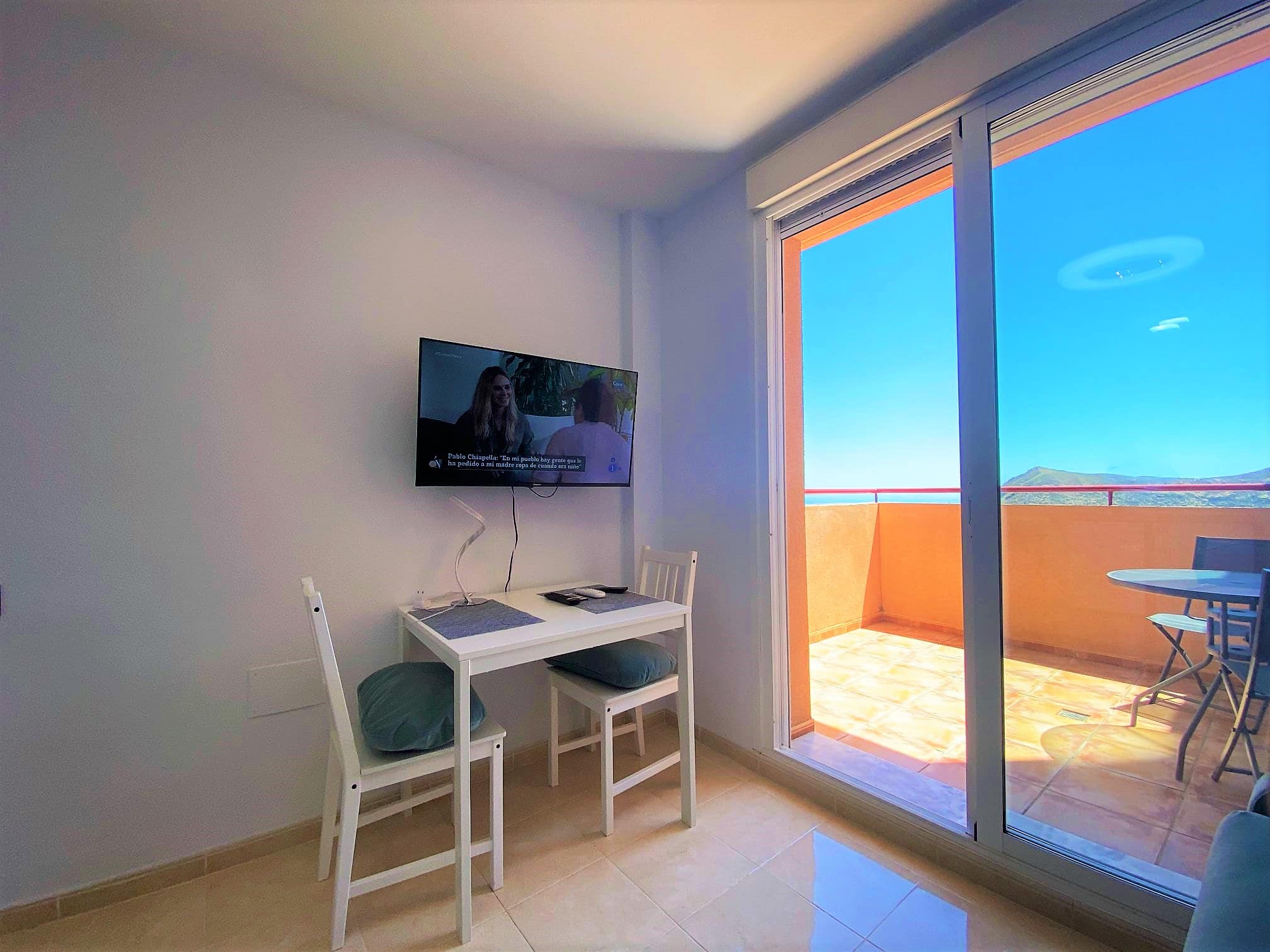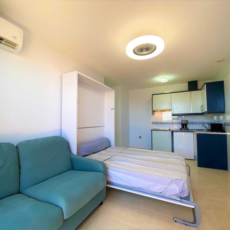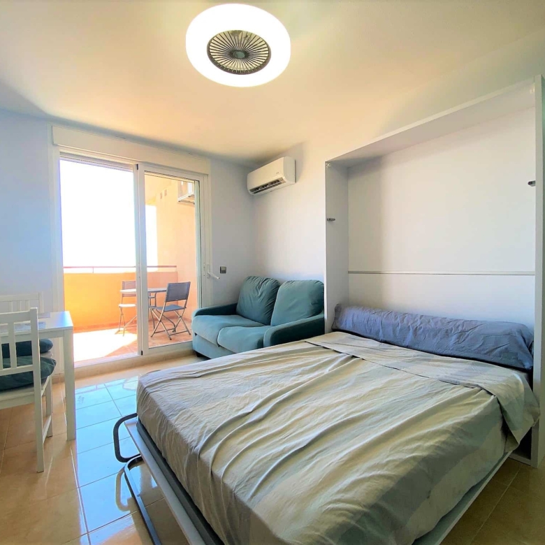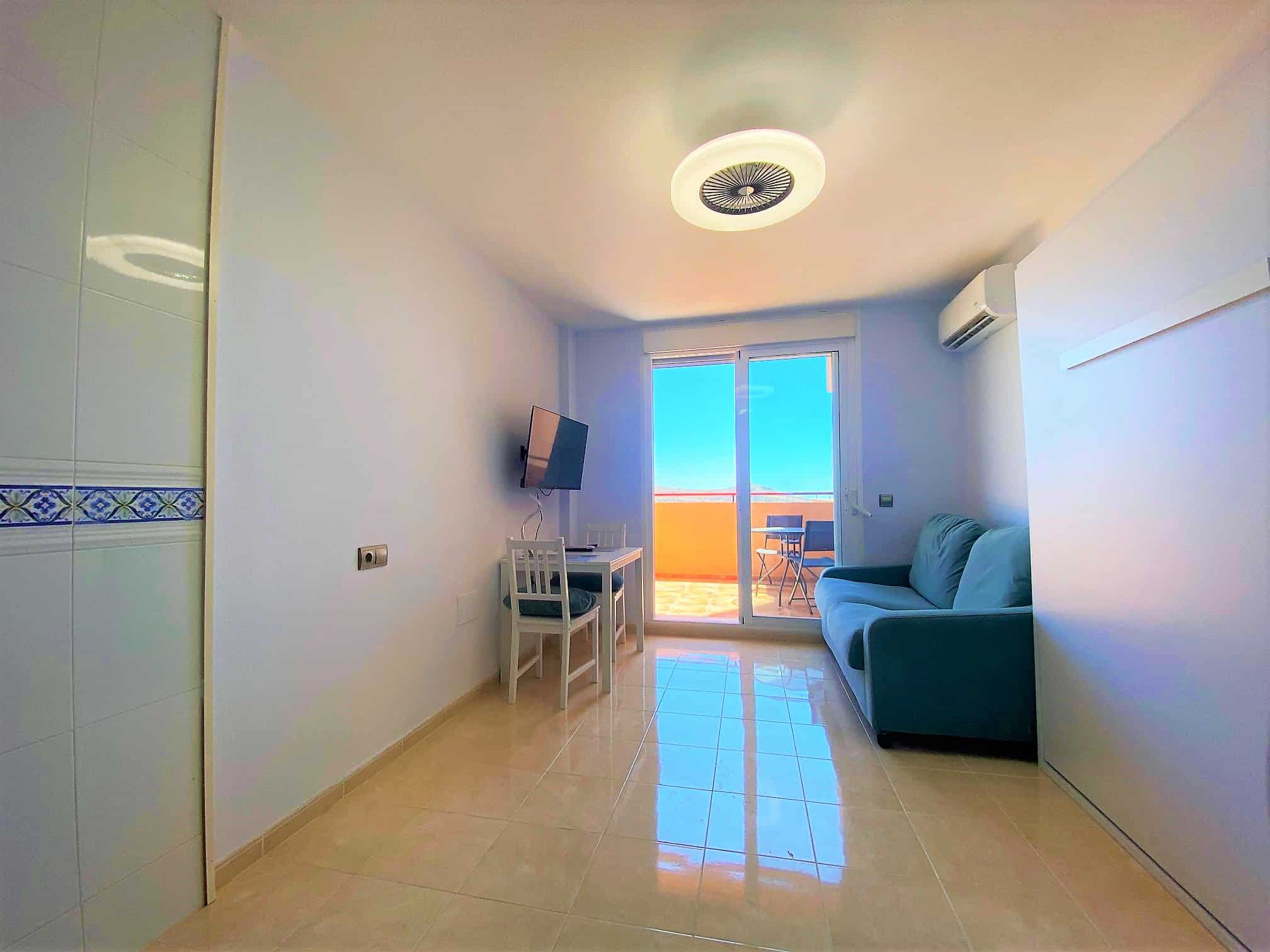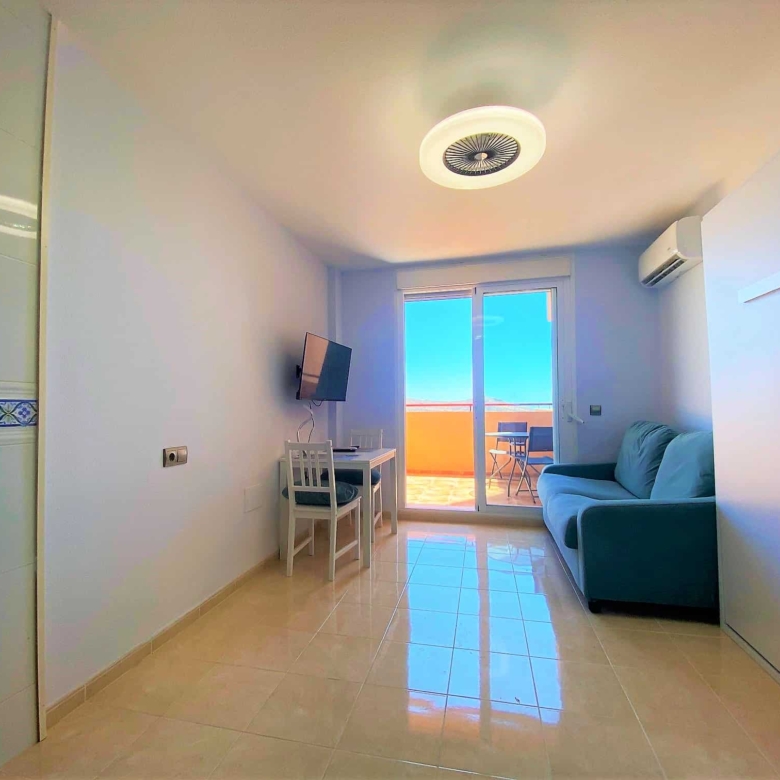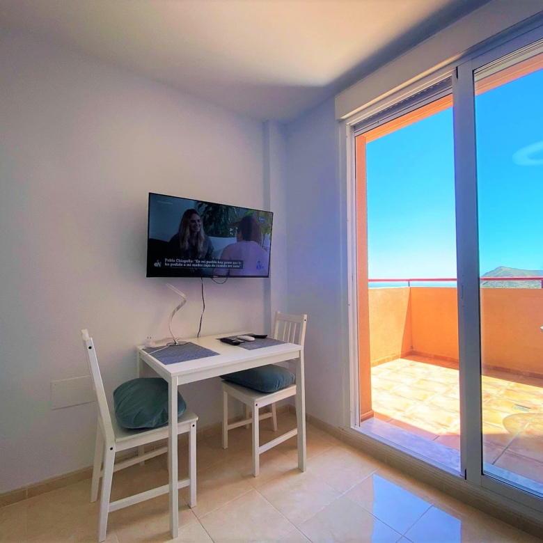 Beautiful spacious studio in La Envia Golf Resort urbanization area of Almeria with a large furnished terrace with breathtaking sea and mountain views. Close to bars and restaurants shops and the beach. Living room with comfortable seating and 45″ SMART HDTV with channels available in most languages. Ultra-fast fibre optic WI-FI. Air conditioning throughout. Well–equipped kitchen with dining table. Airy studio with fitted wardrobe and drawers, comfortable king-size bed in the living room with a sofa