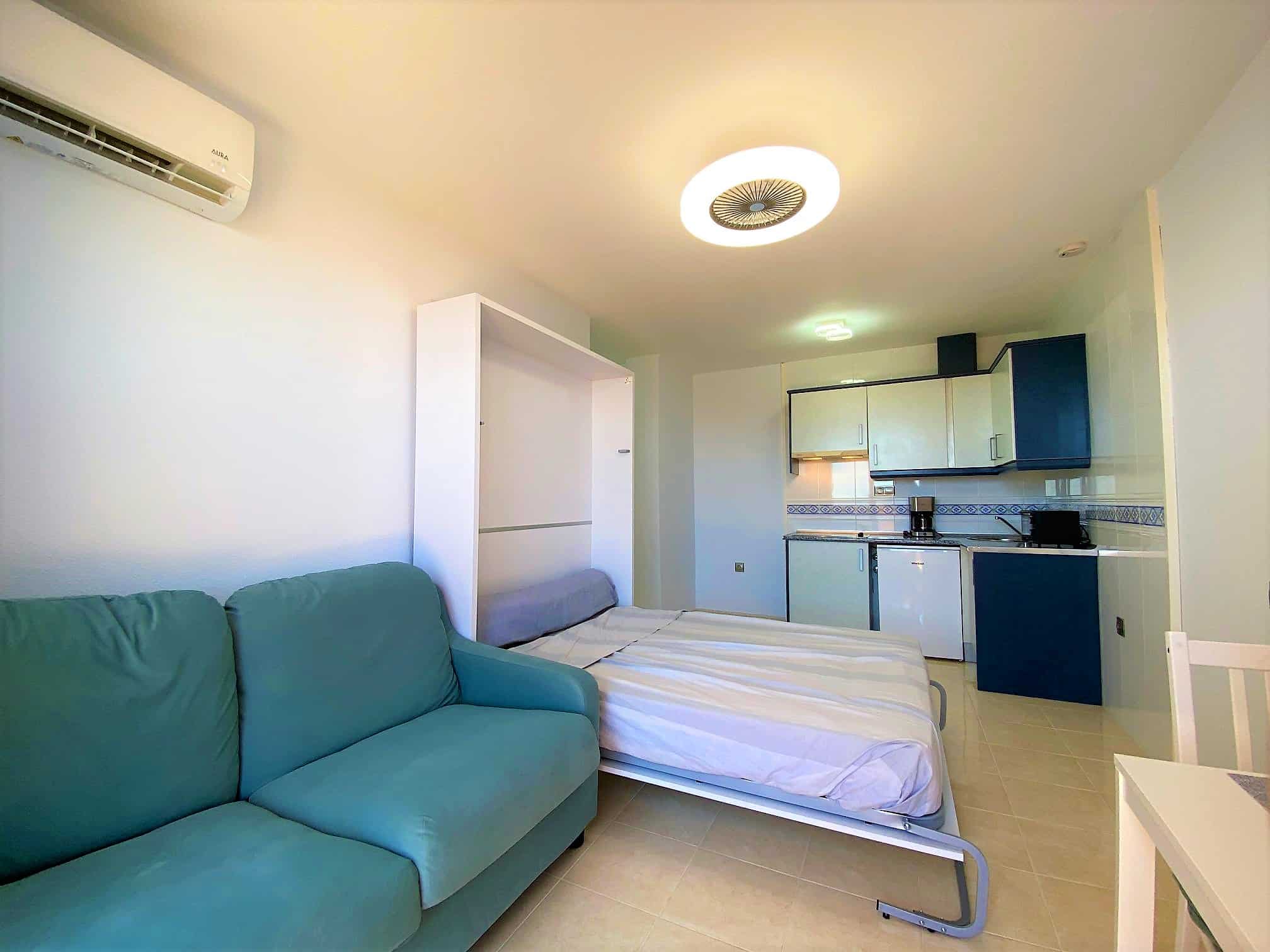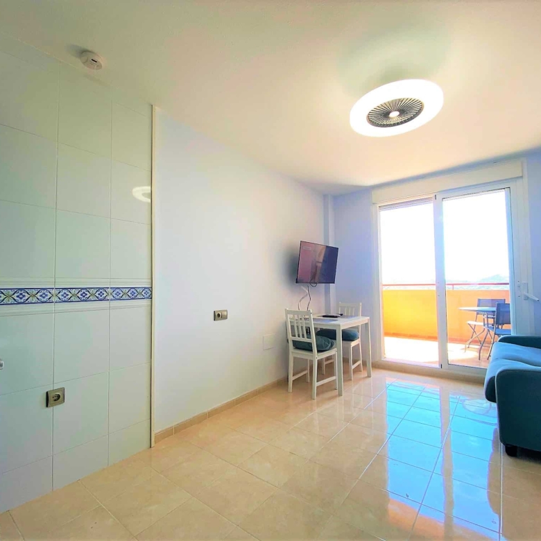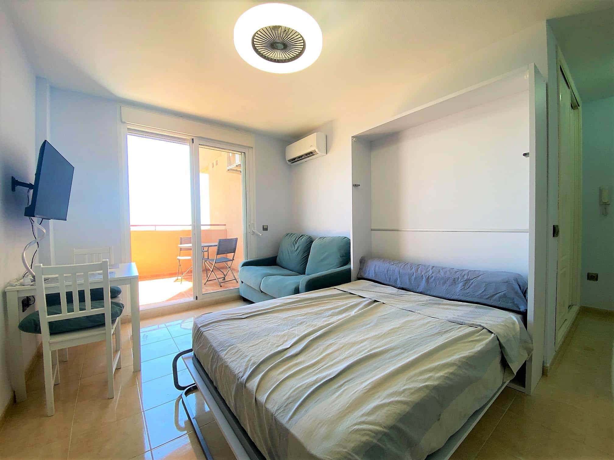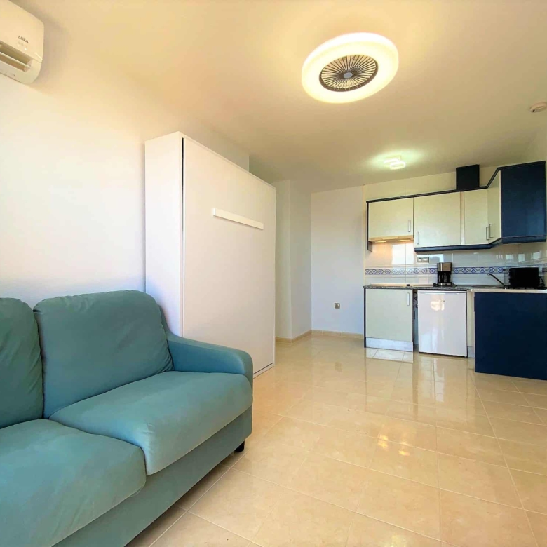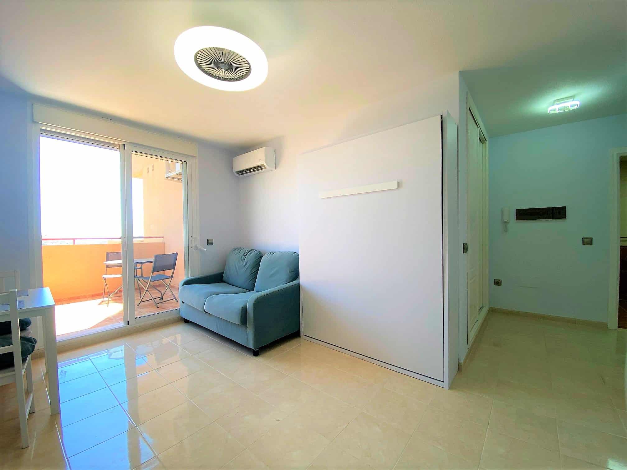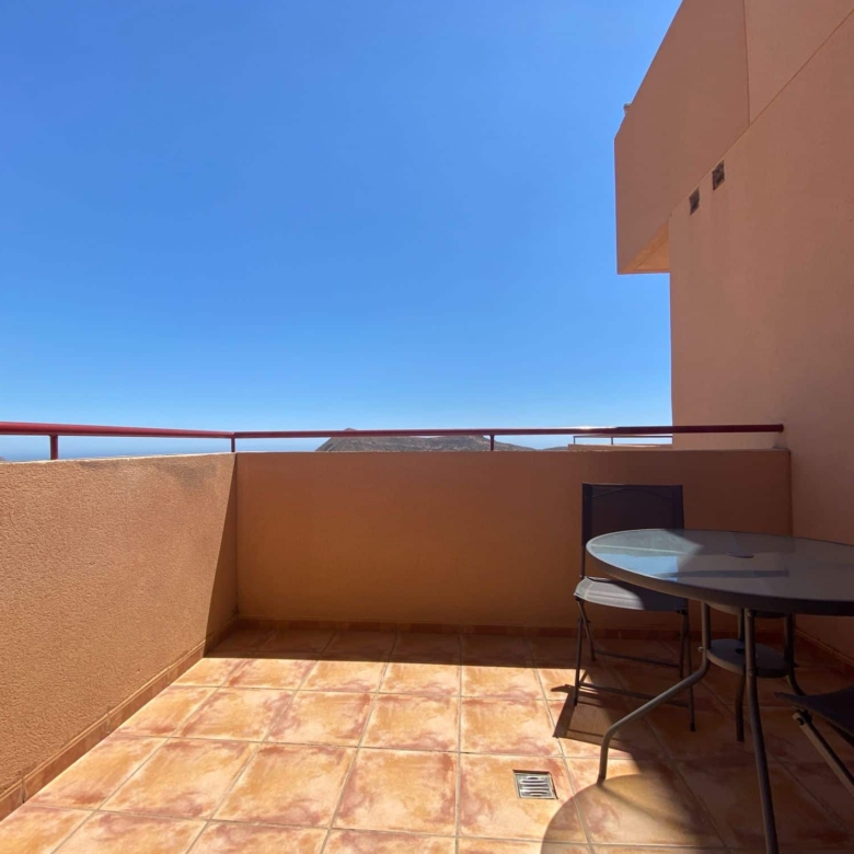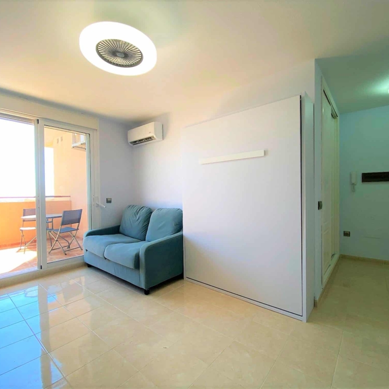 Beautiful spacious studio in La Envia Golf Resort urbanization area of Almeria with a large furnished terrace with breathtaking sea and mountain views. Close to bars and restaurants shops and the beach. Living room with comfortable seating and 45″ SMART HDTV with channels available in most languages. Ultra-fast fibre optic WI-FI. Air conditioning throughout. Well–equipped kitchen with dining table. Airy studio with fitted wardrobe and drawers, comfortable king-size bed in the living room with a sofa