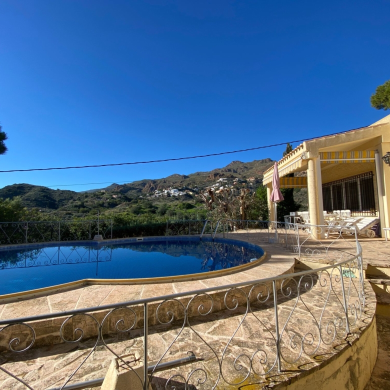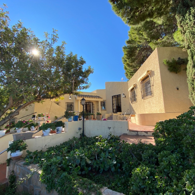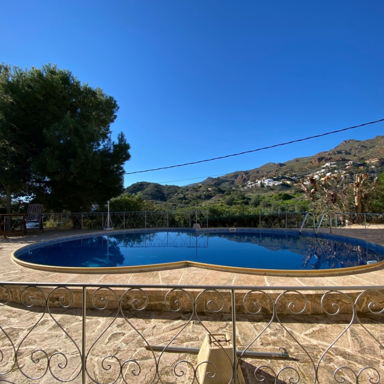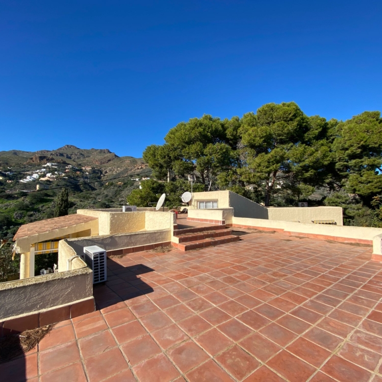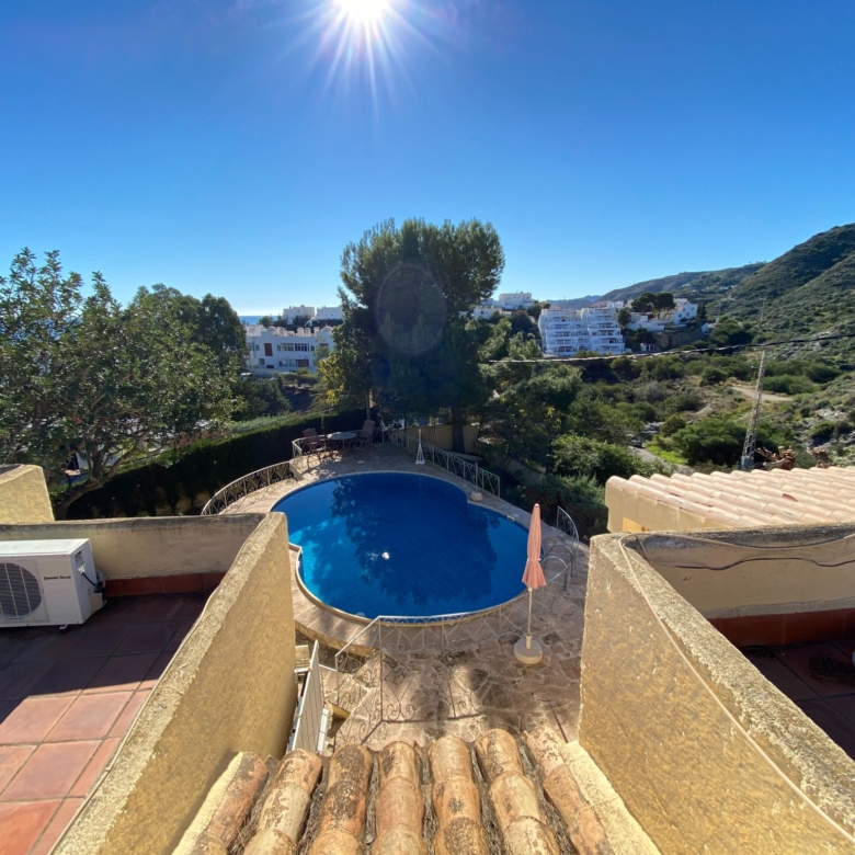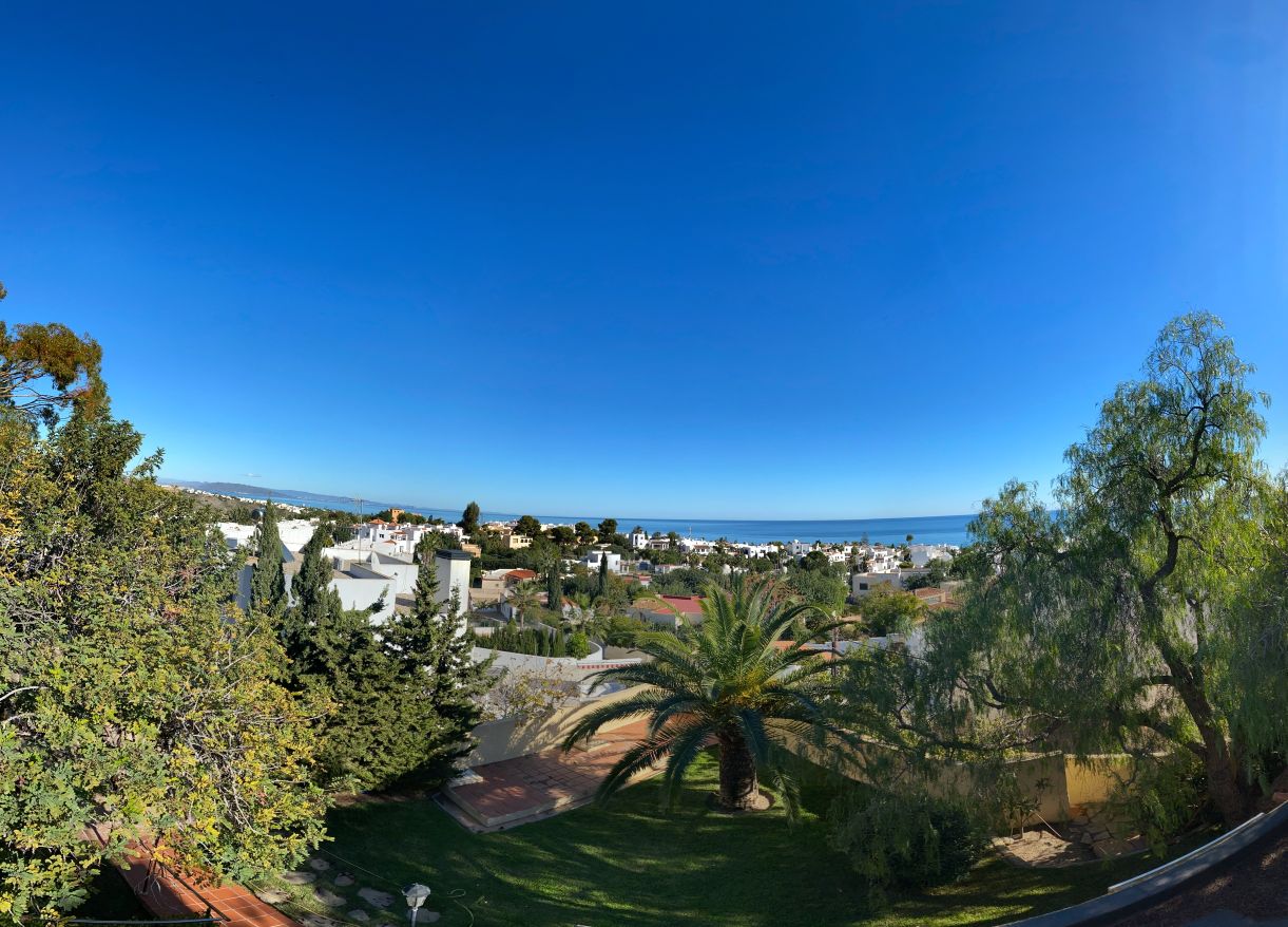 This a unique home with a guest apartment that benefits from spectacular panoramic views of the mountains and the Mediterranean Sea and is located in a unique residential area in the hills of Mojácar Spirit. The villa with 300 m2 is located on a beautiful plot of 1100 m2 against the mountains overlooking the Mediterranean. At the end of a small cul-de-sac, enter the property through automatic doors. There is a garage and private parking for three or four vehicles. Rock gardens surround the whole property with beautiful gardens. A large pool is located at the back of the villa. Inside there is a large dining room and living room with spectacular sea views from the side windows. From the dining room, you access an elegant and spacious kitchen. Outside, it has an intimate dining room surrounded by a beautiful garden. The first floor has two large bedrooms with access to a large terrace where you can enjoy the magnificent views again. The luxurious and spacious master bedroom benefits from a private bathroom, There is electricity and mains water, as well as a water tank and a well for the garden and the pool, internet, telephone and electric heating. It is a family home located in an ideal place with total privacy.